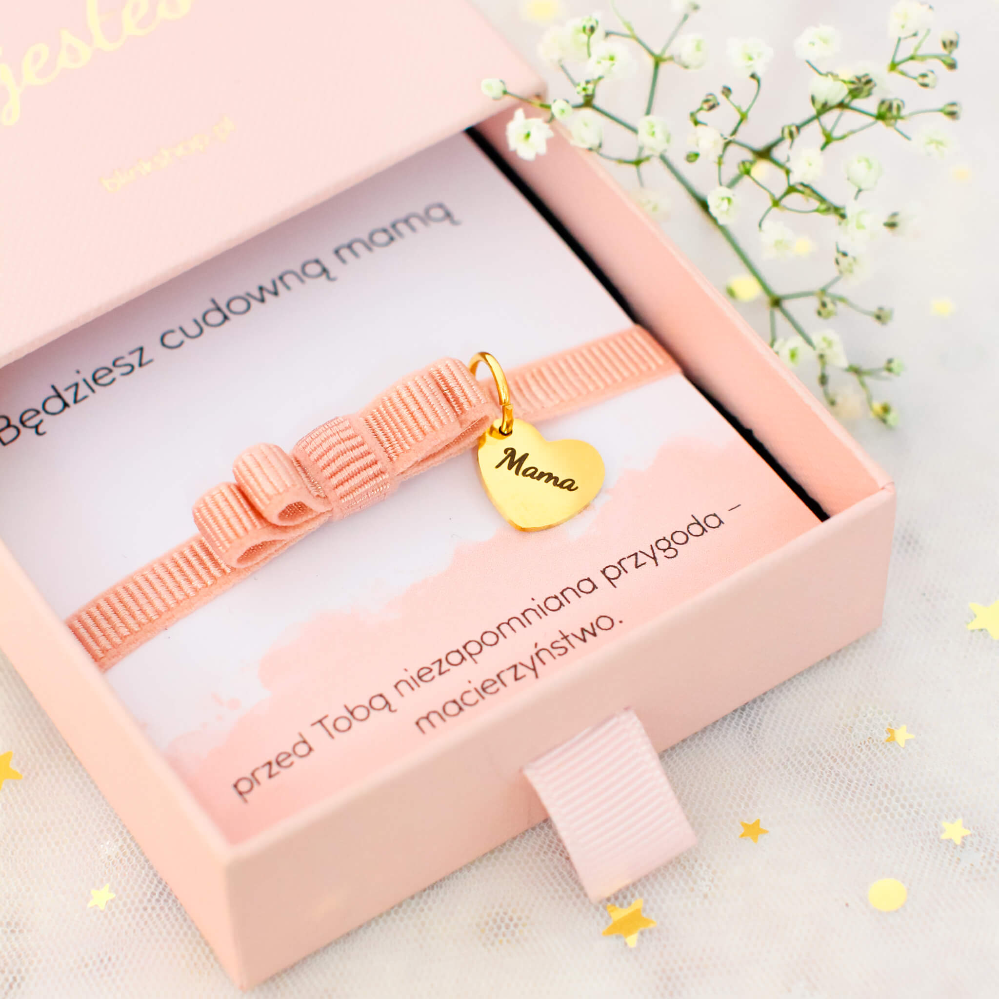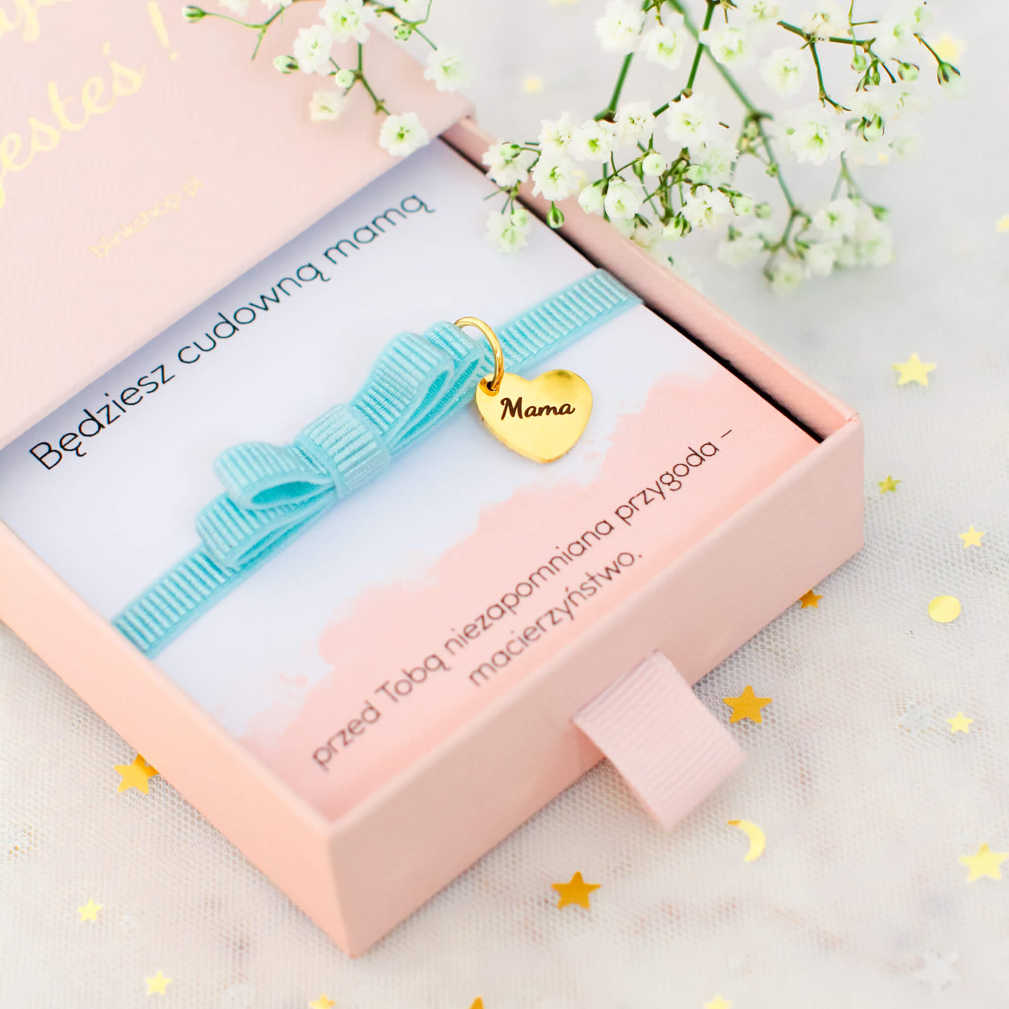 - wybierz swój ulubiony kolor wstążki spośród: czarny, czerwony, niebieski, pudrowy róż, biały, brudy róż . Wystarczy wpisać preferowany odcień w uwagach do zamówienia, a przygotujemy bransoletkę w wybranym przez Ciebie kolorze