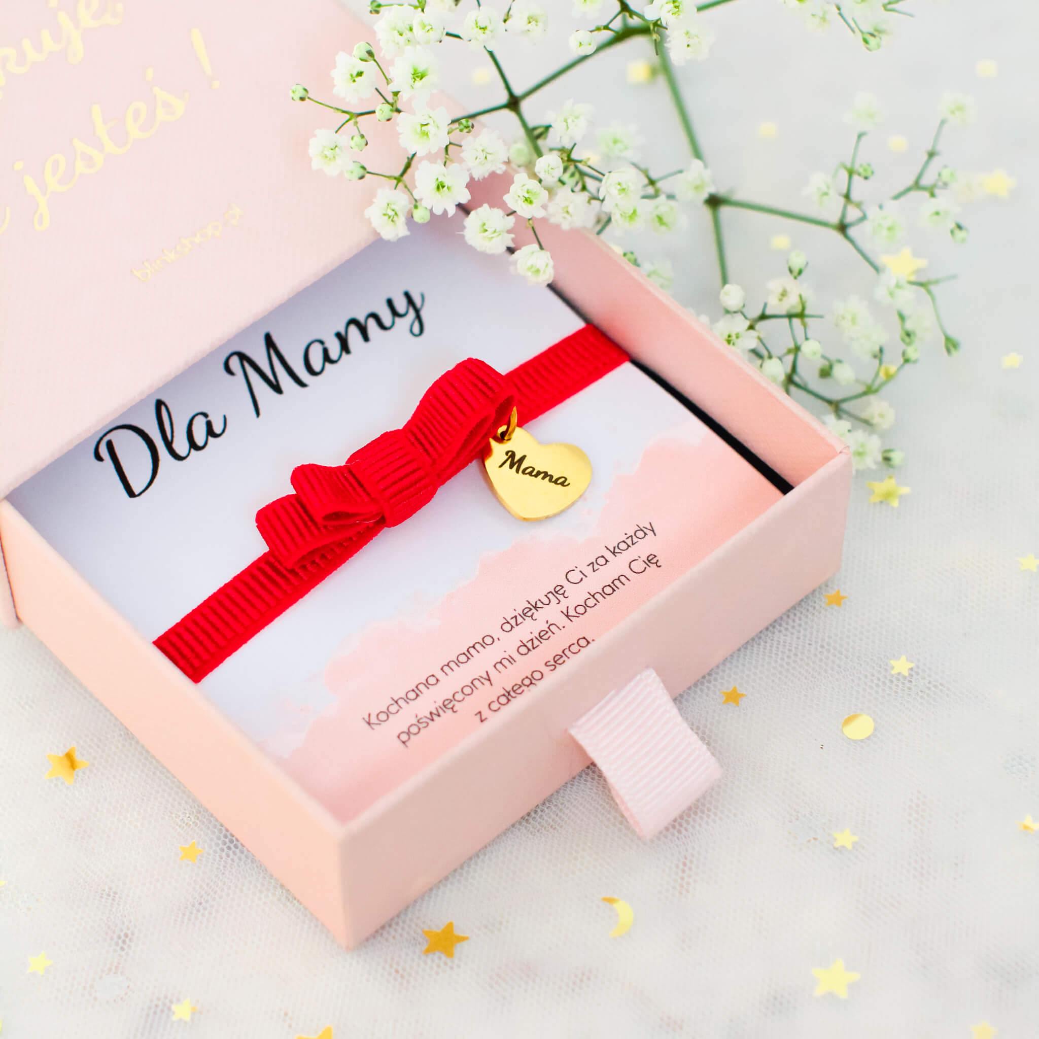 BRANSOLETKA NA WSTĄŻCE CZERWONA KOKARDKA SERCE Z GRAWEREM MAMA NA PREZENT