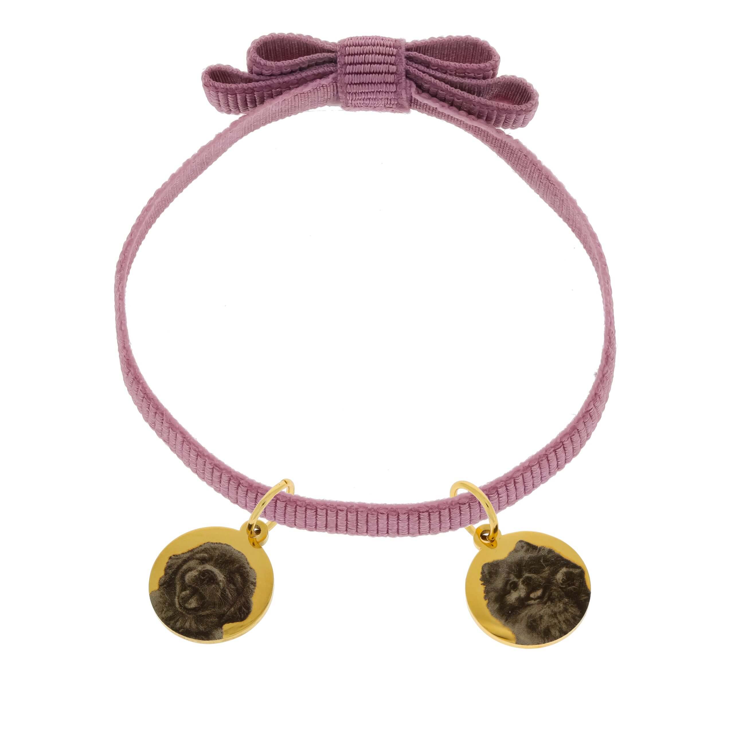 BRANSOLETKA NA WSTĄŻCE KOKARDKA Z GRAWEREM ZE ZDJĘCIA TWOICH PSÓW BRUDNY RÓŻ ZŁOTA