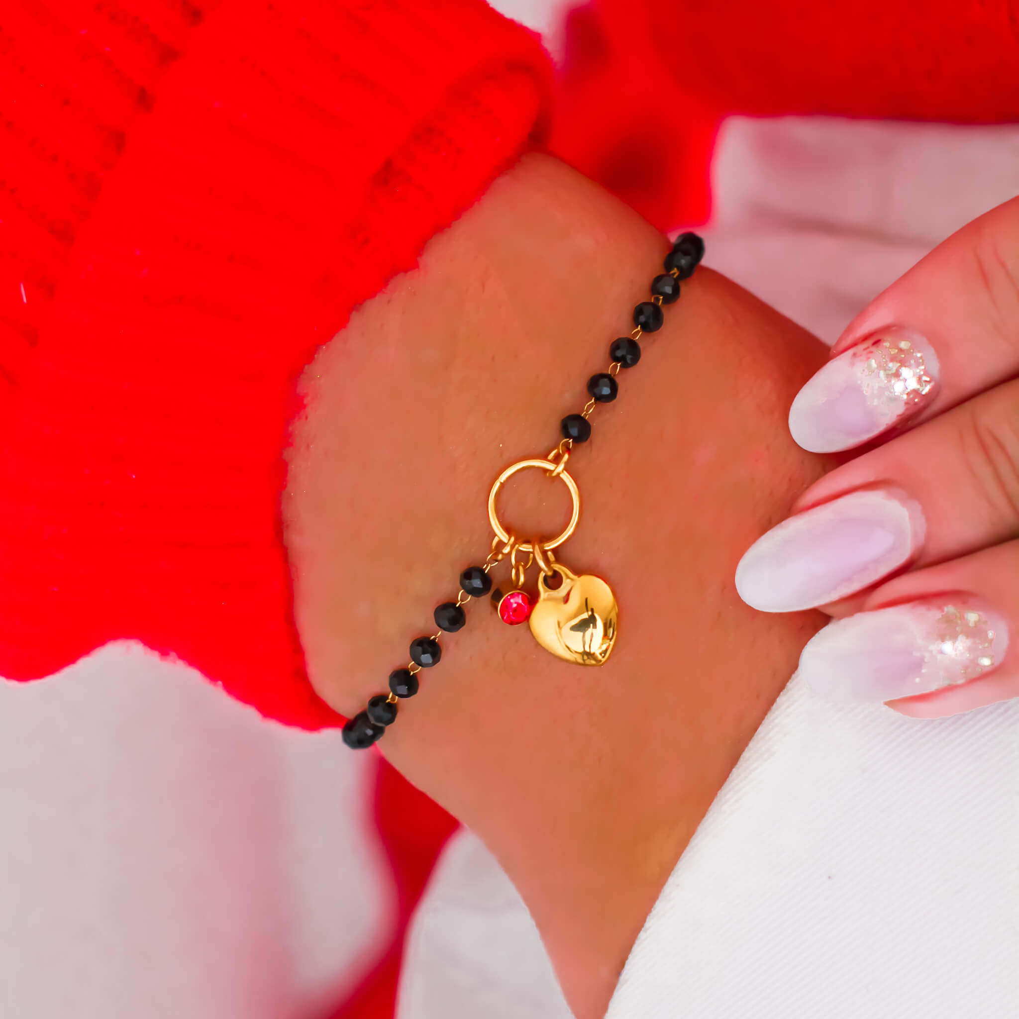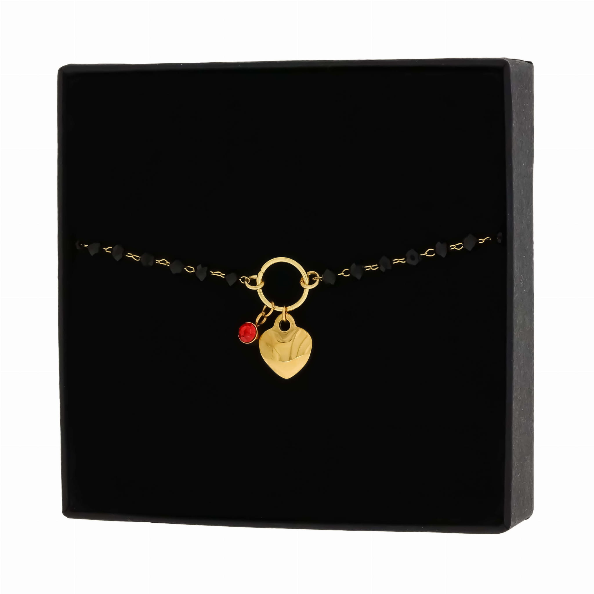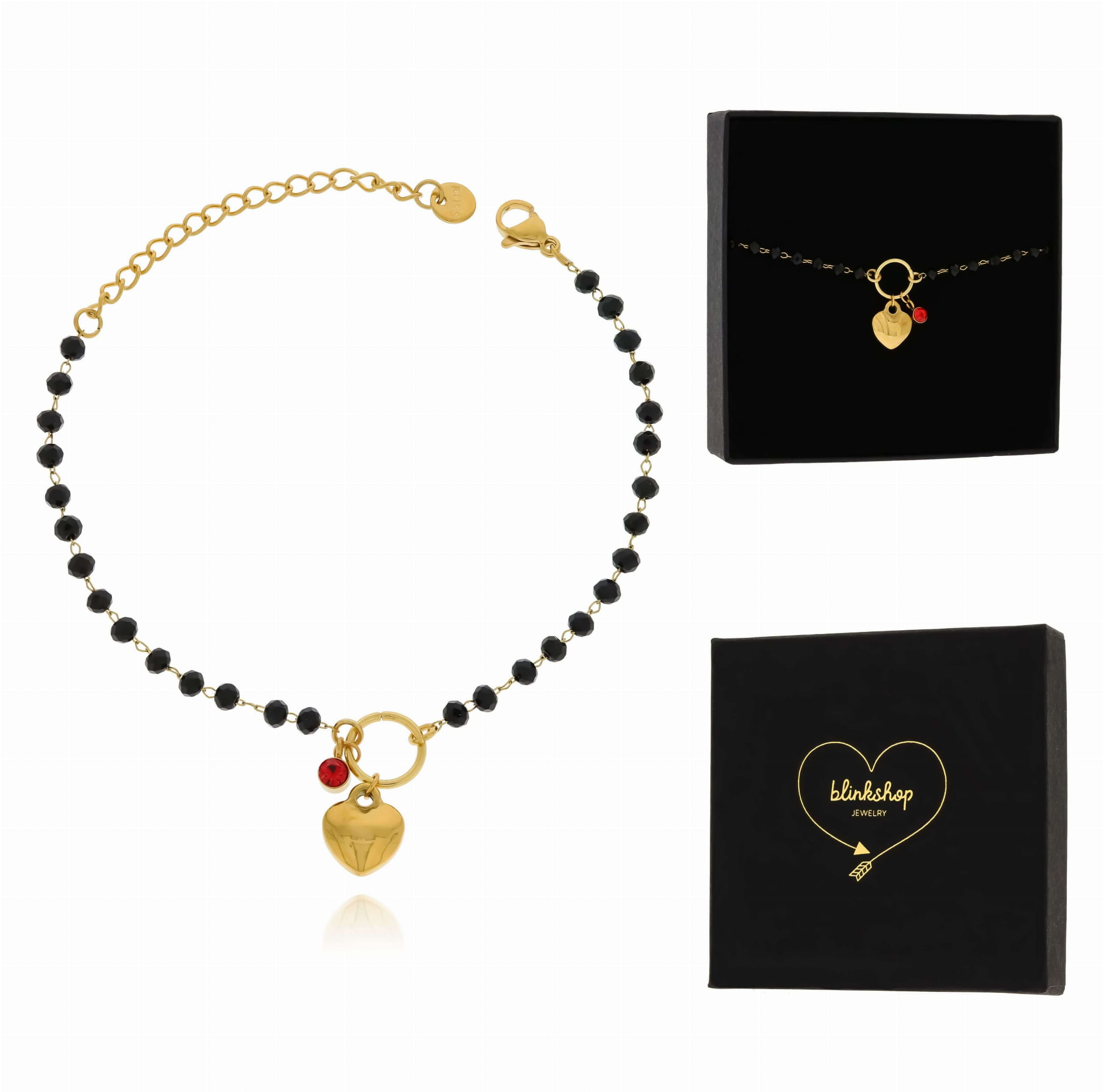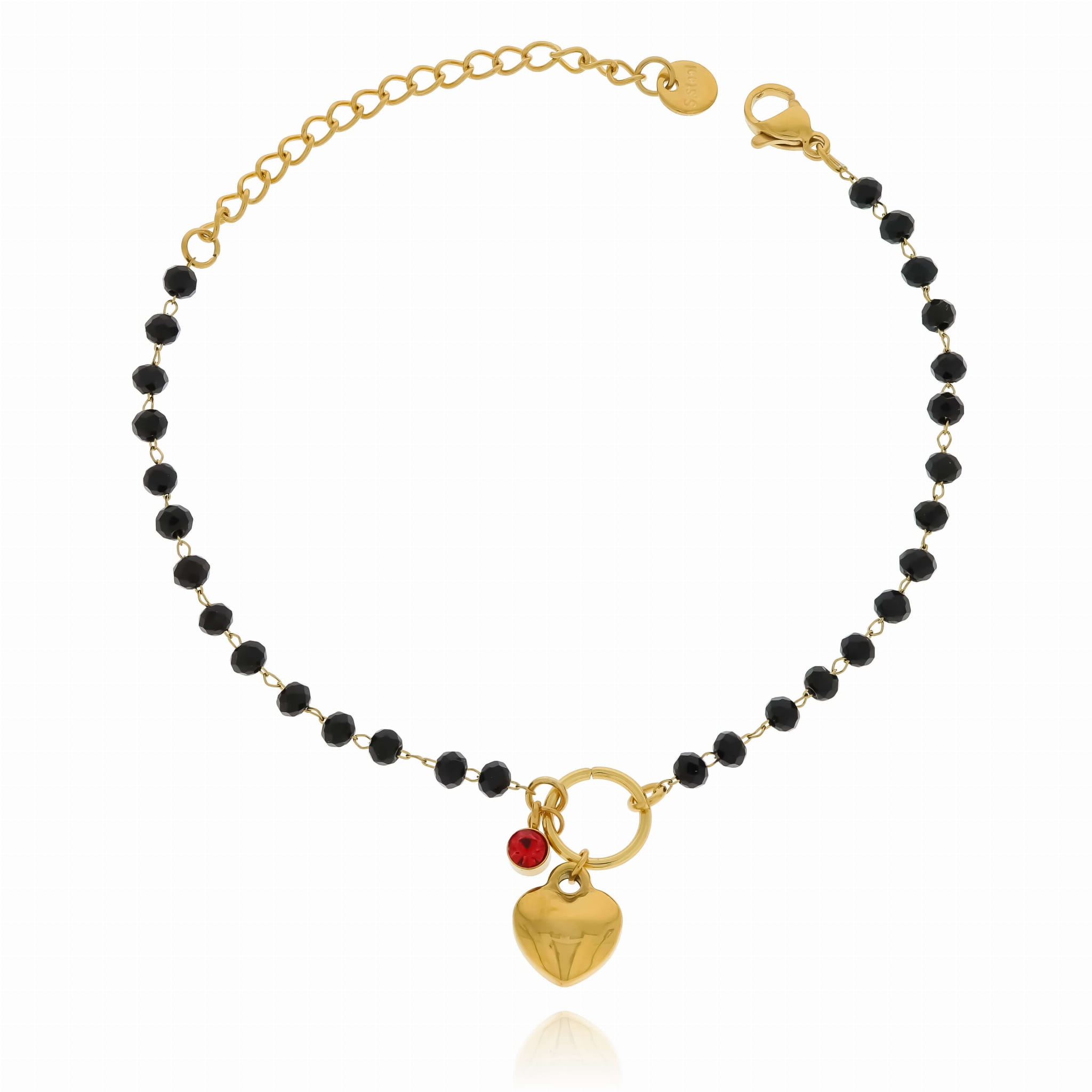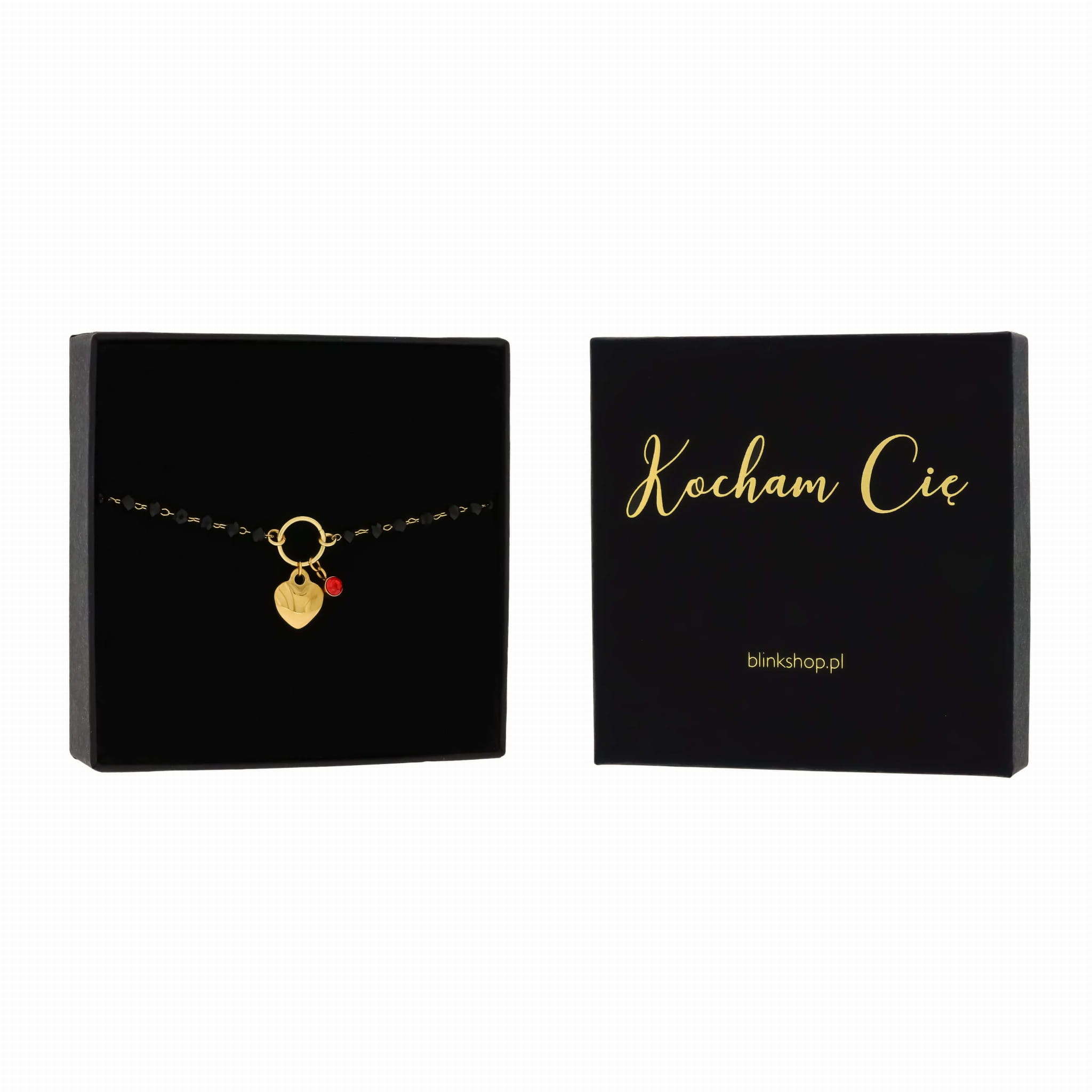BRANSOLETKA CZARNE KORALIKI SERDUSZKO Z GRANATEM STAL SZLACHETNA
