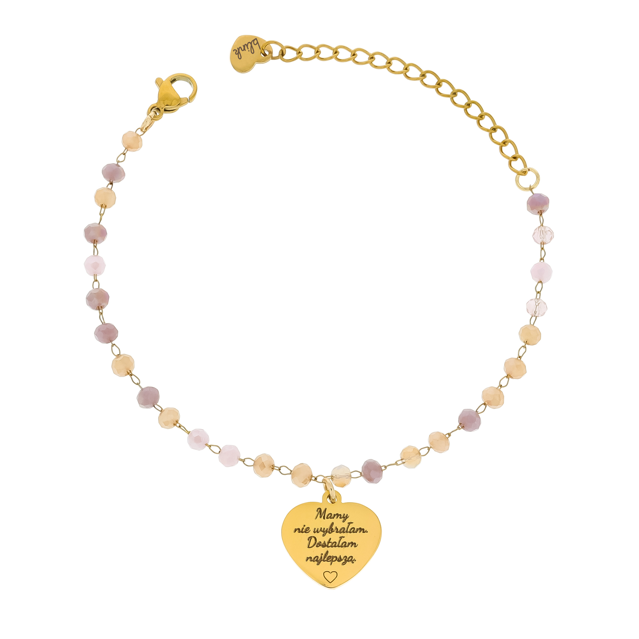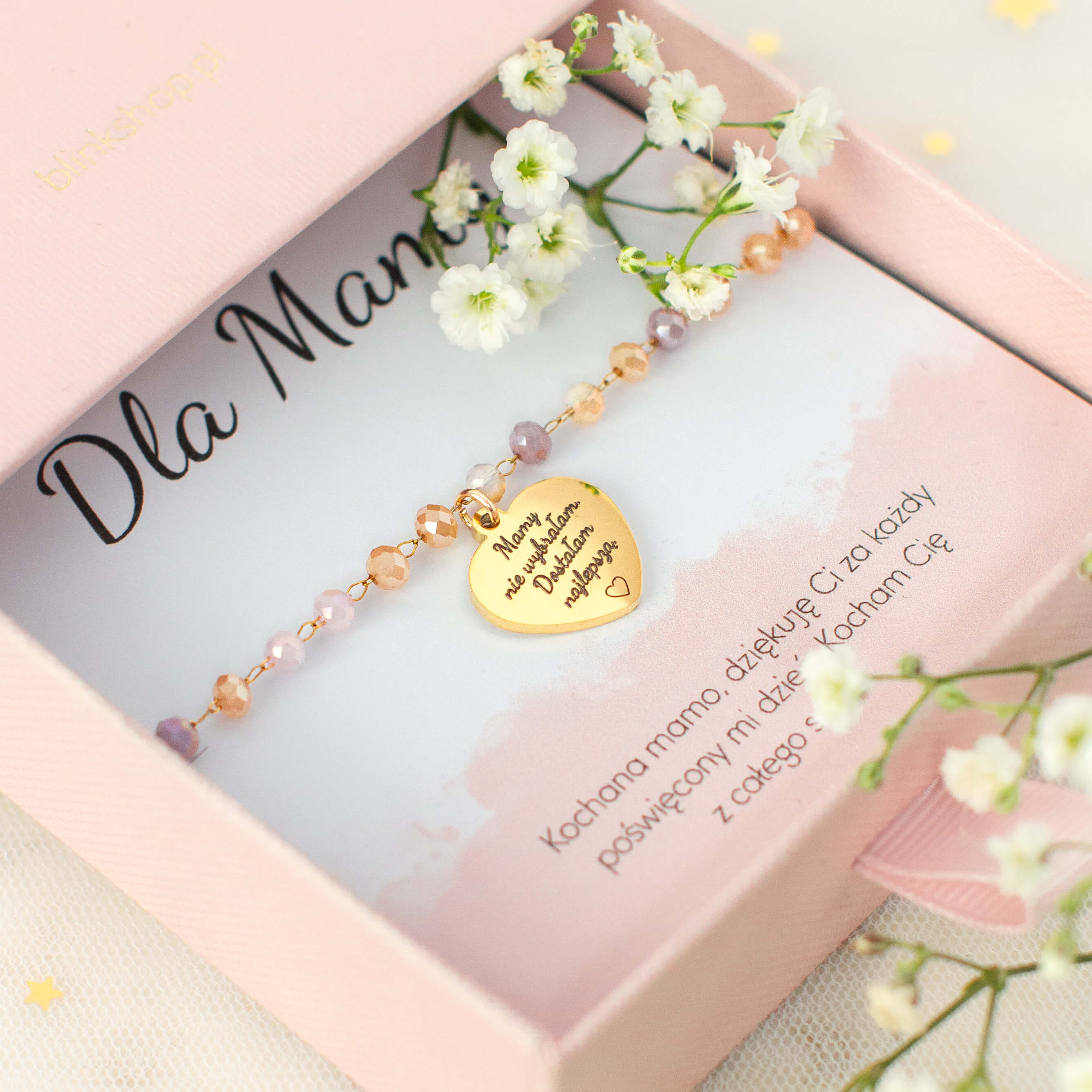Delikatne koraliki w subtelnych odcieniach połączone ze złotą zawieszką w kształcie serca tworzą elegancką i pełną emocji biżuterię. Grawer „Mamy nie wybrałam. Dostałam najlepszą.” sprawia, że jest to prezent pełen miłości i wdzięczności.