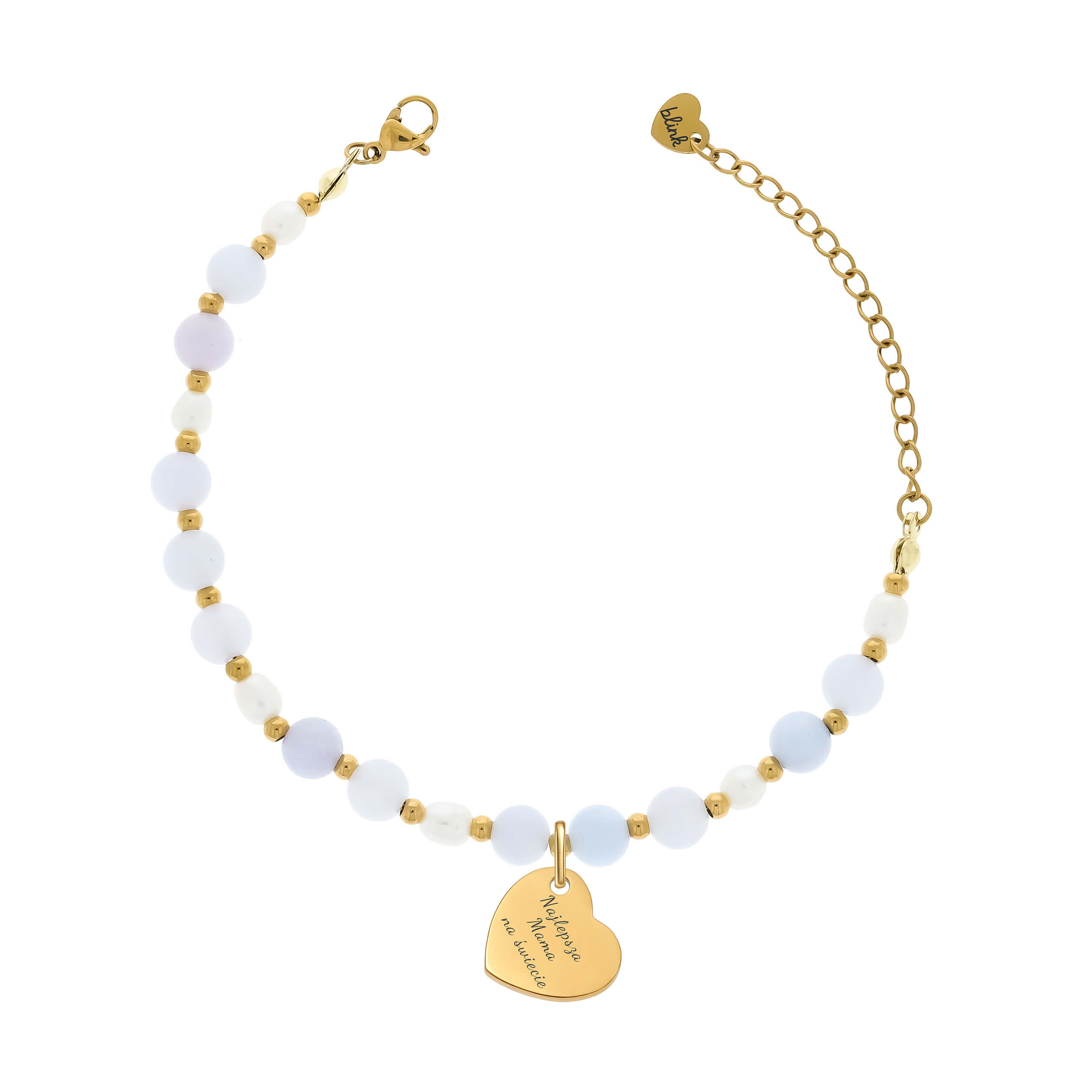Ta wyjątkowa bransoletka zachwyca subtelną kolorystyką i elegancją. Naturalny jadeit w delikatnych, pastelowych odcieniach połączony z klasyczną perłą hodowlaną tworzy harmonijną i lekką kompozycję. Całość dopełnia pozłacana zawieszka w kształcie serca z grawerem „Najlepsza mama na świecie”.