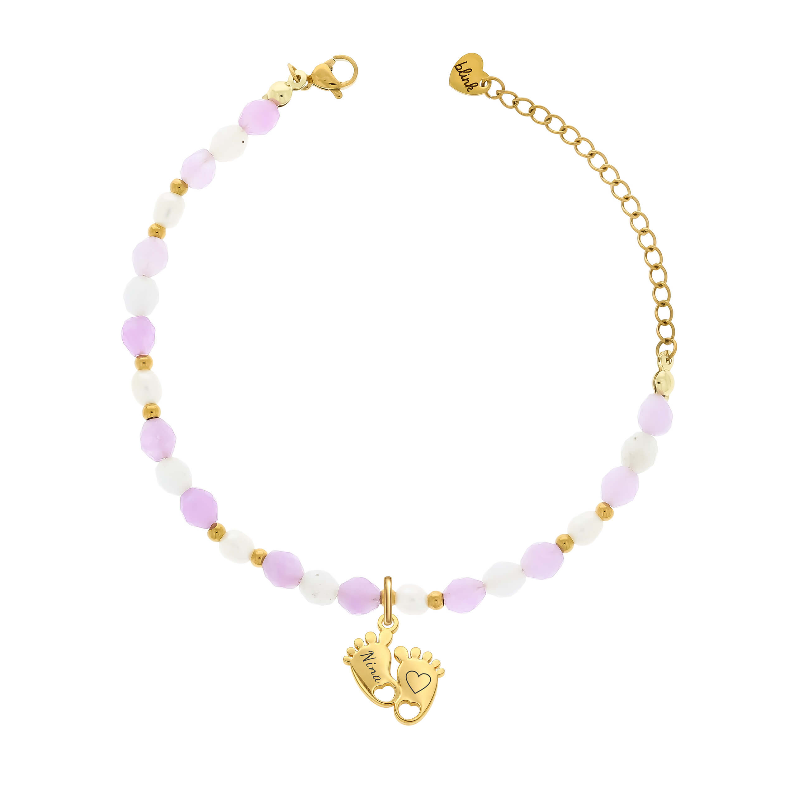 Subtelna i wyjątkowa bransoletka dla mamy wykonana z naturalnego jadeitu lawendowego i perły hodowlanej to piękna pamiątka narodzin dziecka. Centralnym elementem są pozłacane zawieszki w kształcie dziecięcych stópek z grawerem imienia, które nadają biżuterii osobisty i emocjonalny charakter.