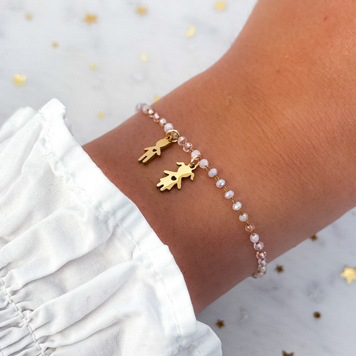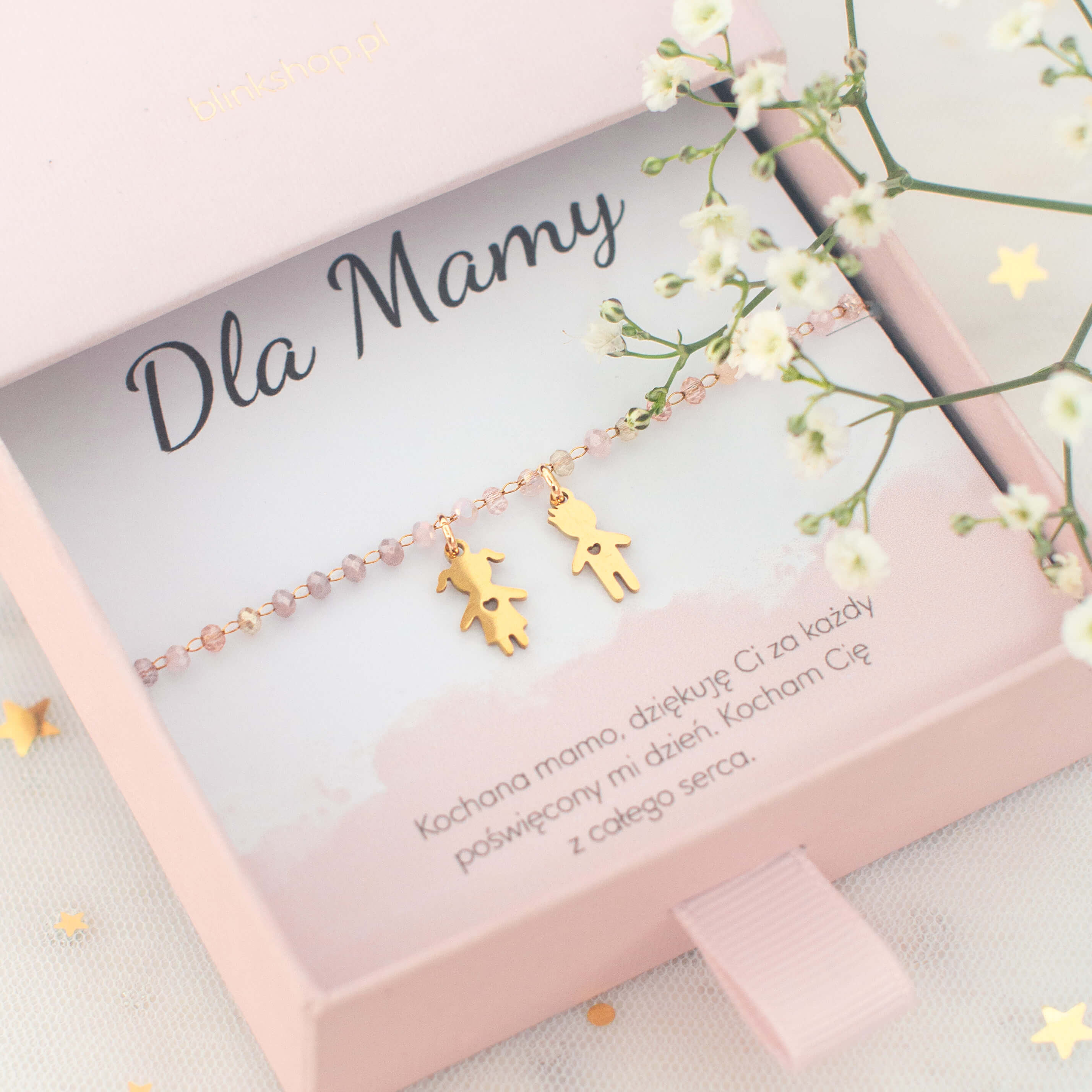 Wyjątkowa bransoletka stworzona z myślą o mamie. Delikatny łańcuszek ozdobiony subtelnymi, szklanymi koralikami w pastelowych odcieniach tworzy lekką i kobiecą kompozycję. Najważniejszym elementem są jednak zawieszki w kształcie dzieci – symbol miłości, bliskości i tego, co dla mamy najcenniejsze.