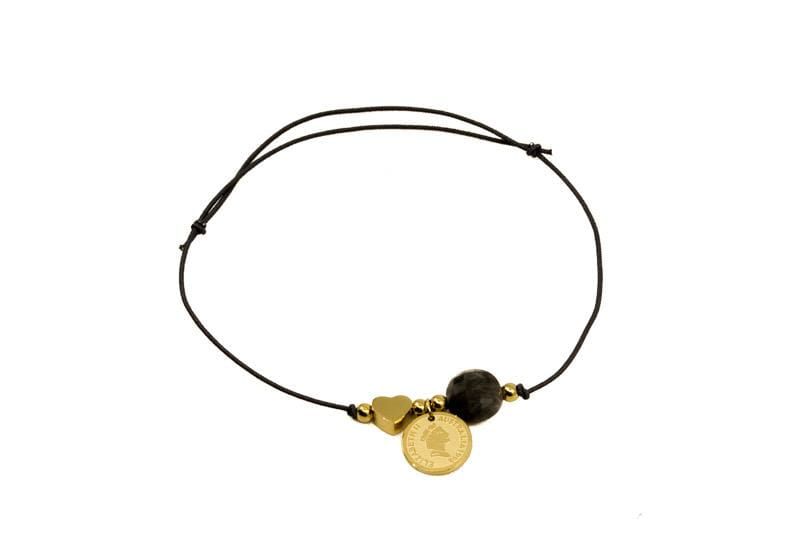 Bransoletka ze stali szlachetnej 316L w kolorze złotym w subtelny sposób doda szyku każdej stylizacji. Bransoletka regulowana na gumce. Bransoletka z motywem monety z podobizną królowej Elżbiety, rewers w kolorze złotym - wysoki połysk. Dodatkowe ozdoby to serce i kamień w odcieniu szarości. Każdy kamień ma inny odcień szarości więc ich wybarwienie może się różnić delikatnie od tych na zdjęciu.