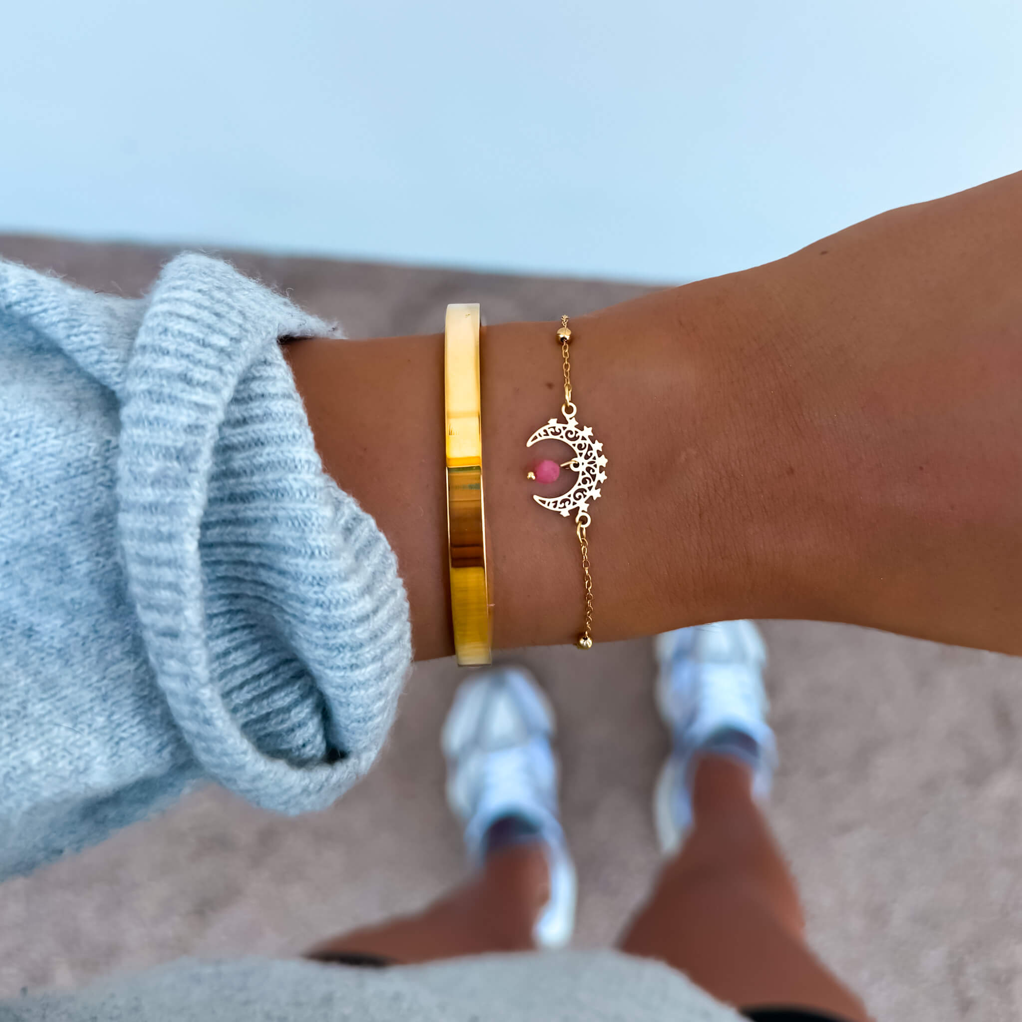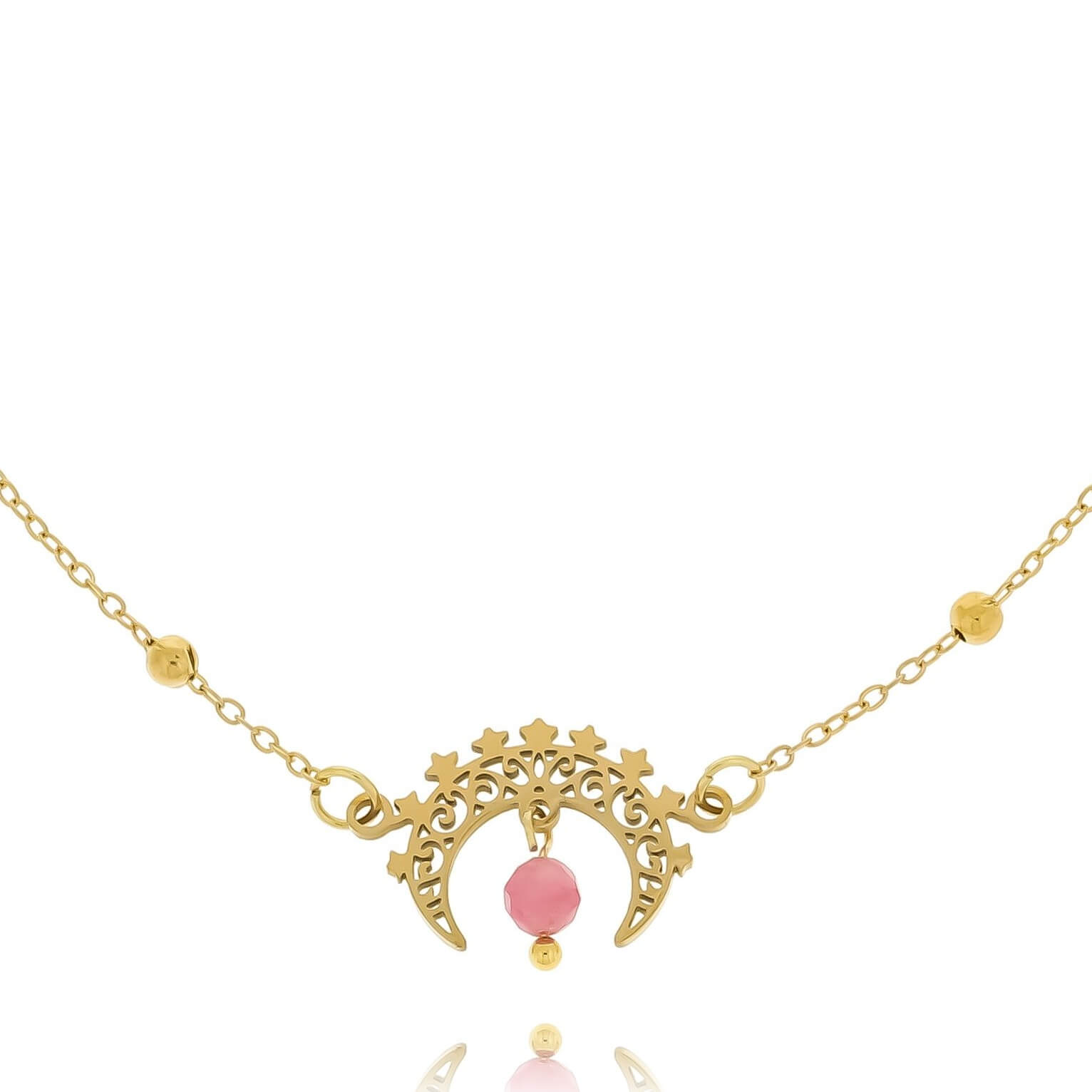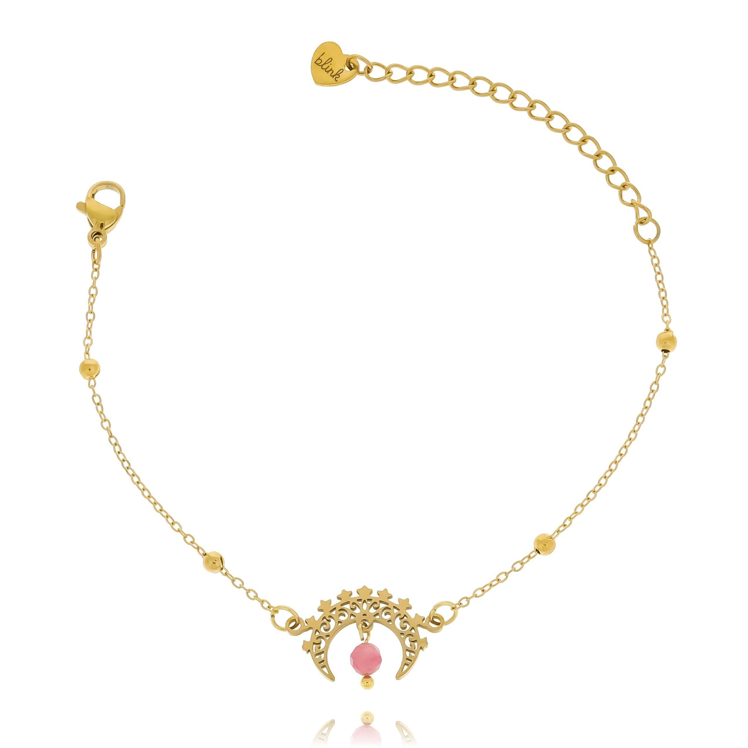 BRANSOLETKA KWARC RÓŻOWY ZE STALI CHIRURGICZNEJ POZŁACANA 316L AŻUROWY KSIĘŻYC