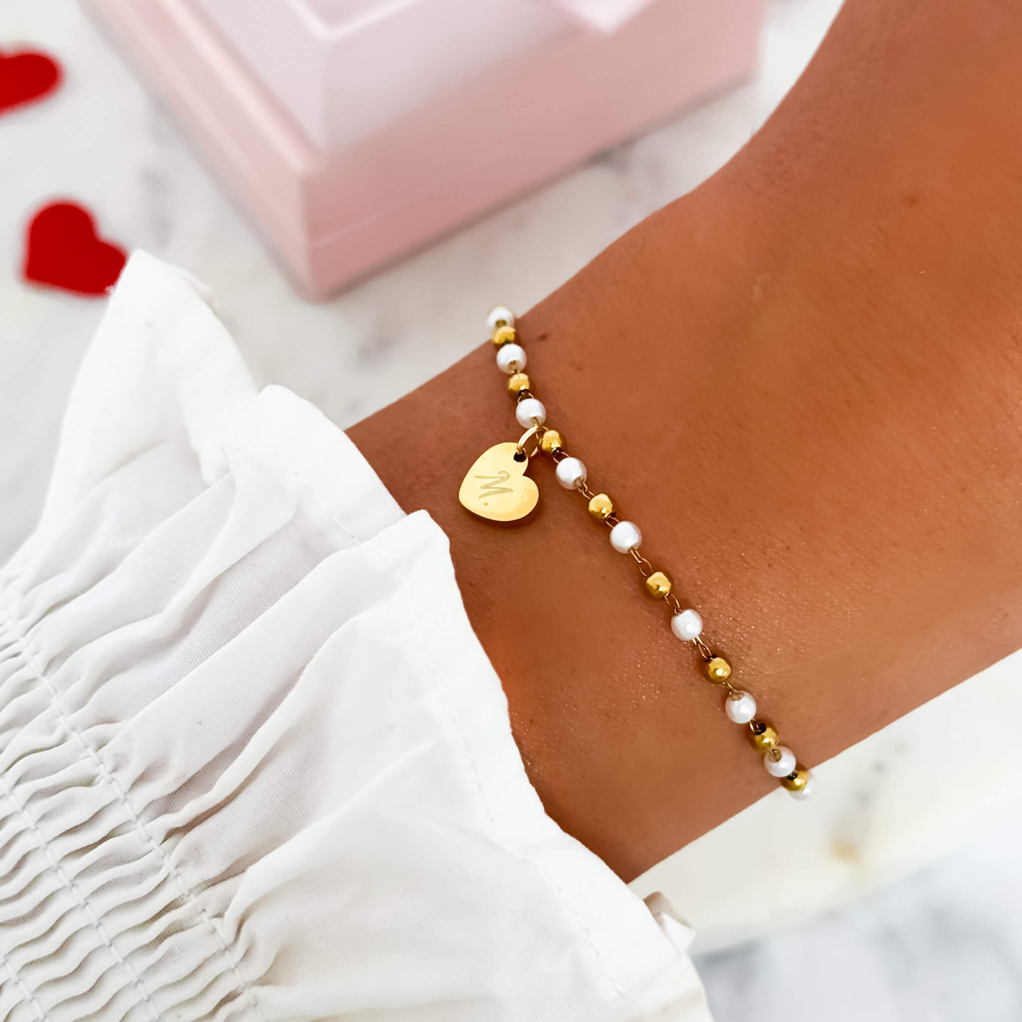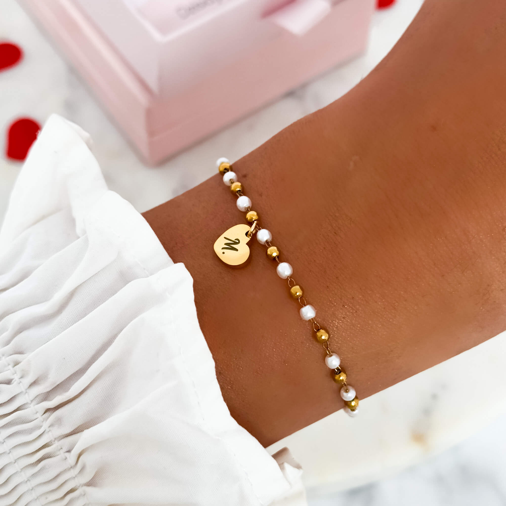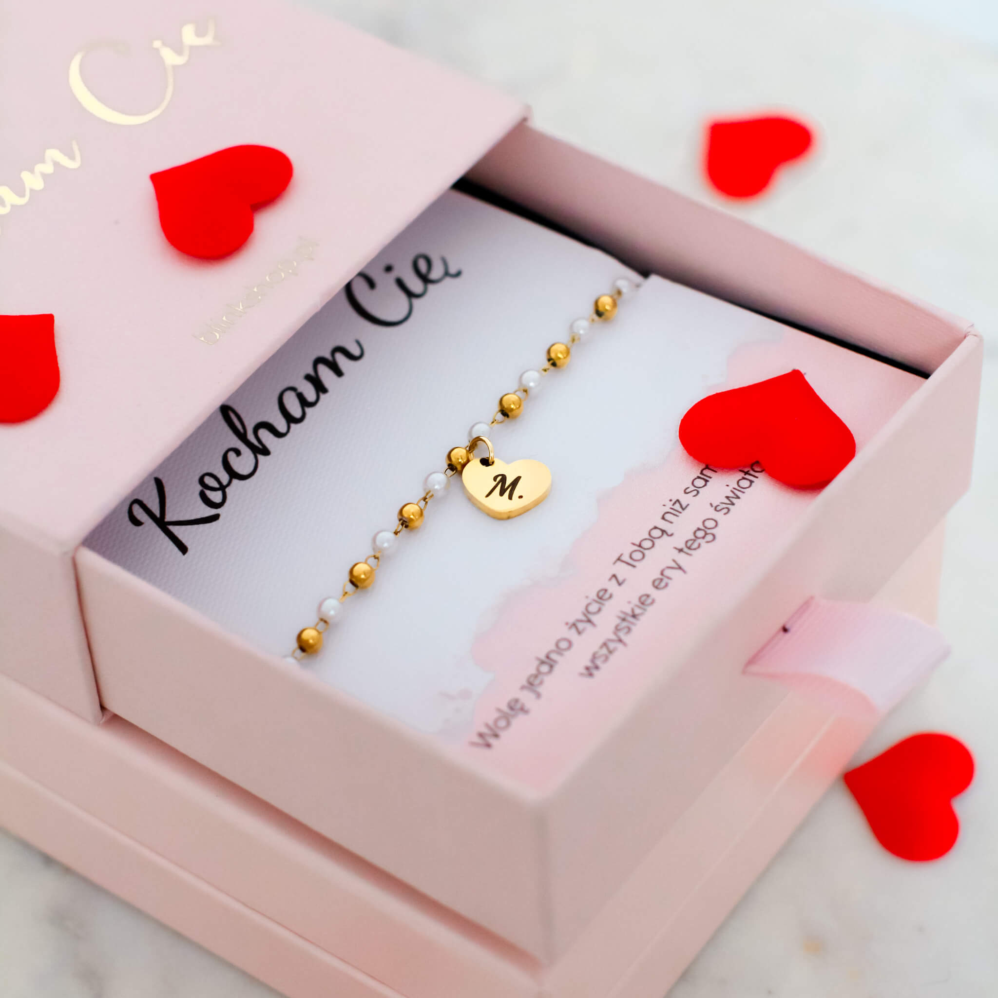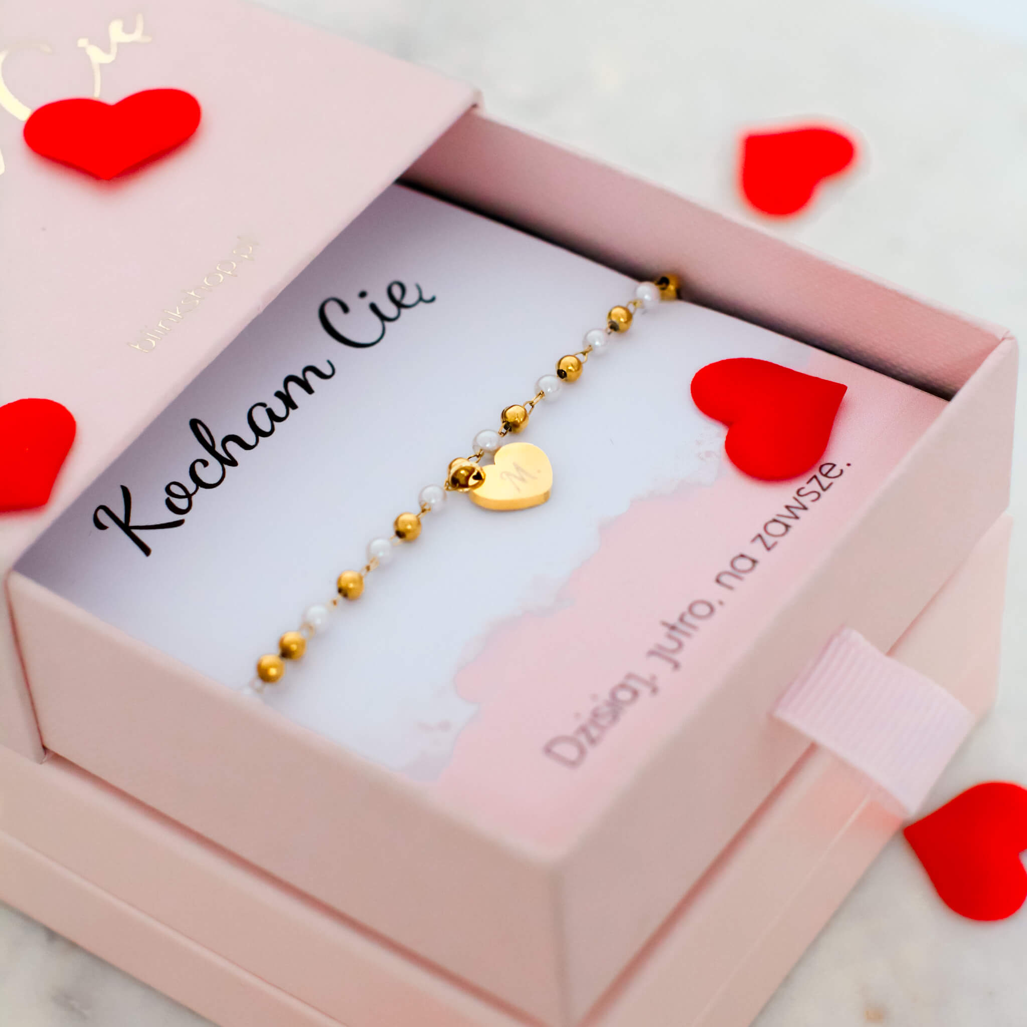 Ta elegancka bransoletka to wyjątkowy sposób, by wyrazić swoją miłość najważniejszej osobie w Twoim życiu – Twojej ukochanej. Wykonana z pozłacanej stali szlachetnej, ozdobiona delikatnymi koralikami, łączy w sobie klasyczny styl i nowoczesną elegancję. Zawieszka w kształcie serca z grawerem inicjału sprawia, że ten prezent staje się niezwykle osobisty i pełen emocji.