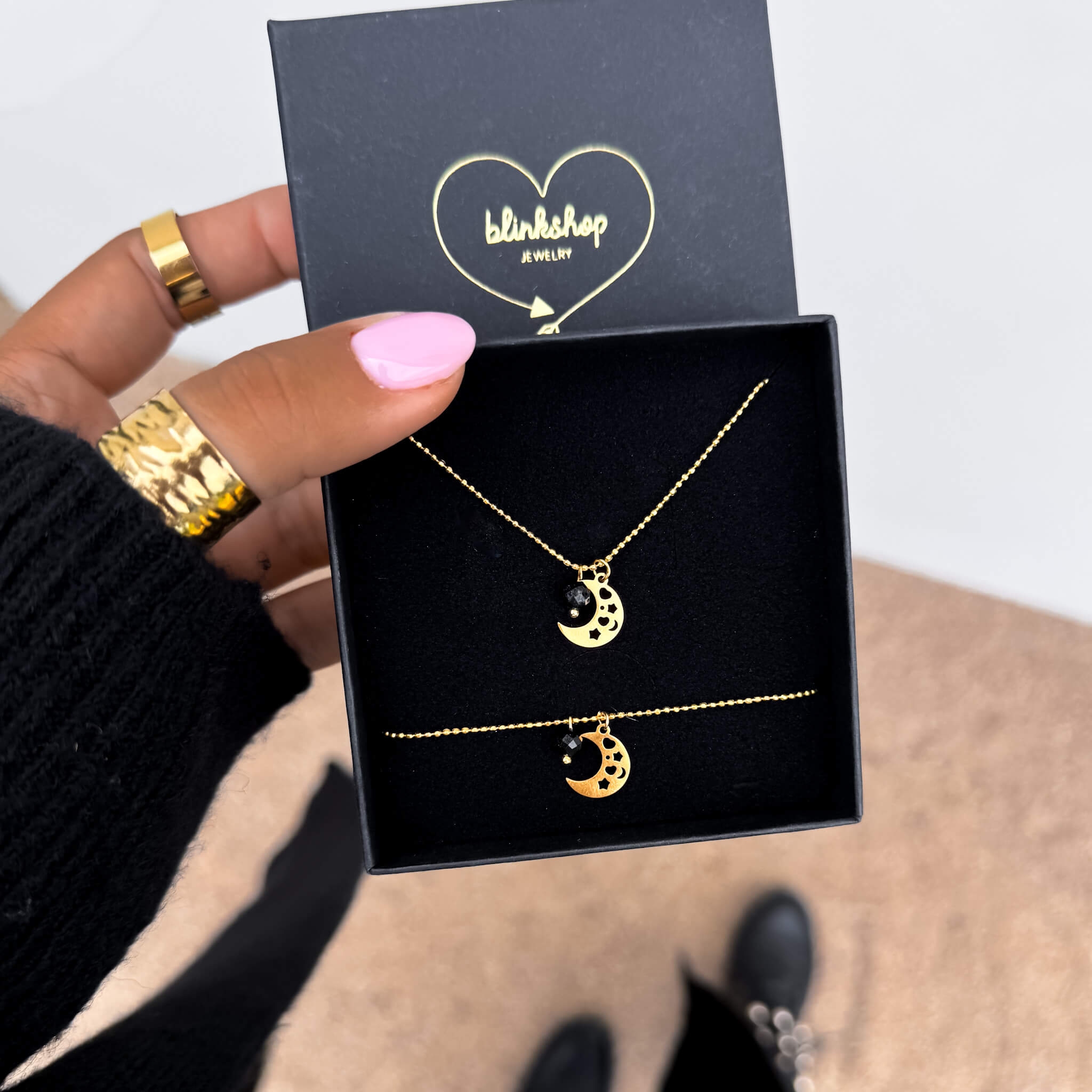 Co ważne – model ten jest częścią zestawu. Do bransoletki możesz dobrać pasujący naszyjnik z motywem księżyca i turmalinem, tworząc spójną i stylową całość.