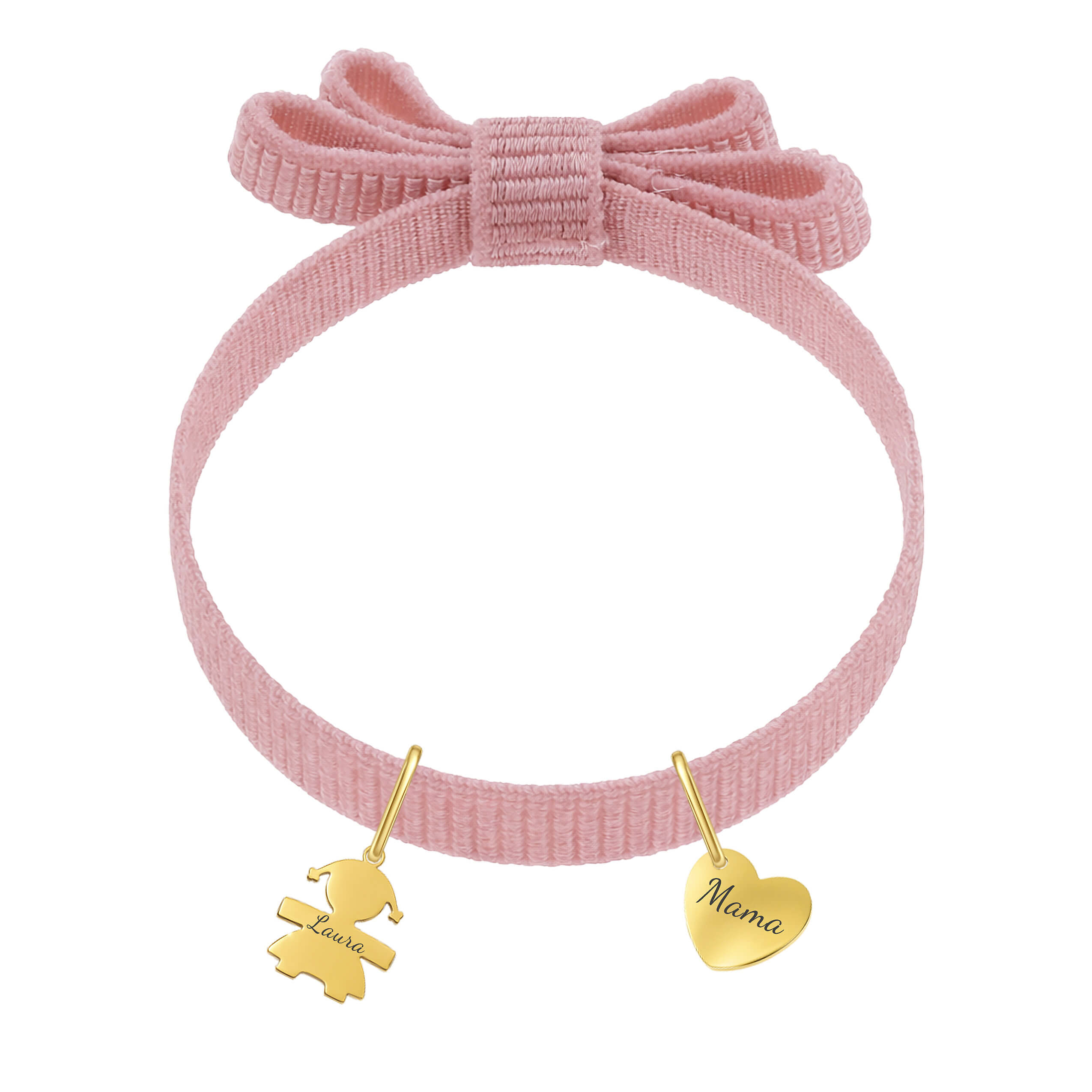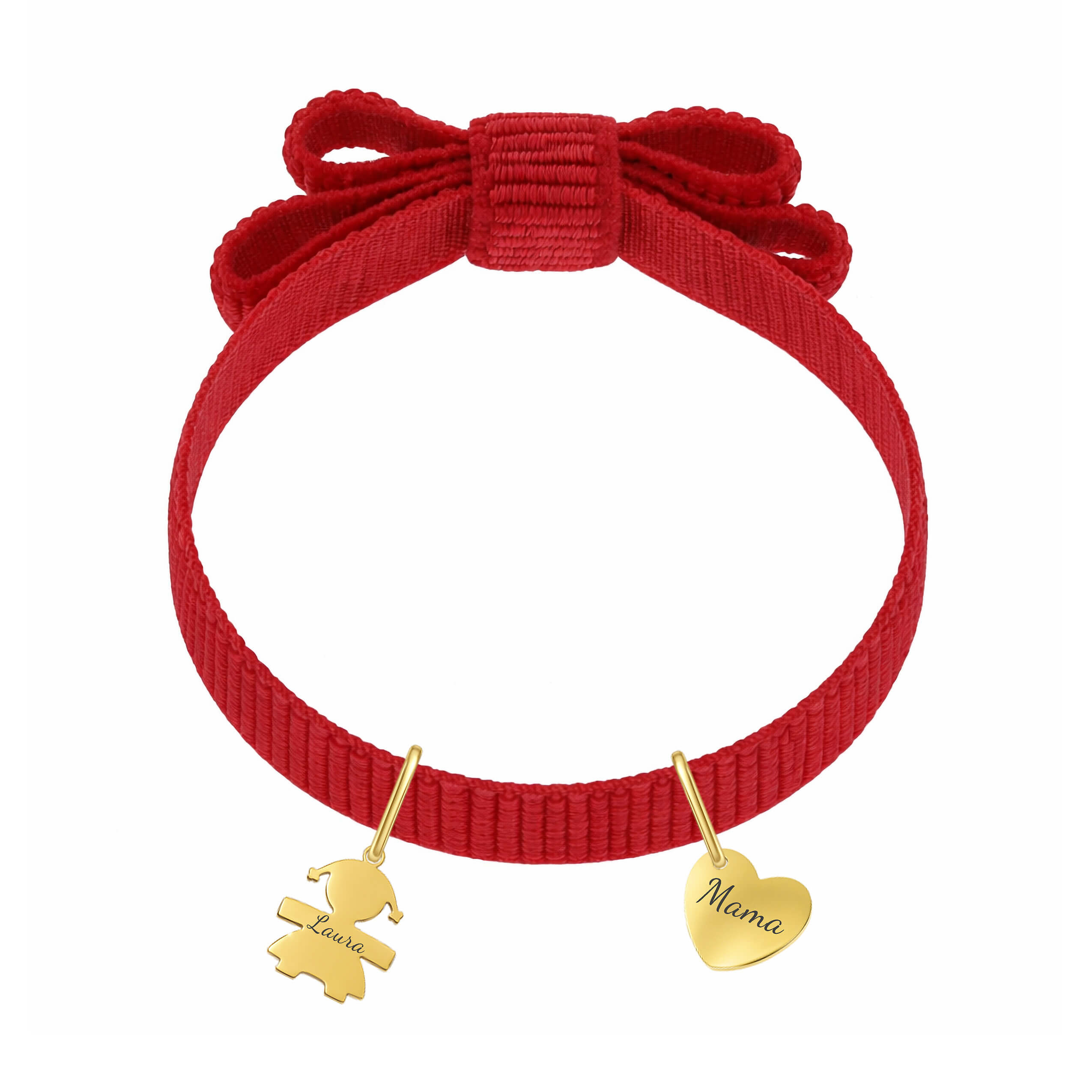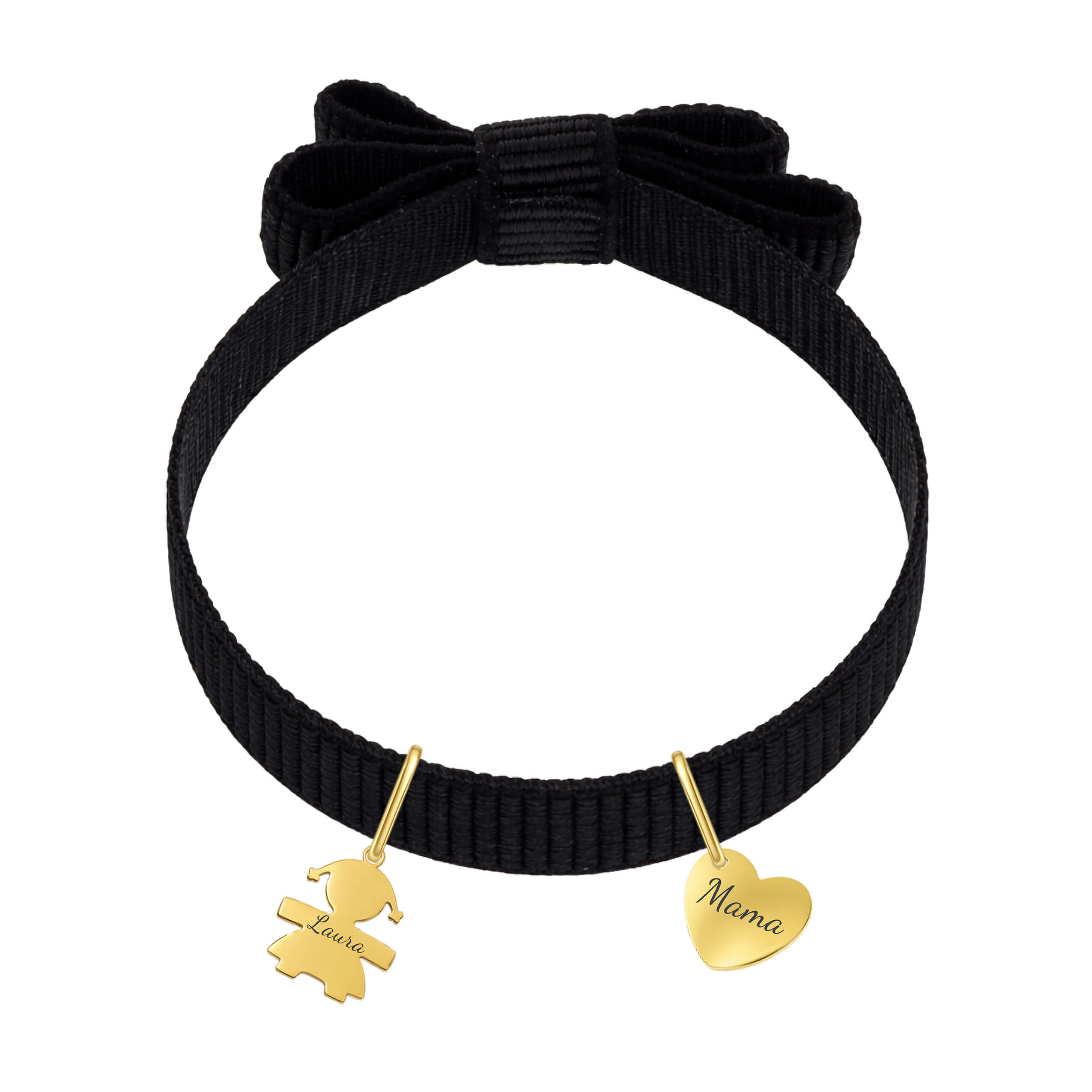 Wykonana z eleganckiej tasiemki zakończonej uroczą kokardką, ozdobiona jest złotymi zawieszkami – serduszkiem z napisem „Mama” oraz figurką dziecka z wygrawerowanym imieniem. To subtelna, a zarazem bardzo emocjonalna biżuteria, która przypomina o tym, co najważniejsze.