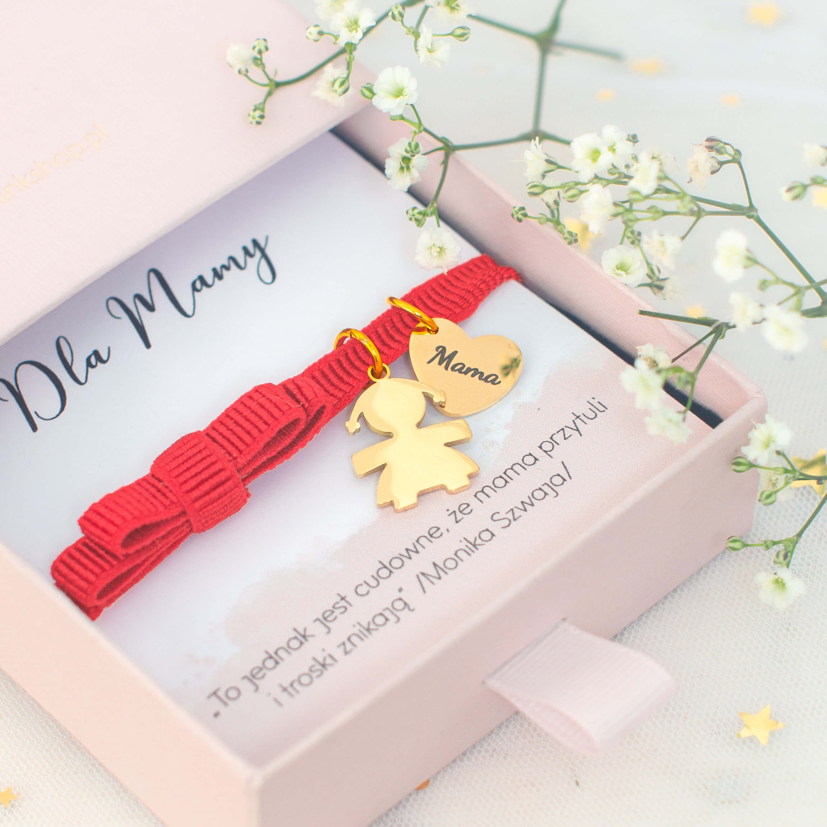 BRANSOLETKA PREZENT DLA MAMY Z GRAWEREM CZERWONA WSTĄŻKA KOKARKA ZAWIESZKA DZIEWCZYNKA
