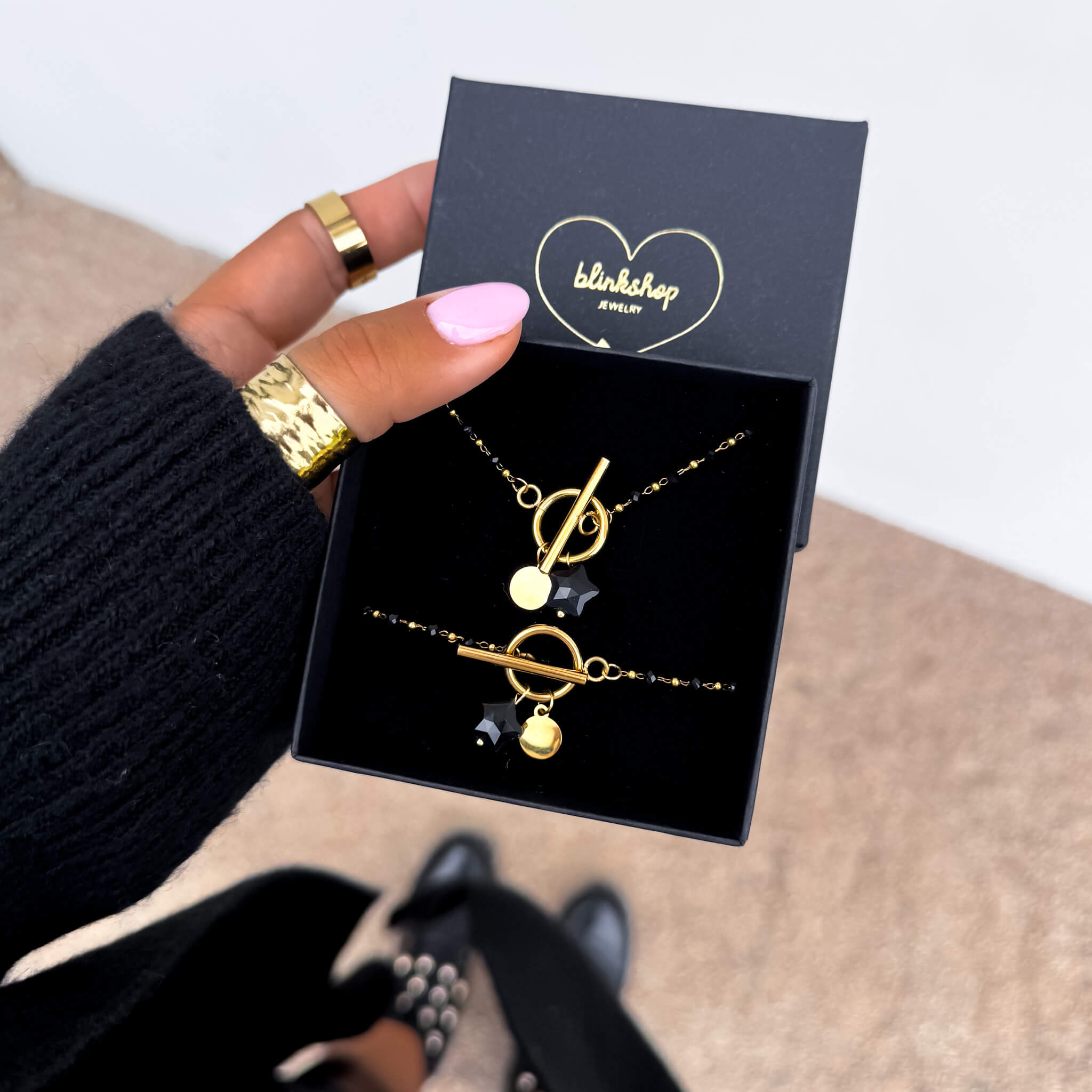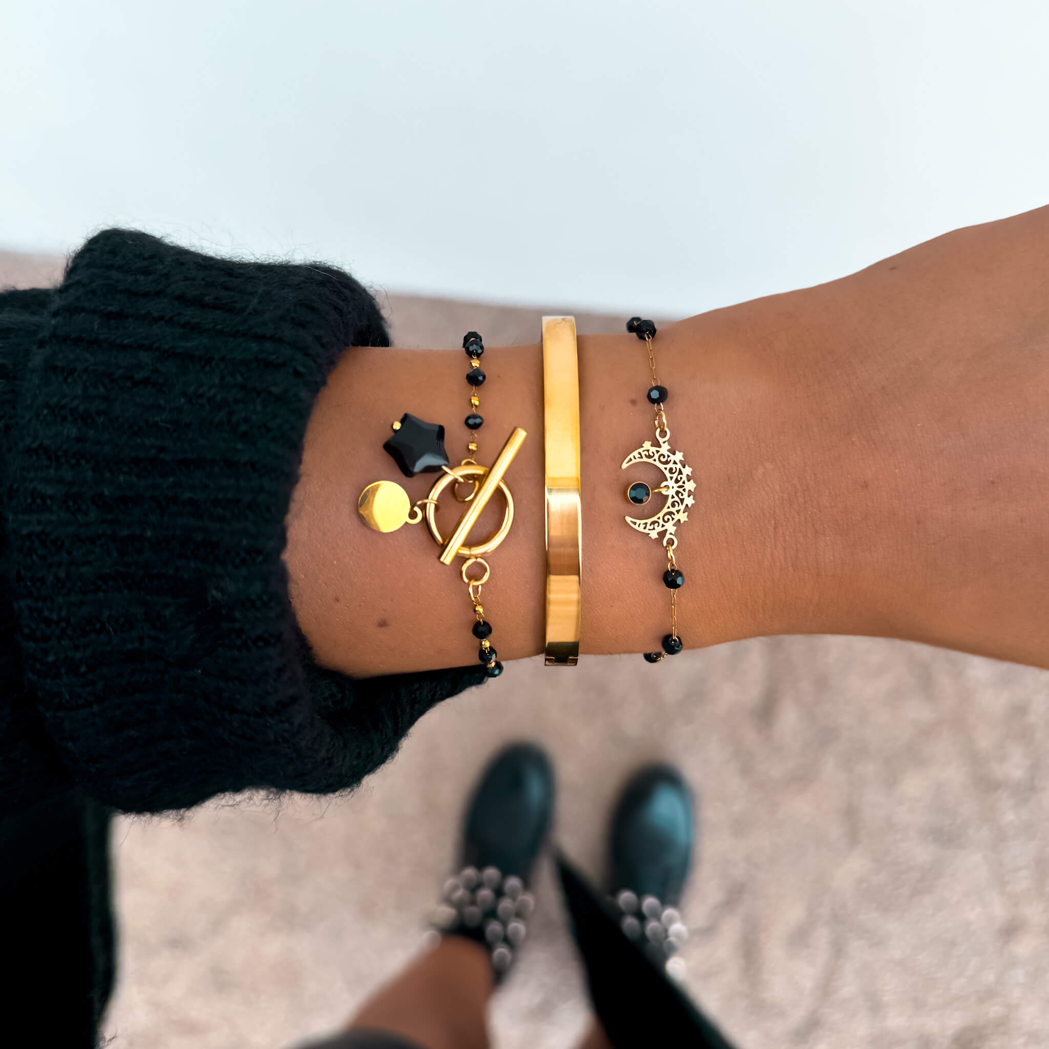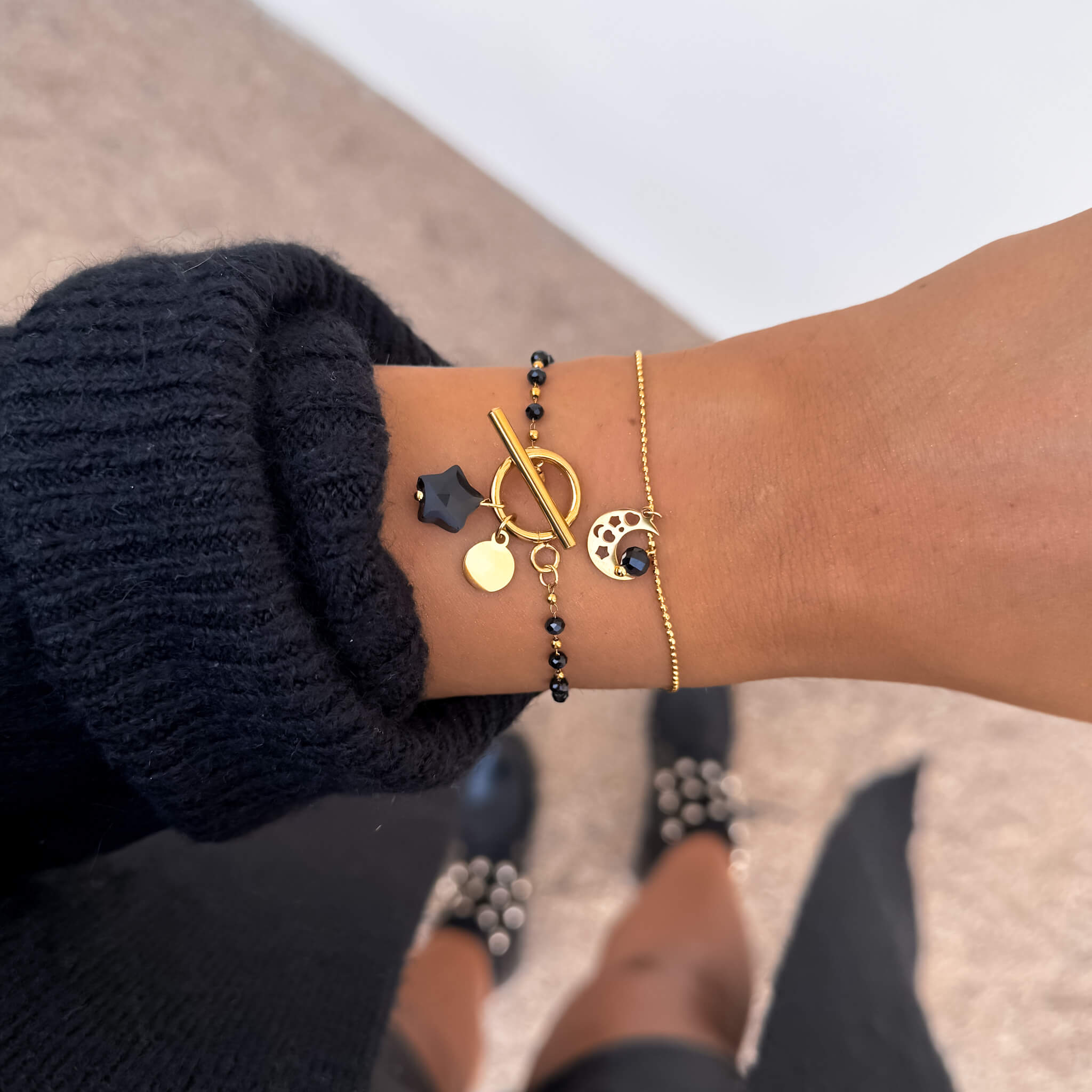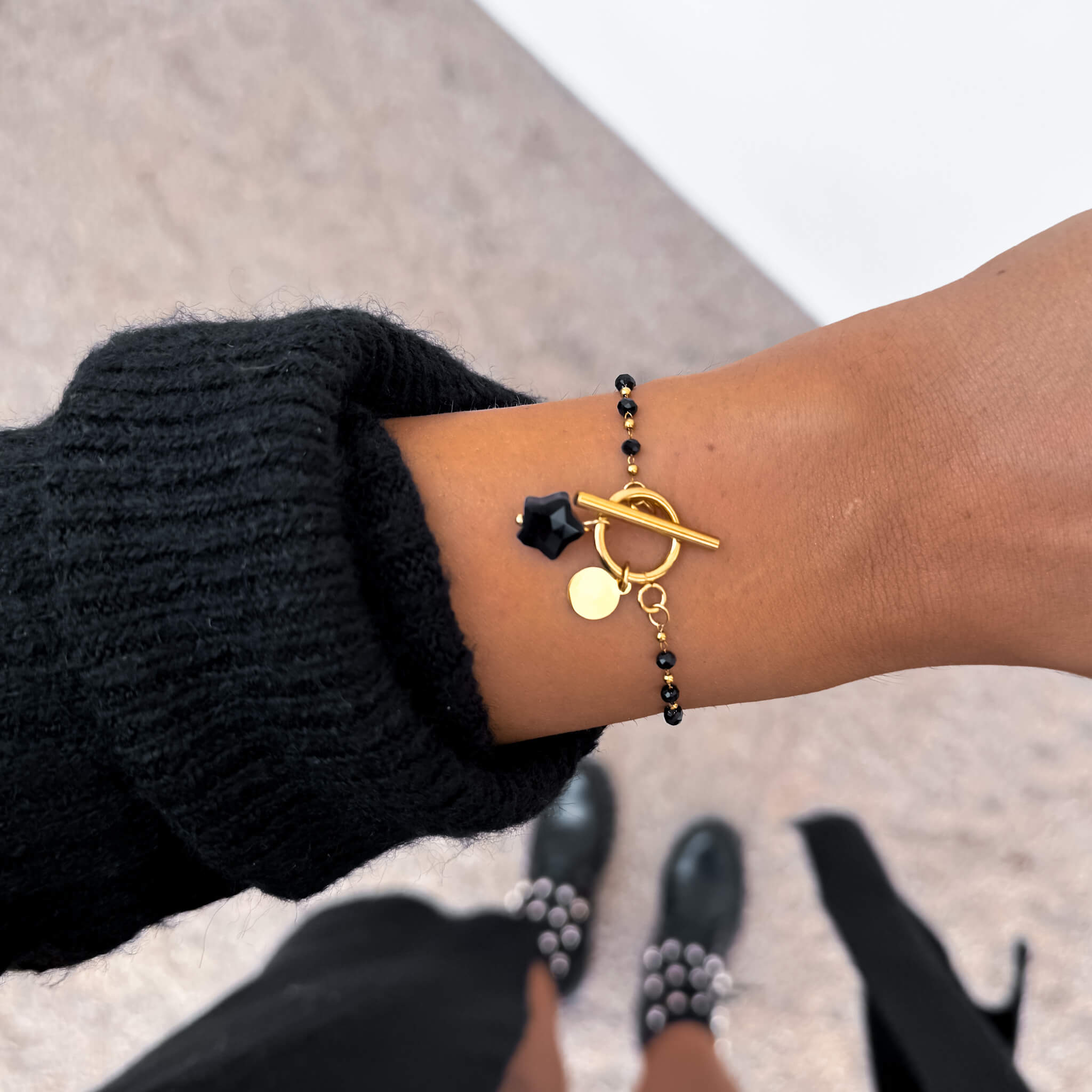 Centralnym elementem bransoletki jest ozdobne zapięcie typu toggle umieszczone z przodu, które pełni nie tylko funkcję praktyczną, ale również dekoracyjną. Mechanizm polega na przekładaniu poprzecznej pałeczki przez okrągłą obręcz, co nadaje całości nowoczesny i designerski charakter. Do zapięcia przymocowane są dwa urokliwe elementy: złota blaszka oraz naturalny onyks ręcznie szlifowany w kształt gwiazdki. Nietypowa forma kamienia sprawia, że biżuteria zyskuje niepowtarzalny urok i symboliczny wymiar – gwiazdka od wieków kojarzona jest z blaskiem, marzeniami i wyjątkowością.
