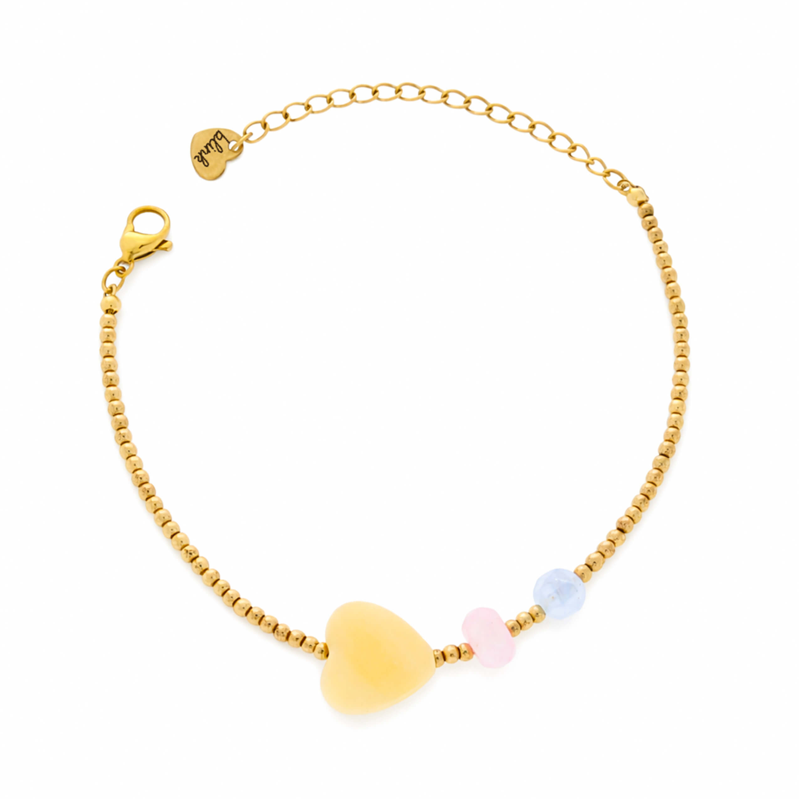 Delikatna bransoletka z agatem żółtym, agatem niebieskim oraz kwarcem różowym to subtelna biżuteria, która przyciąga uwagę pastelową kolorystyką i eleganckim wykończeniem. Centralnym elementem kompozycji jest kamień w kształcie serca, który nadaje bransoletce lekkości i wyjątkowego charakteru.