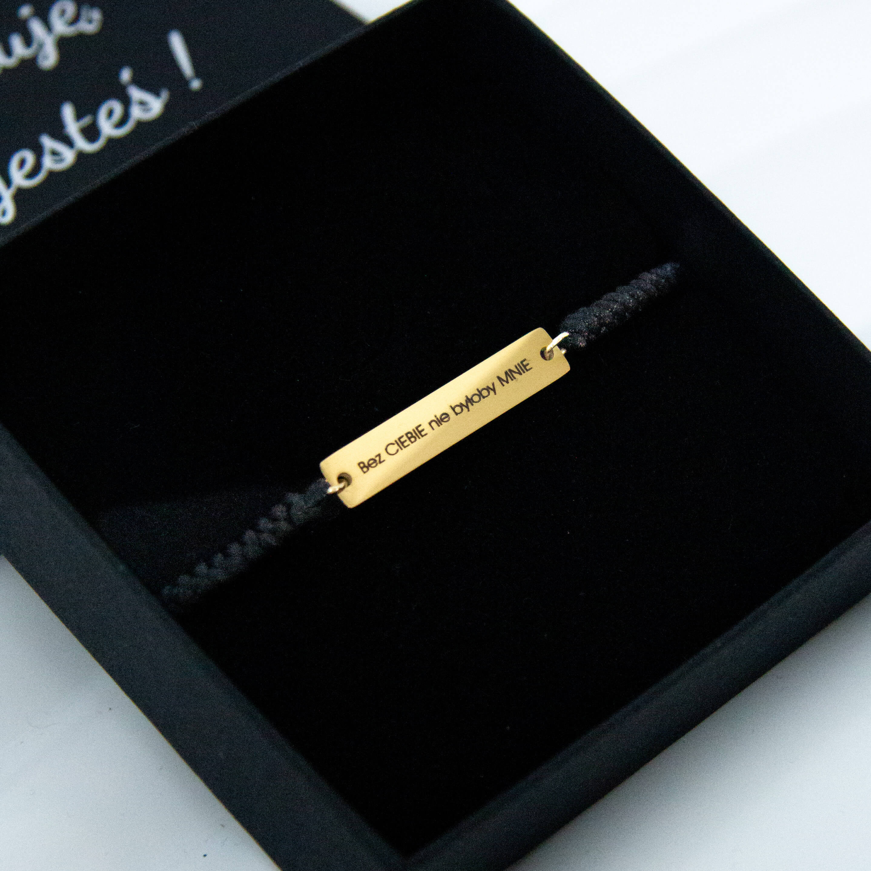 Ta minimalistyczna bransoletka z grawerem „Bez Ciebie nie byłoby mnie” to wyjątkowy sposób na wyrażenie wdzięczności, bliskości i emocjonalnej więzi. Delikatna blaszka z osobistym napisem połączona z regulowanym sznurkiem tworzy ponadczasową biżuterię o symbolicznym charakterze.