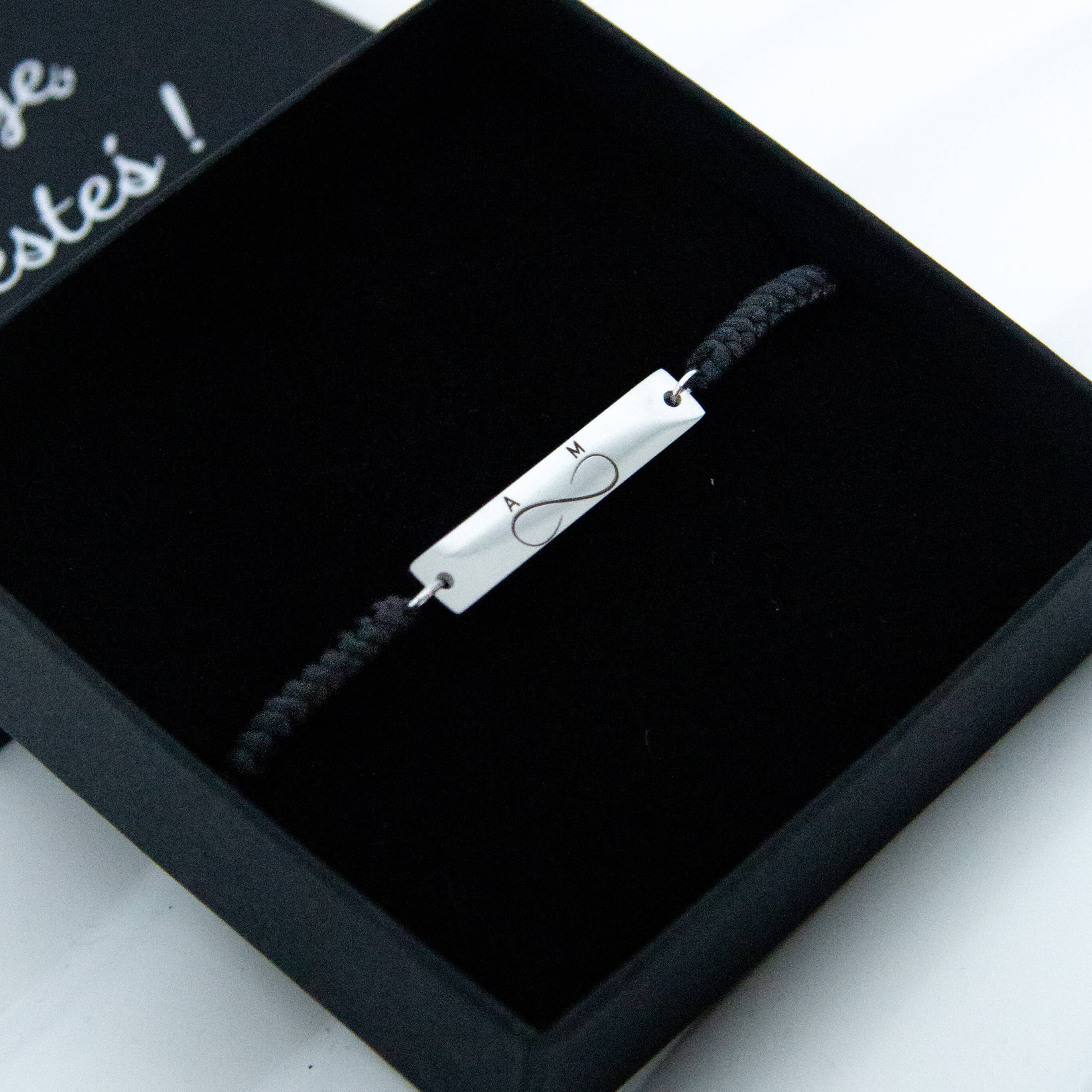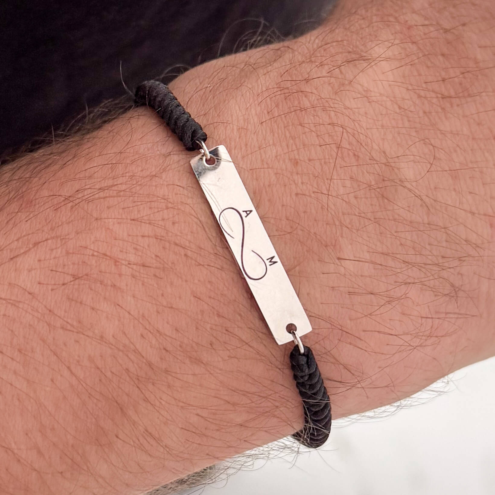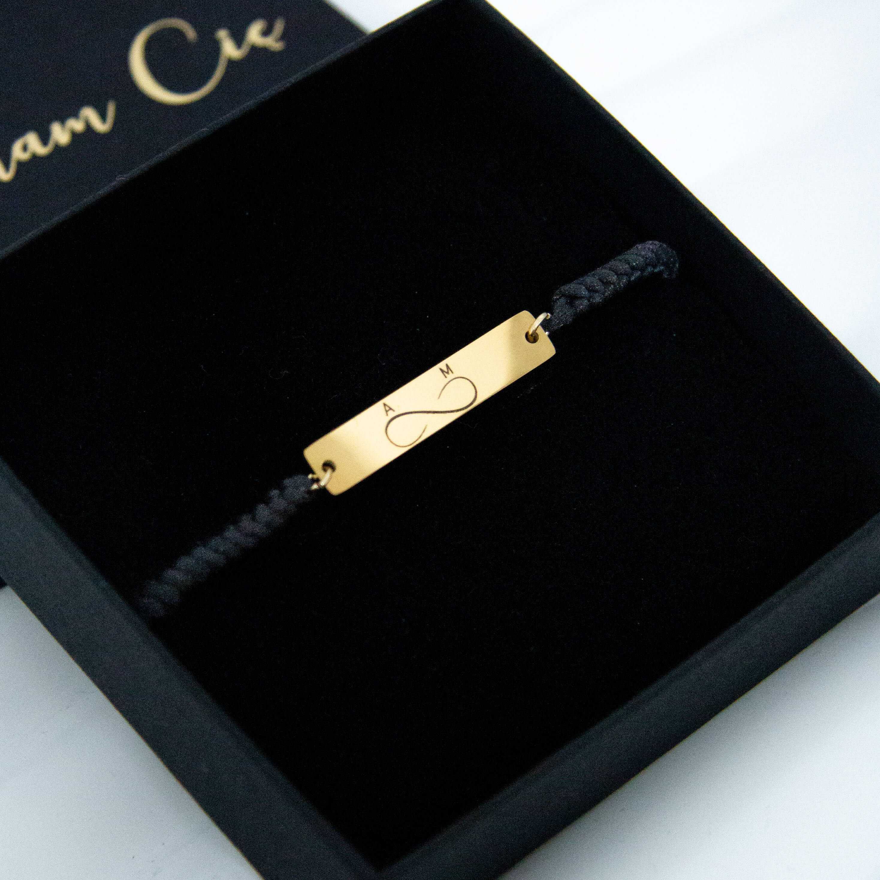Minimalistyczna bransoletka z grawerem w formie symbolu nieskończoności oraz inicjałów to subtelny, ale bardzo wymowny znak bliskości. Prosta forma i czarny sznurek sprawiają, że biżuteria doskonale pasuje do codziennego stylu, zarówno damskiego, jak i męskiego.