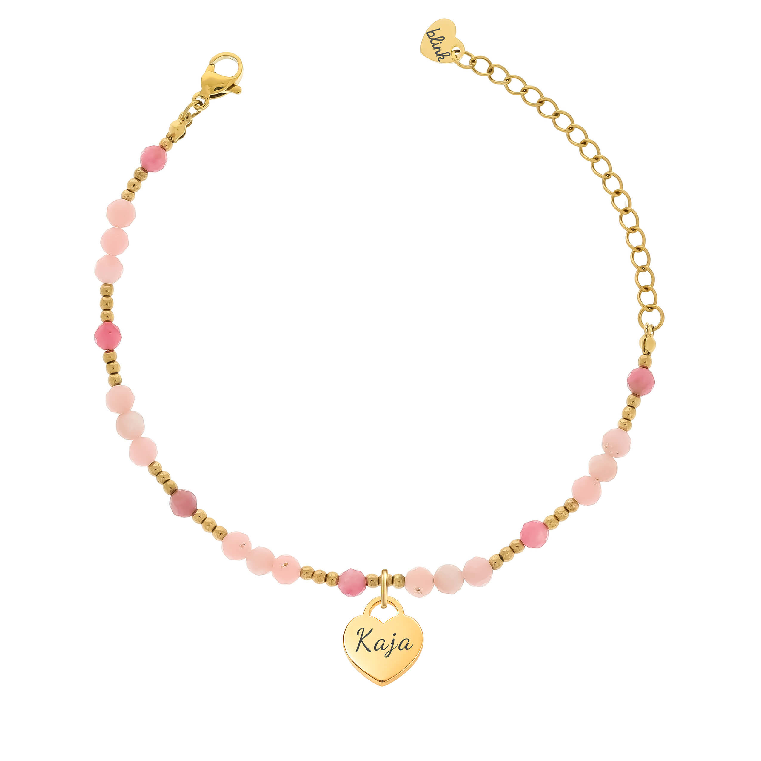 Ta wyjątkowa bransoletka to subtelne połączenie elegancji i emocji. Delikatne kamienie opalu różowego i turmalinu różowego tworzą harmonijną, kobiecą kompozycję, a zawieszka w kształcie serca z grawerem imienia dziecka nadaje jej wyjątkowego, osobistego znaczenia.