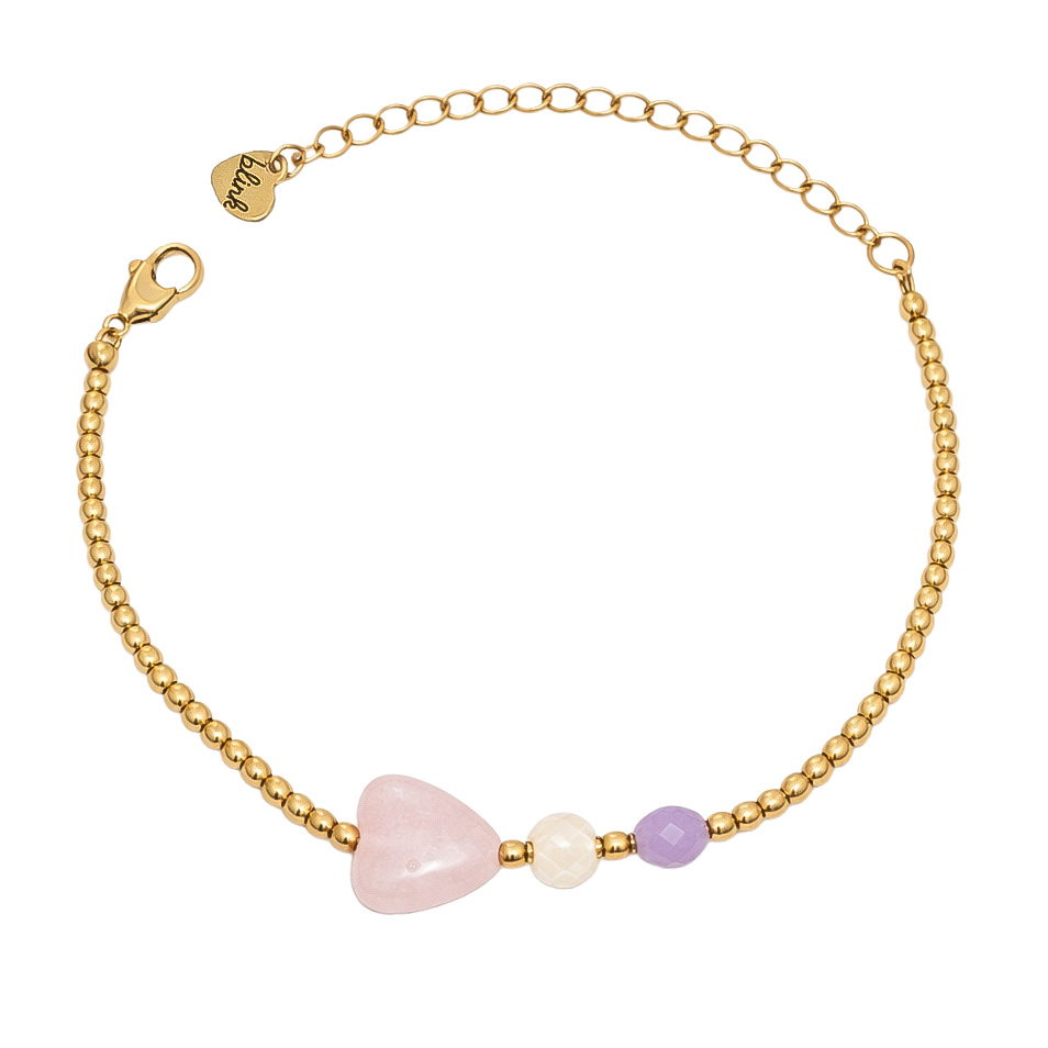 Centralnym elementem bransoletki jest serce z jadeitu, którego naturalna, delikatna barwa nadaje biżuterii lekkości i wyjątkowego charakteru. Towarzyszy mu kwarc różowy – jeden z najbardziej cenionych minerałów o subtelnym, różowym kolorze.