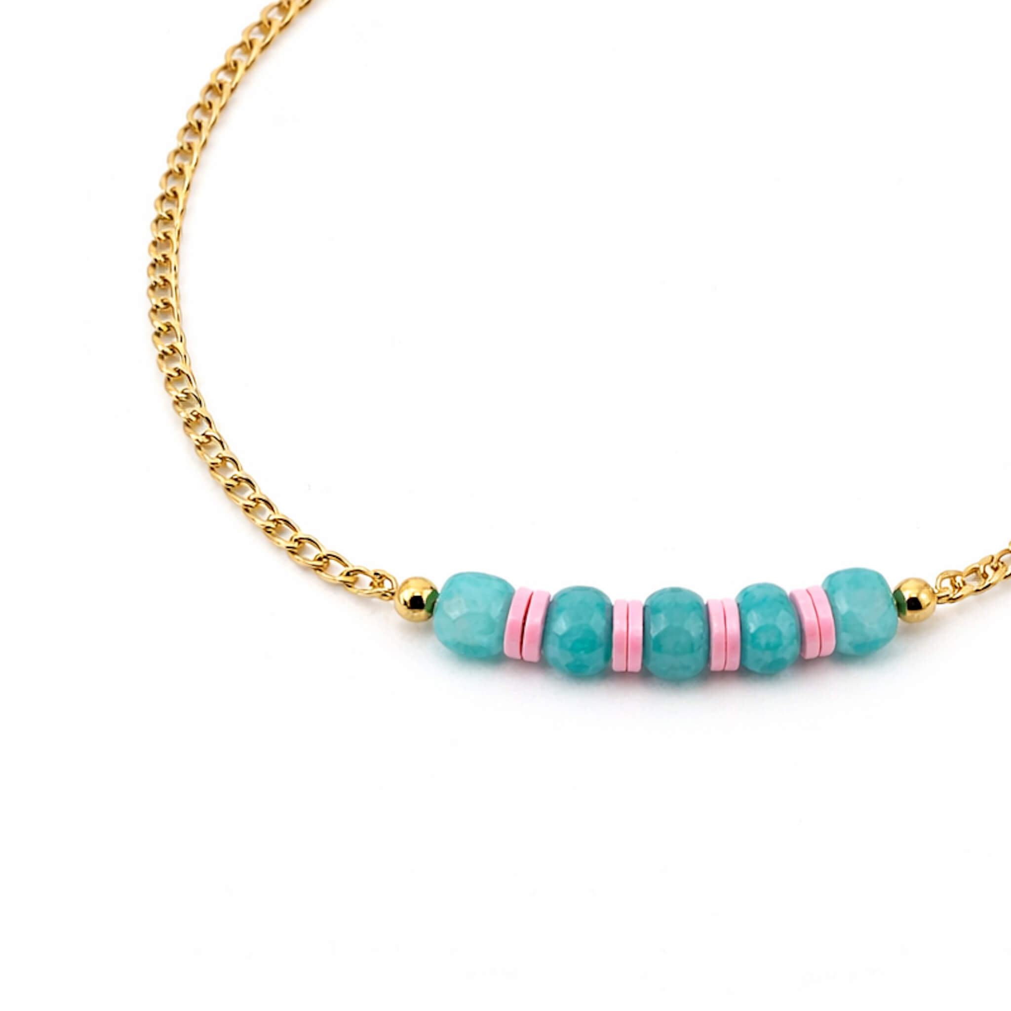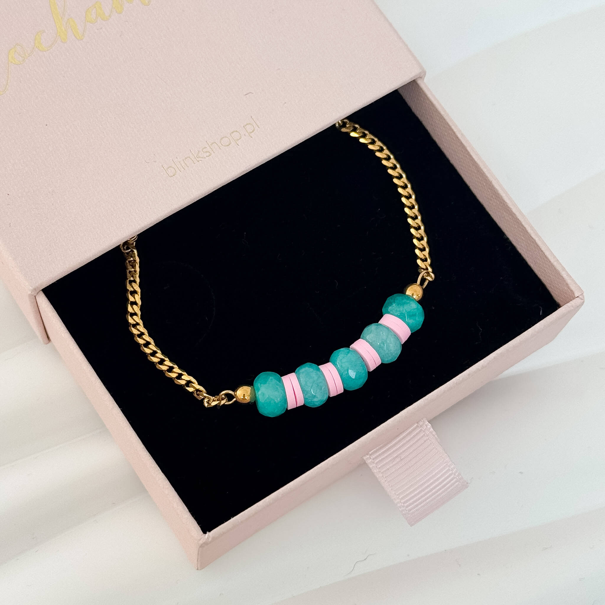 Połączenie naturalnego jadeitu z intensywnie różowymi elementami tworzy nowoczesną, modną kompozycję, która pięknie ożywia każdą stylizację. Złote detale dodają elegancji i sprawiają, że bransoletka pasuje zarówno na co dzień, jak i na specjalne okazje.