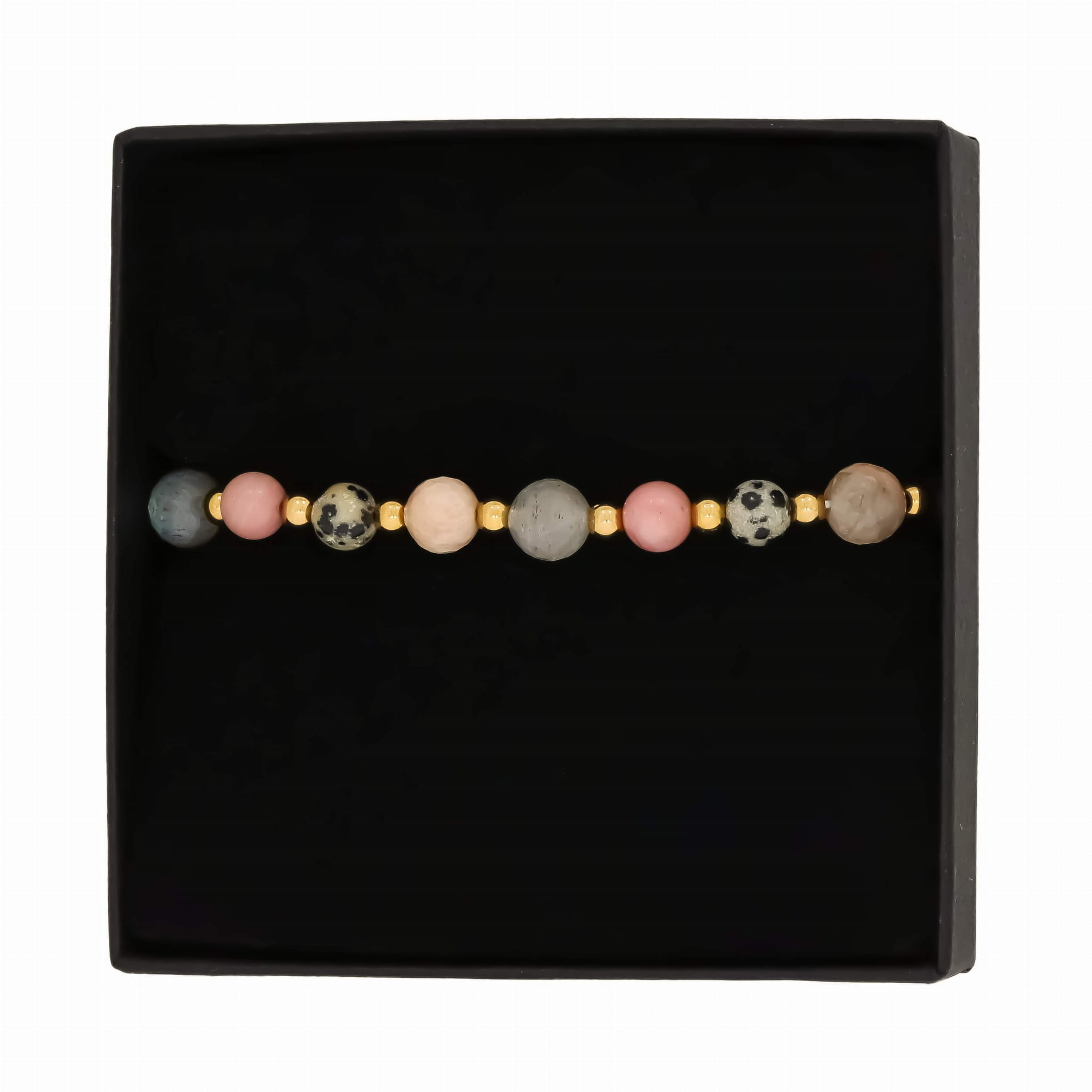 materiał: rodonit, jaspis dalmatyński, kamień słoneczny, labradoryt fasetowany, pozłacana stal chirurgiczna, żyłka