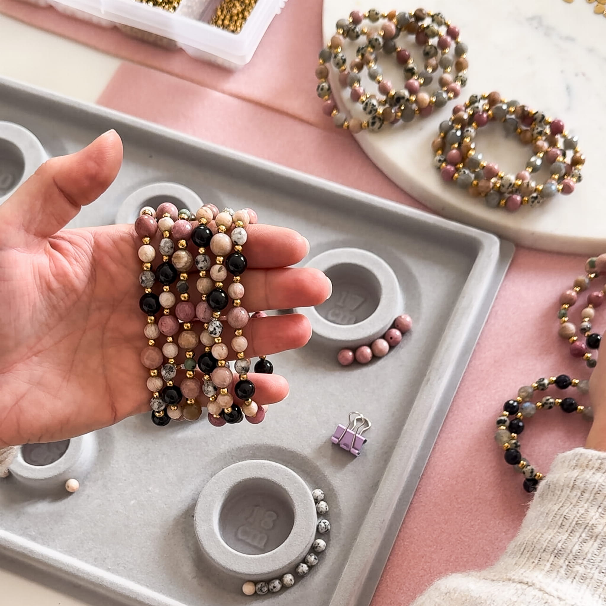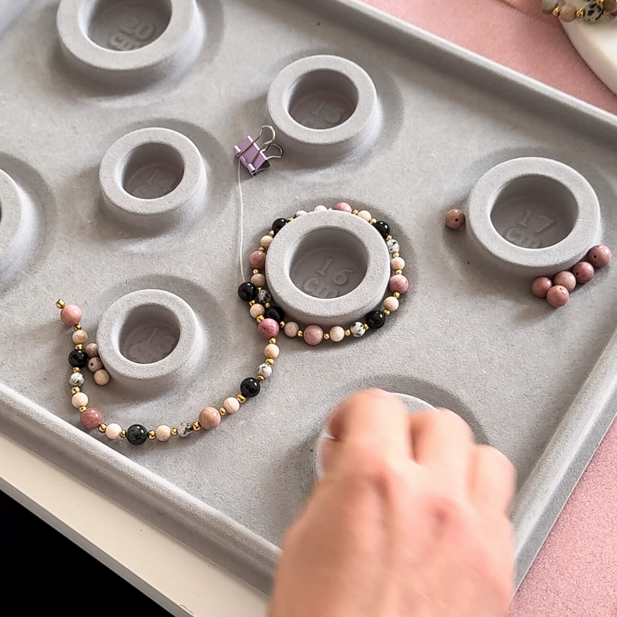 Poznaj naszą nowość z kolekcji Perfect Beads! Rodonit to kamień dla subtelnej kobiety, który ze względu na swoją delikatną barwę podkreśli Twoją osobowość. Bransoletka w całości wykonana jest ręcznie z kamieni naturalnych, które dobrane zostały z największą starannością. Połączenie tych minerałów to idealny wybór na co dzień i na wieczorowe wyjście. Przekładki wykonane są z najwyższej jakości antyalergicznej stali szlachetnej pozłacanej. Całość nawleczona została na elastyczną żyłkę jubilerską, co pozwala na dopasowanie się bransoletki do nadgarstka właścicielki.