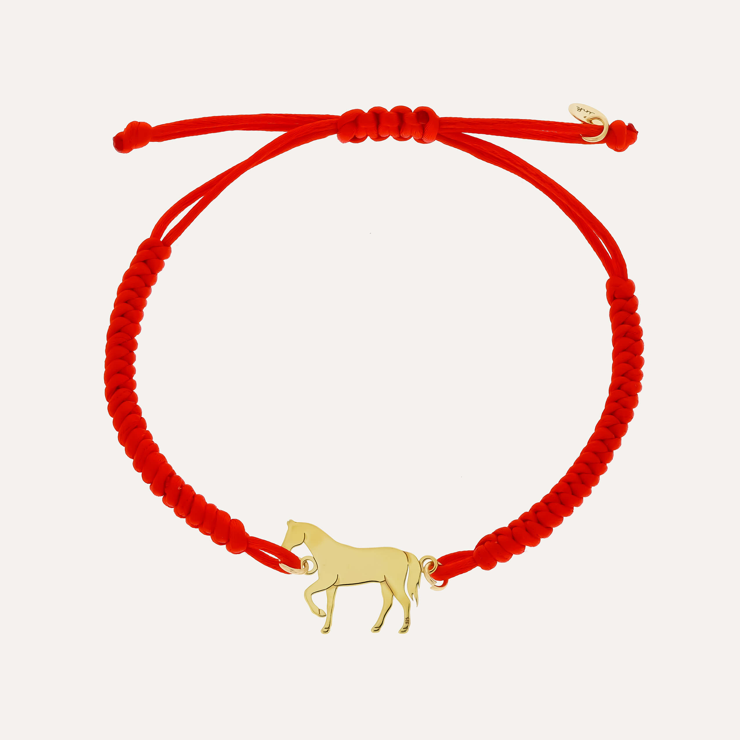 Gruby czerwony sznurek nadaje całości wyrazistego charakteru, a zawieszka w kształcie konia wykonana z pozłacanego srebra próby 925 podkreśla szlachetność i trwałość produktu. To nie jest biżuteria stylizowana – to pełnoprawny wyrób jubilerski.