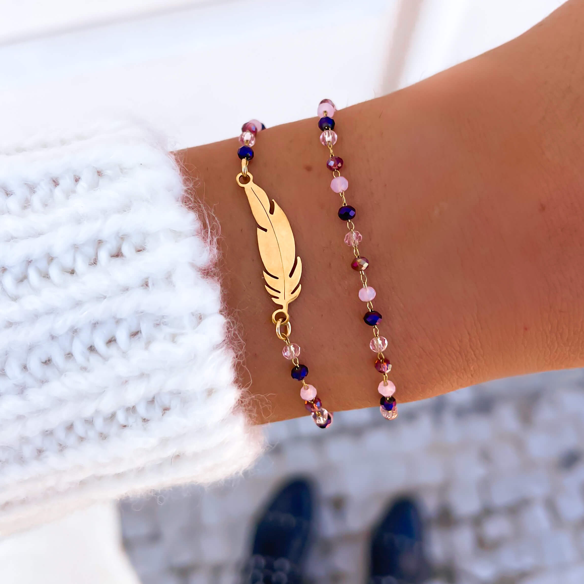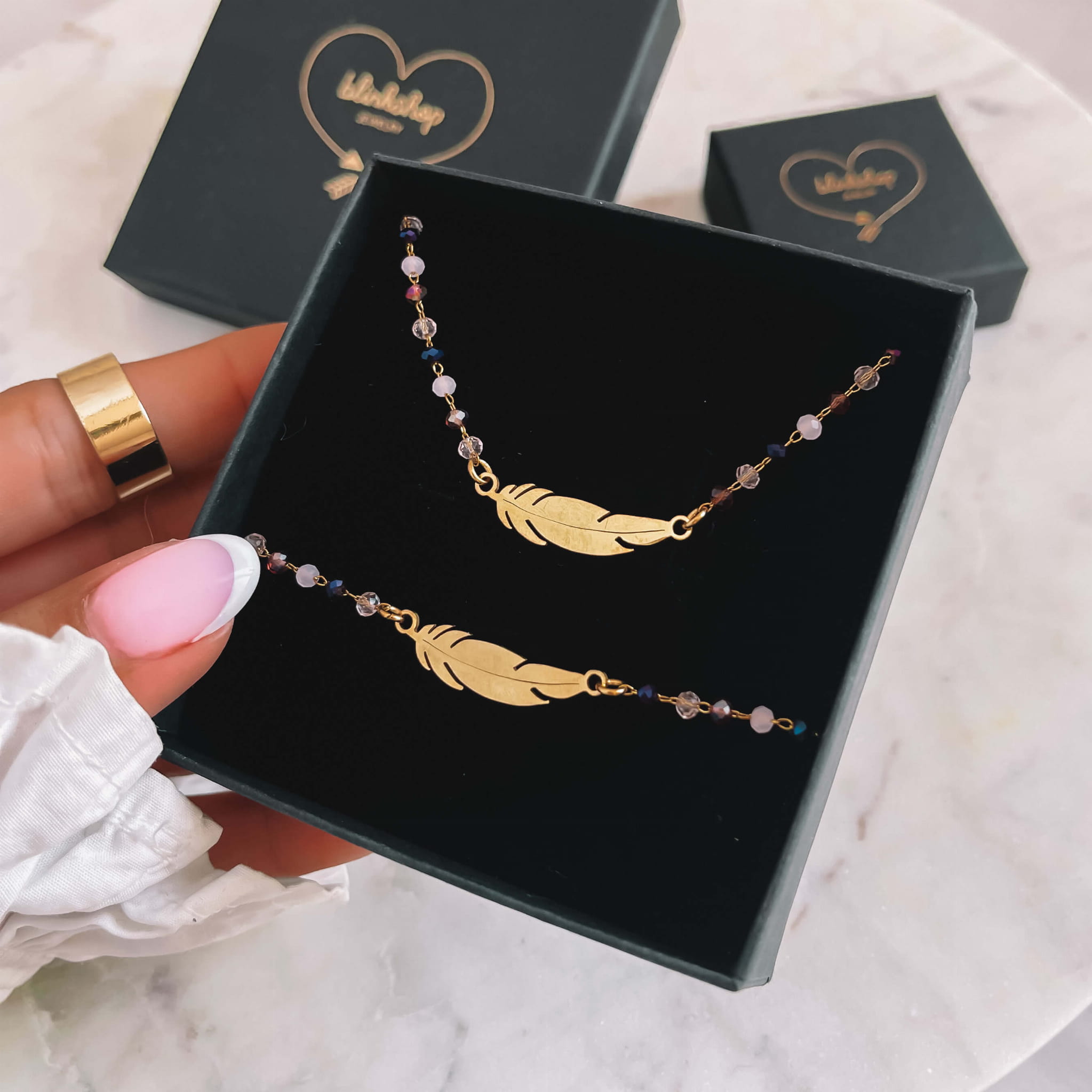 Złota bransoletka ze stali chirurgicznej z piórkiem na łańcuszku z koralikami to idealny dodatek dla miłośniczek stylu boho, które pragną połączyć elegancję z naturalnymi akcentami. Bransoletka jest nie tylko modna, ale ma też symboliczne znaczenie. Pióra często interpretowane są jako symbole wolności, lekkości i swobody. Ta bransoletka jest wyjątkowo uniwersalna - możesz ją nosić samodzielnie jako subtelny akcent lub połączyć z innymi bransoletkami w stylu boho, aby stworzyć warstwowy komplet.