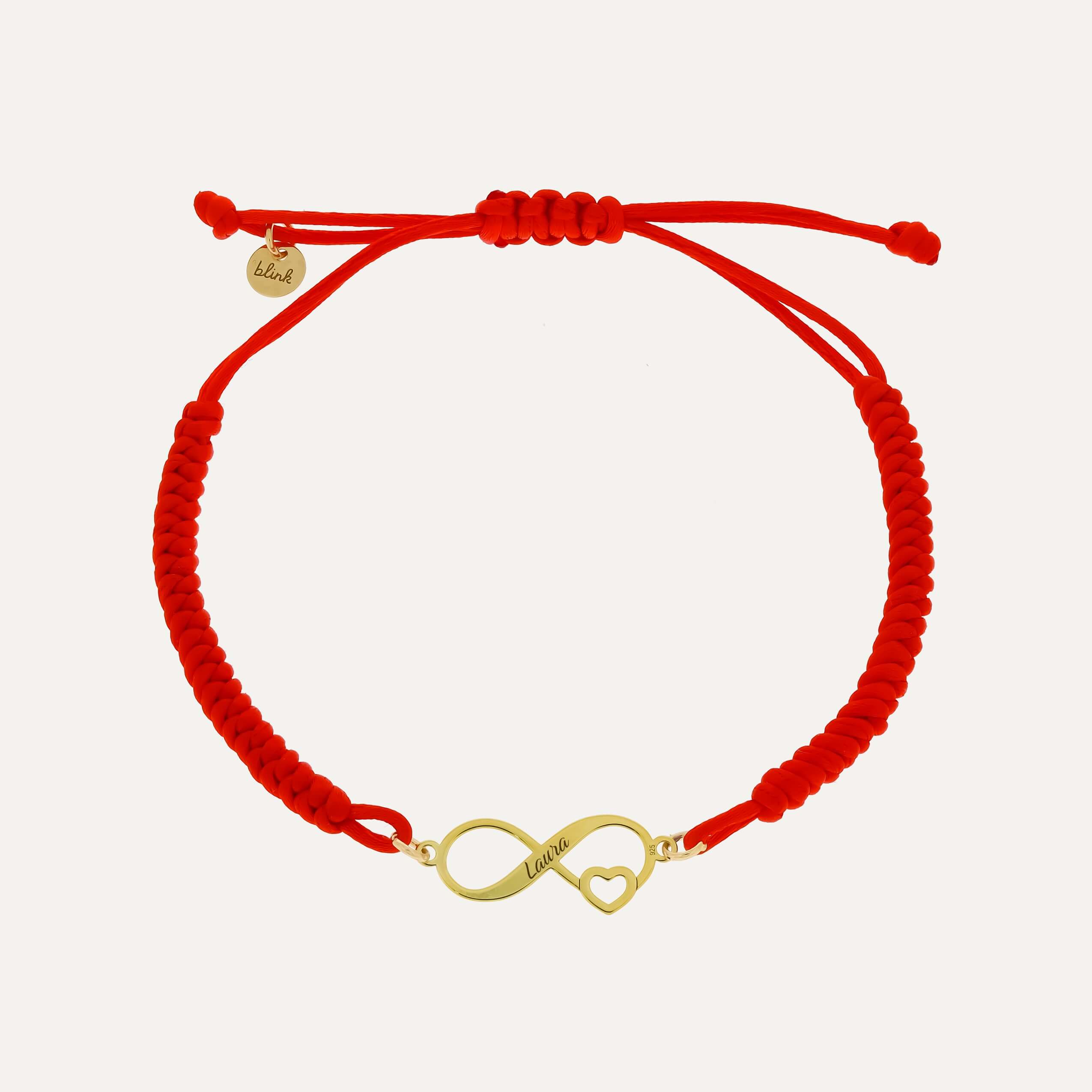 BRANSOLETKA ZE ZNAKIEM NIESKOŃCZONOŚCI I SERCEM GRAWER, POZŁACANE SREBRO 925 CZERWONY SZNUREK