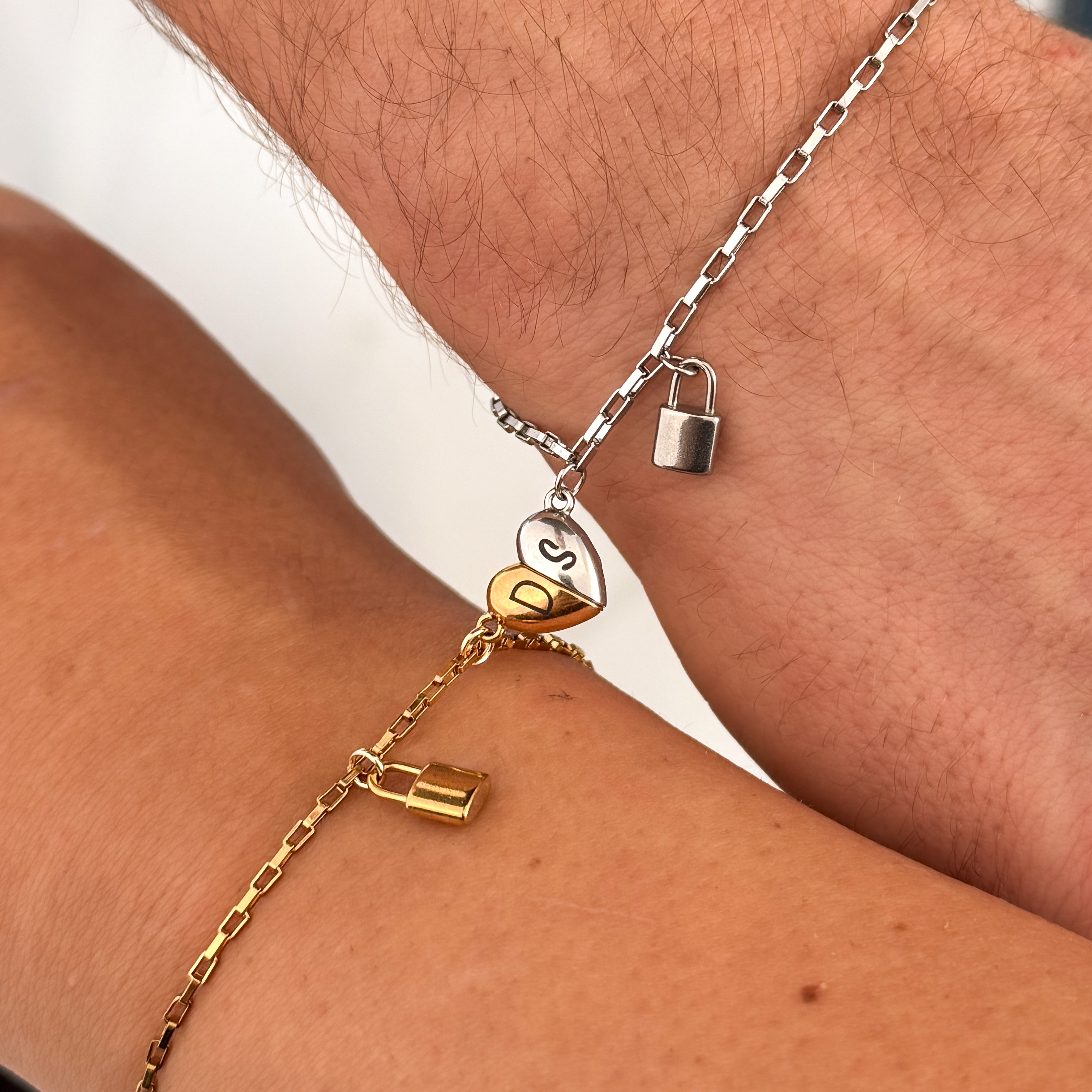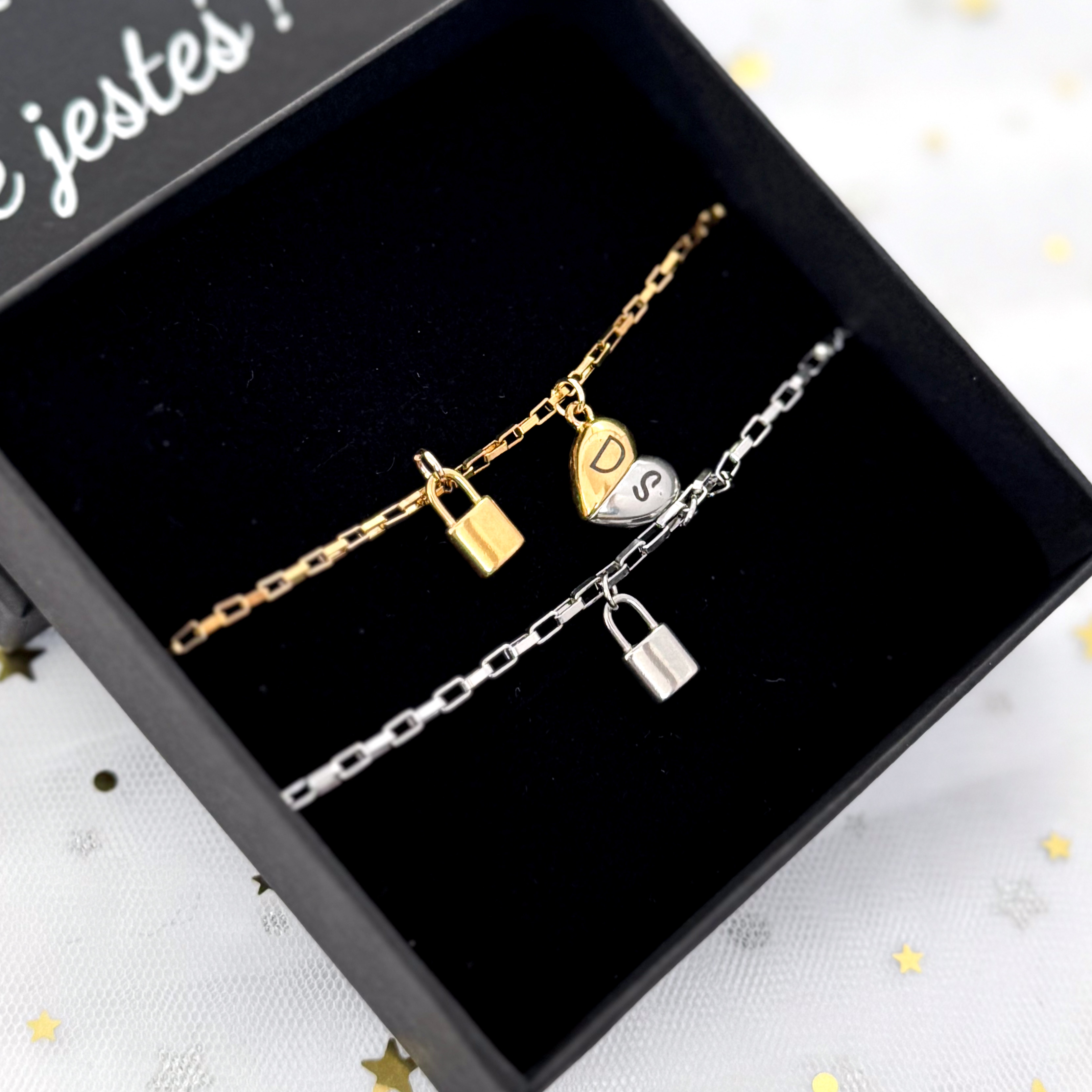 Każda z bransoletek ma swoją połowę serca z wygrawerowaną literą – Twoją i jego. Po złożeniu tworzą jedno serce. Dodatkowo przy każdej bransoletce znajduje się subtelna zawieszka w kształcie kłódki – symbol bliskości, zaufania i „tylko dla nas”.