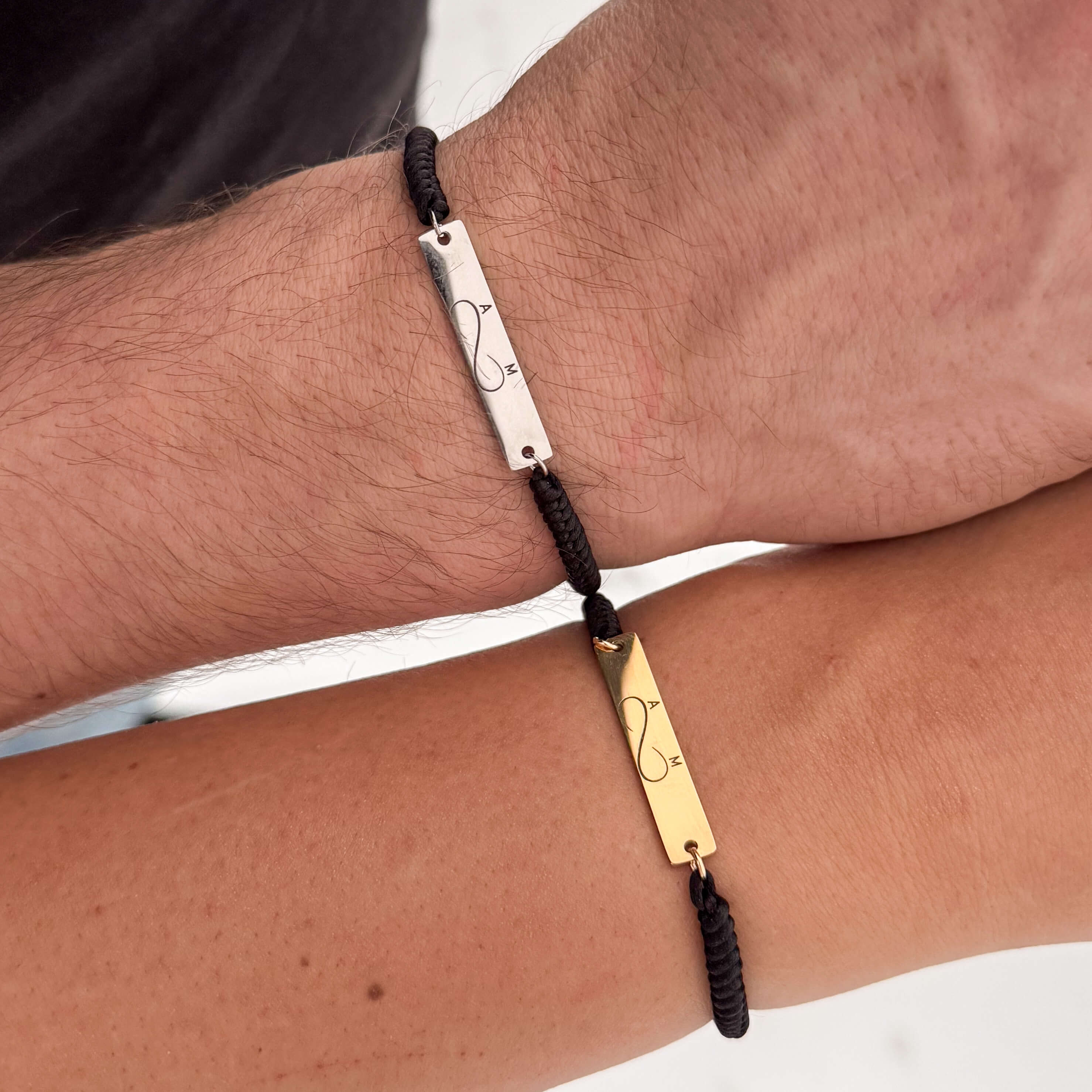 Komplet minimalistycznych bransoletek z grawerem stworzony z myślą o parach, które chcą nosić wspólny, symboliczny znak relacji. Grawer w formie symbolu nieskończoności połączonego z inicjałami to ponadczasowy motyw, który od lat kojarzony jest z trwałością, ciągłością i bliskością. Inicjały dwóch osób sprawiają, że komplet staje się osobistym znakiem więzi, widocznym tylko dla Was.