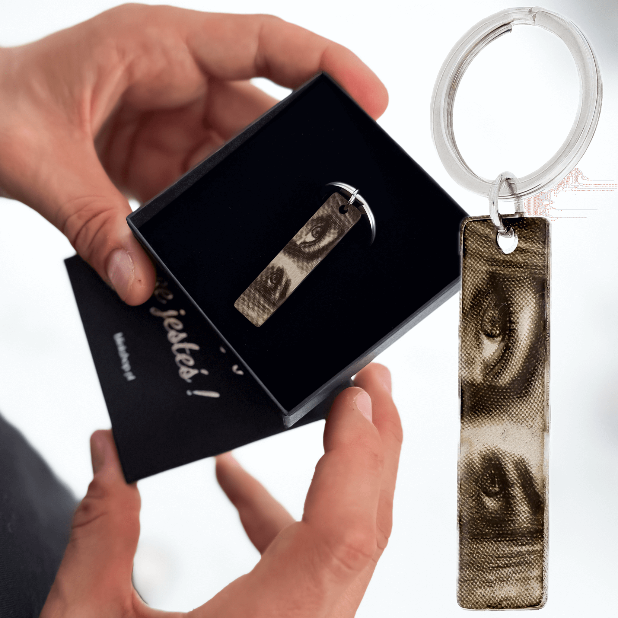 Na zdjęciu prezentujemy model z przykładowym grawerem oczu. Możemy odwzorować spojrzenie dowolnej osoby, która jest dla Ciebie ważna, tworząc w ten sposób jedyny w swoim rodzaju egzemplarz. Taki brelok to niezwykła, bardzo osobista pamiątka lub wyjątkowy prezent pełen symboliki i emocji.