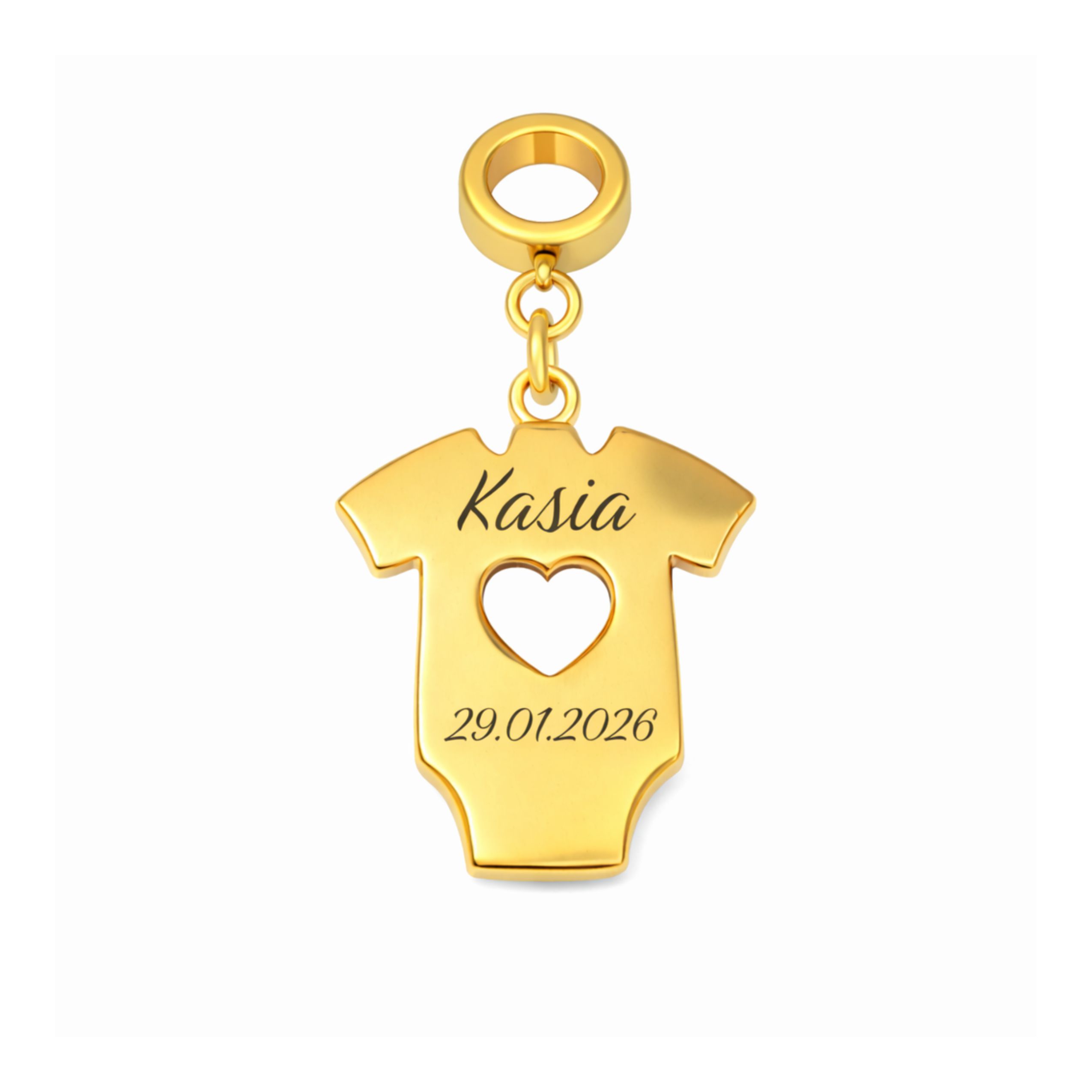 Na zawieszce wykonujemy personalizowany grawer – możesz umieścić imię dziecka lub imię wraz z datą urodzenia, tworząc biżuterię o głębokim, osobistym znaczeniu. Gładka, lśniąca powierzchnia złota zapewnia wysoką czytelność graweru i elegancki, biżuteryjny charakter charmsa.
