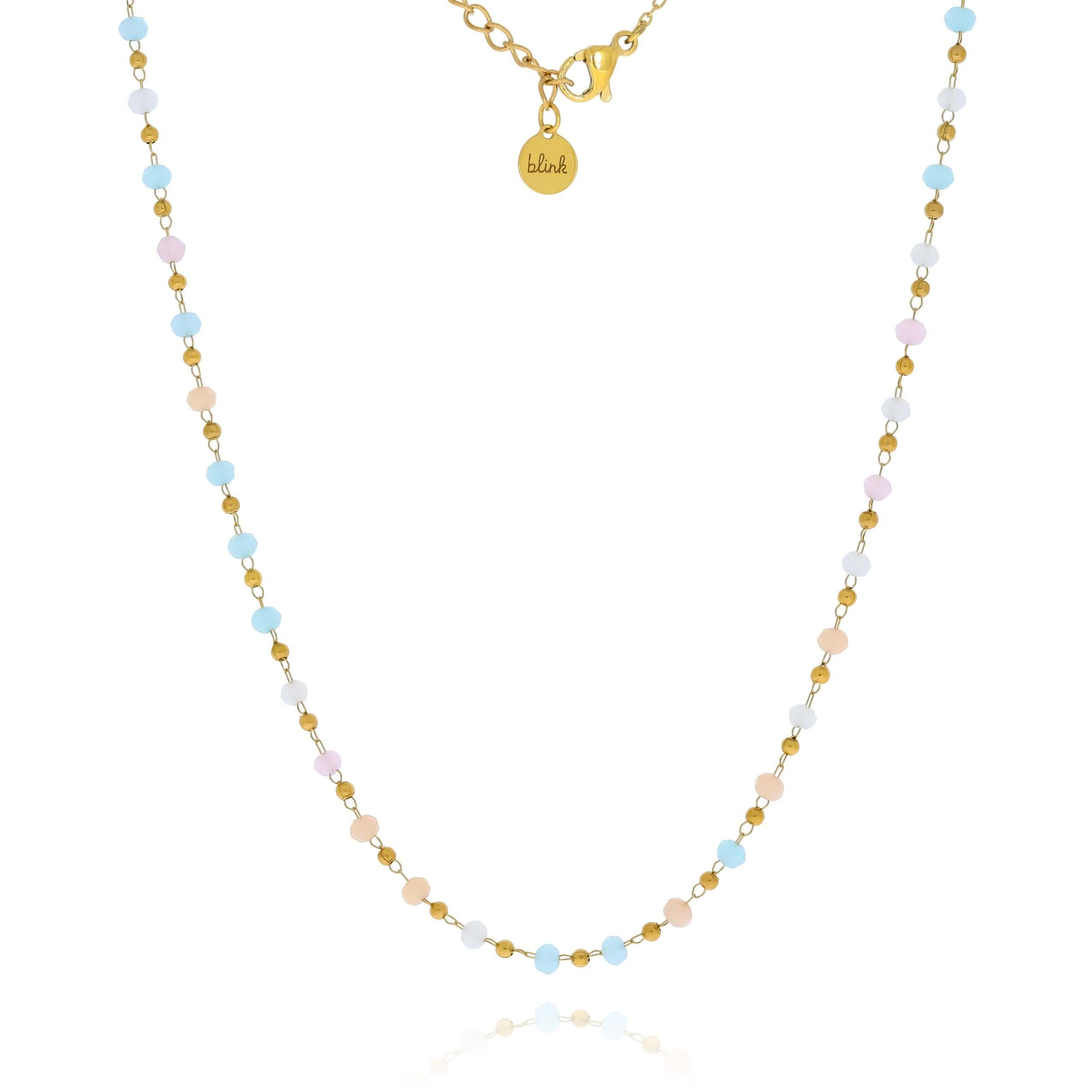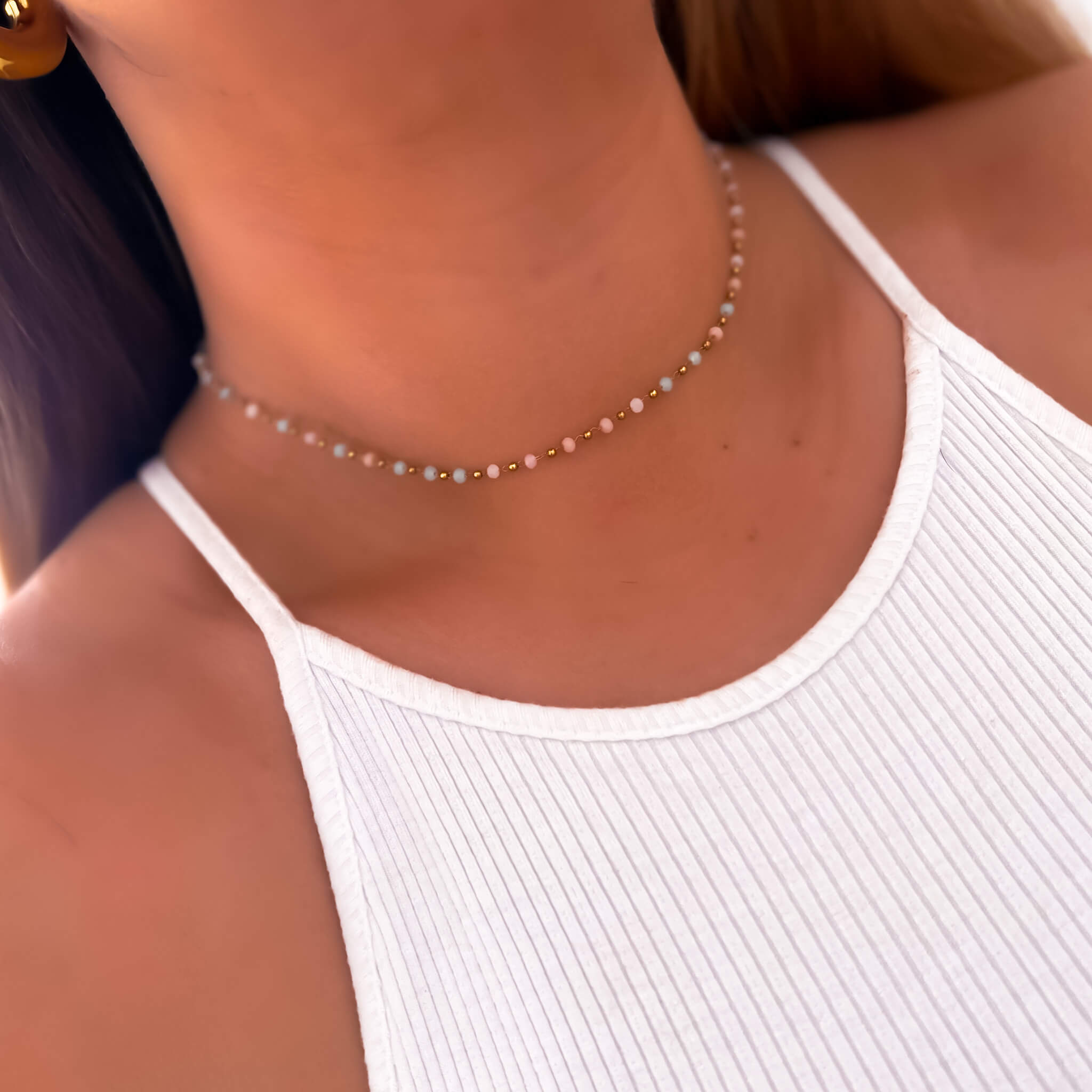 Dzięki starannie dobranym niebieskim i różowym koralikom, naszyjnik pięknie przylega do szyi, podkreślając jej delikatność. Krótka długość naszyjnika sprawia, że doskonale komponuje się z dekoltami różnych kształtów. To minimalistyczny, a jednocześnie wyjątkowy element, który doda Twojemu wyglądowi oryginalności.
