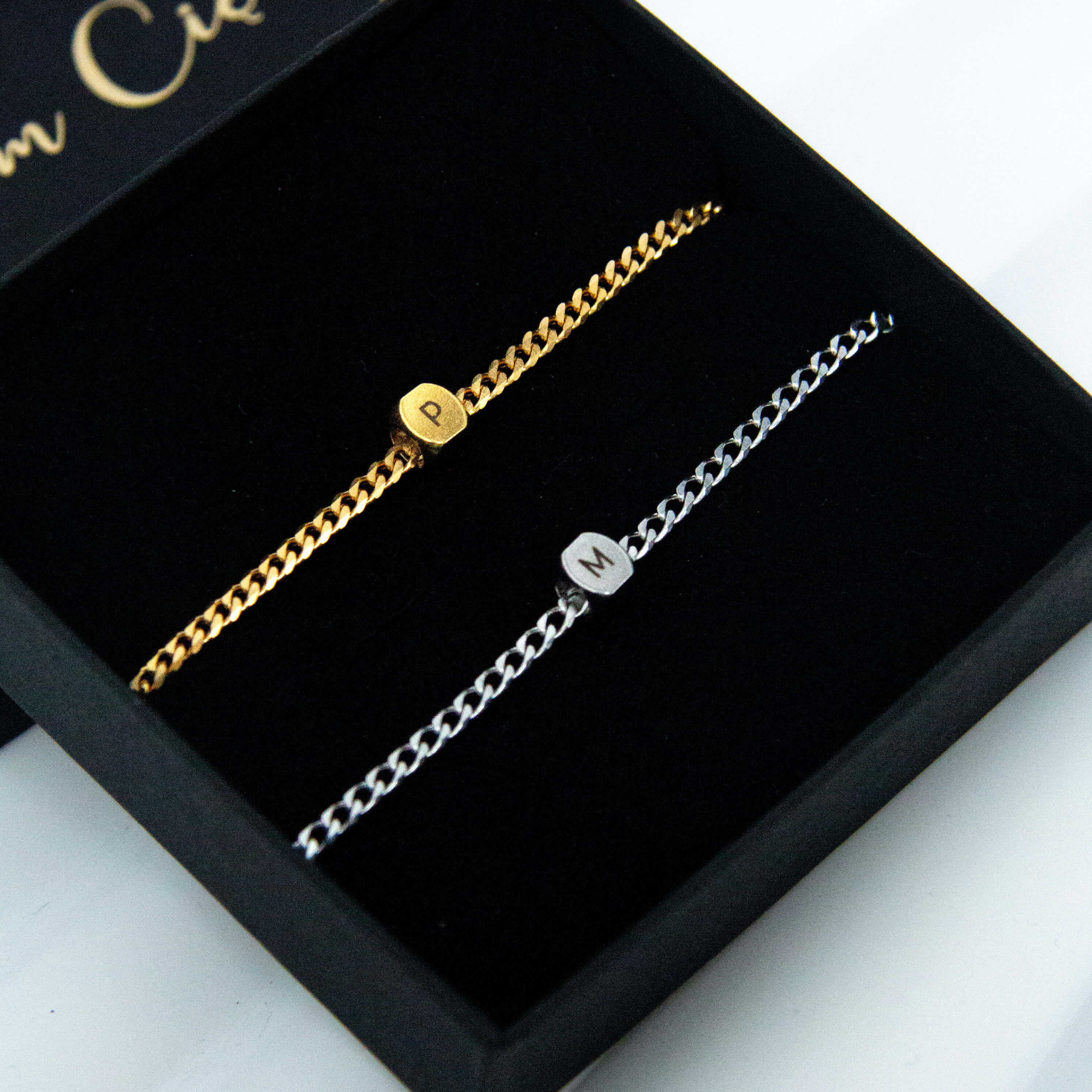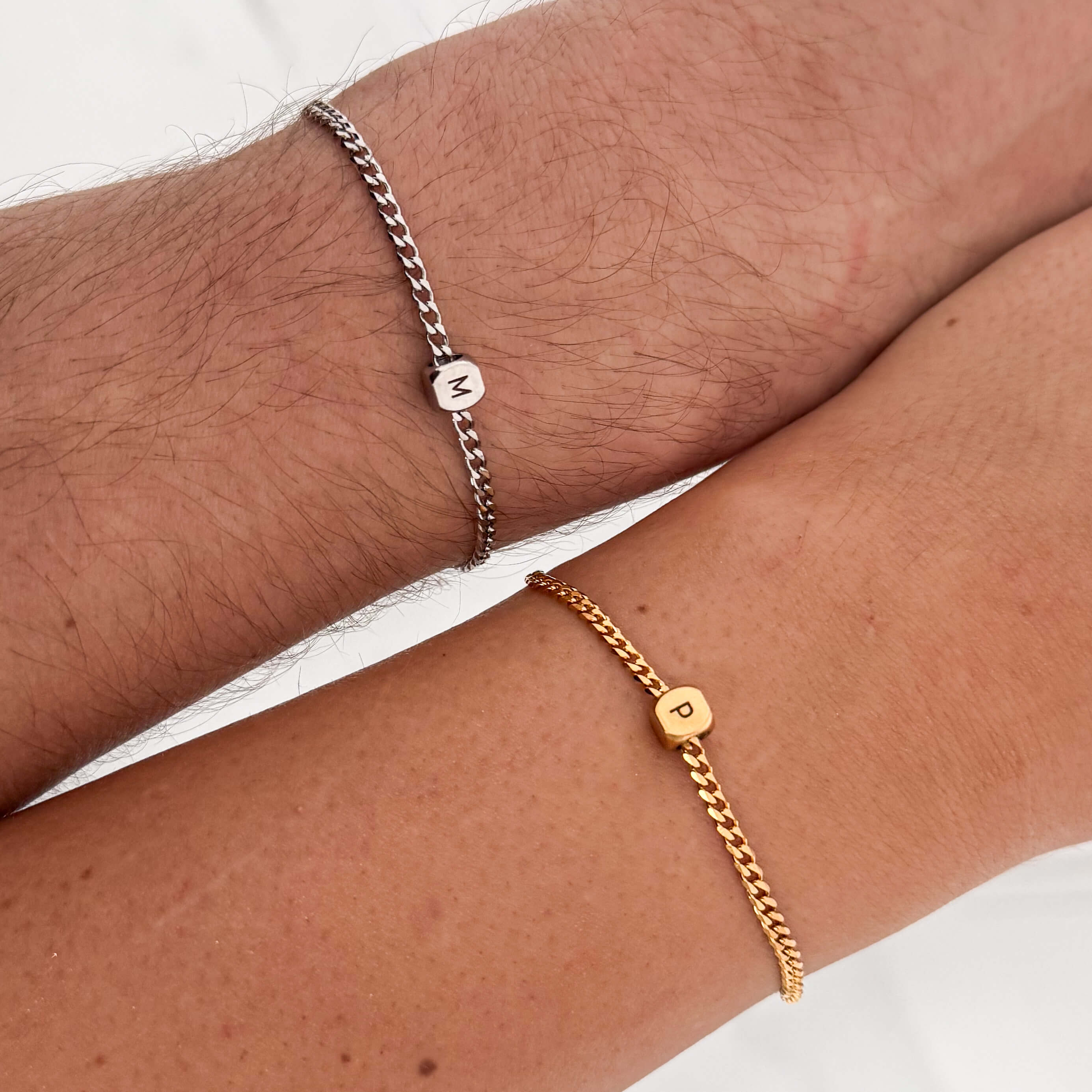 Minimalistyczna forma sprawia, że bransoletki pasują zarówno na co dzień, jak i do eleganckich stylizacji. Delikatna kostka z grawerem pozwala umieścić inicjał, literę lub symbol ważny tylko dla Was. Każdy komplet wykonywany jest na zamówienie, dzięki czemu staje się wyjątkową pamiątką relacji, wspólnej historii lub ważnego etapu w życiu.