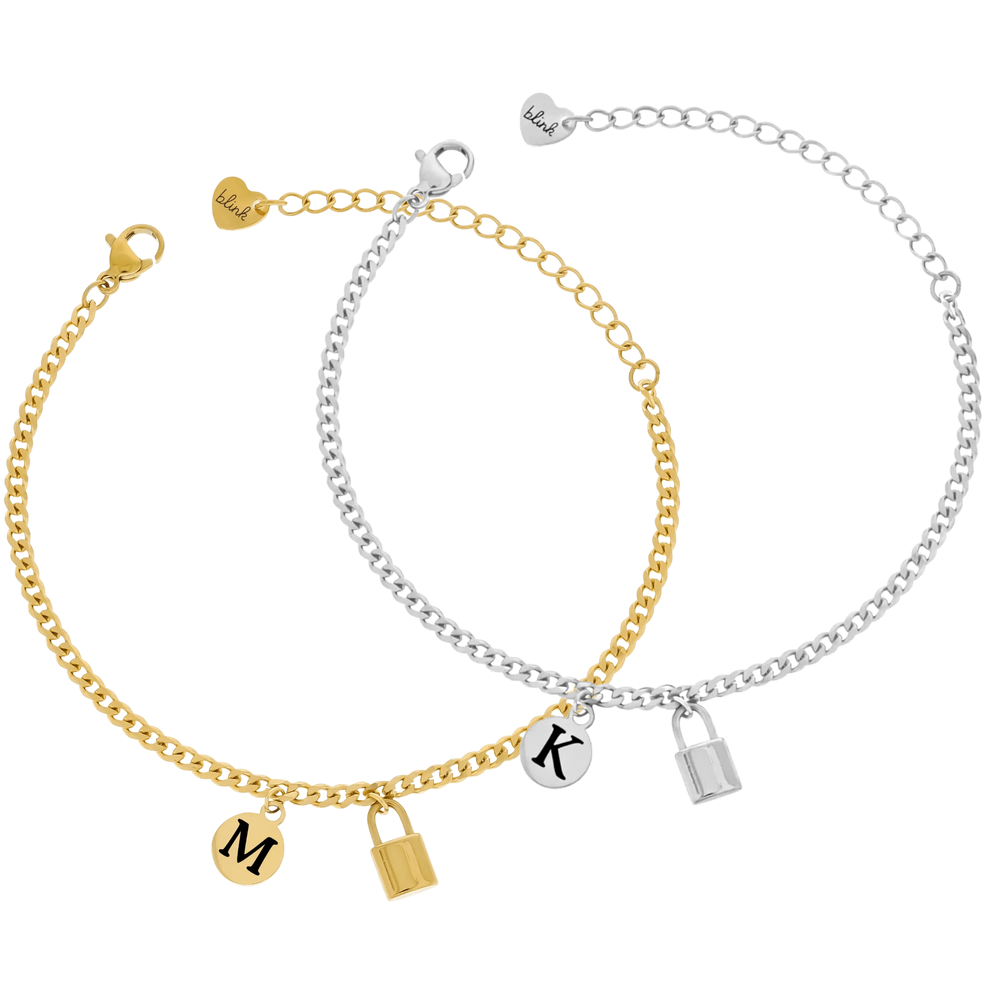 KOMPLET BRANSOLETEK DLA PARY Z GRAWEREM INICJAŁÓW I KŁÓDKĄ SYMBOL MIŁOŚCI