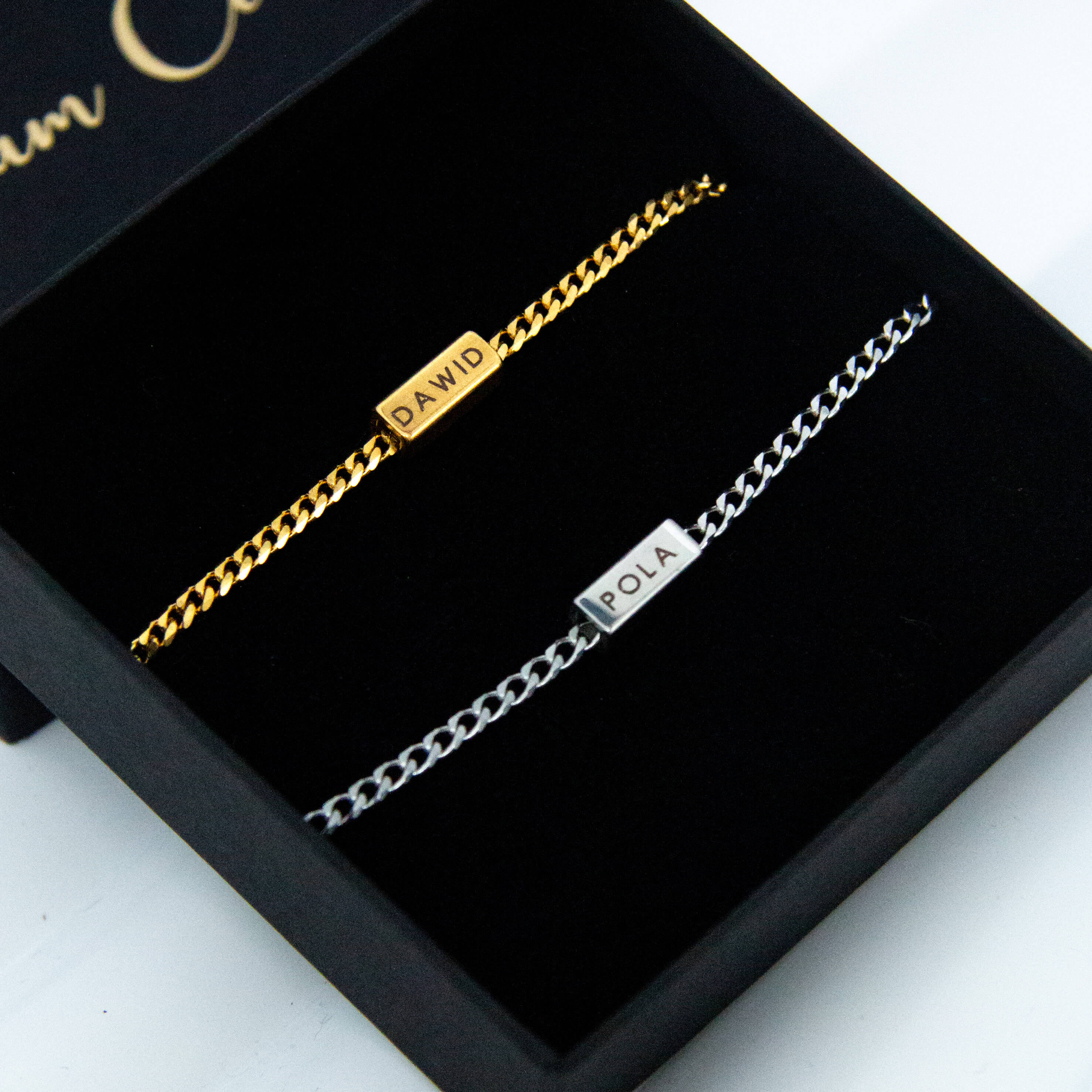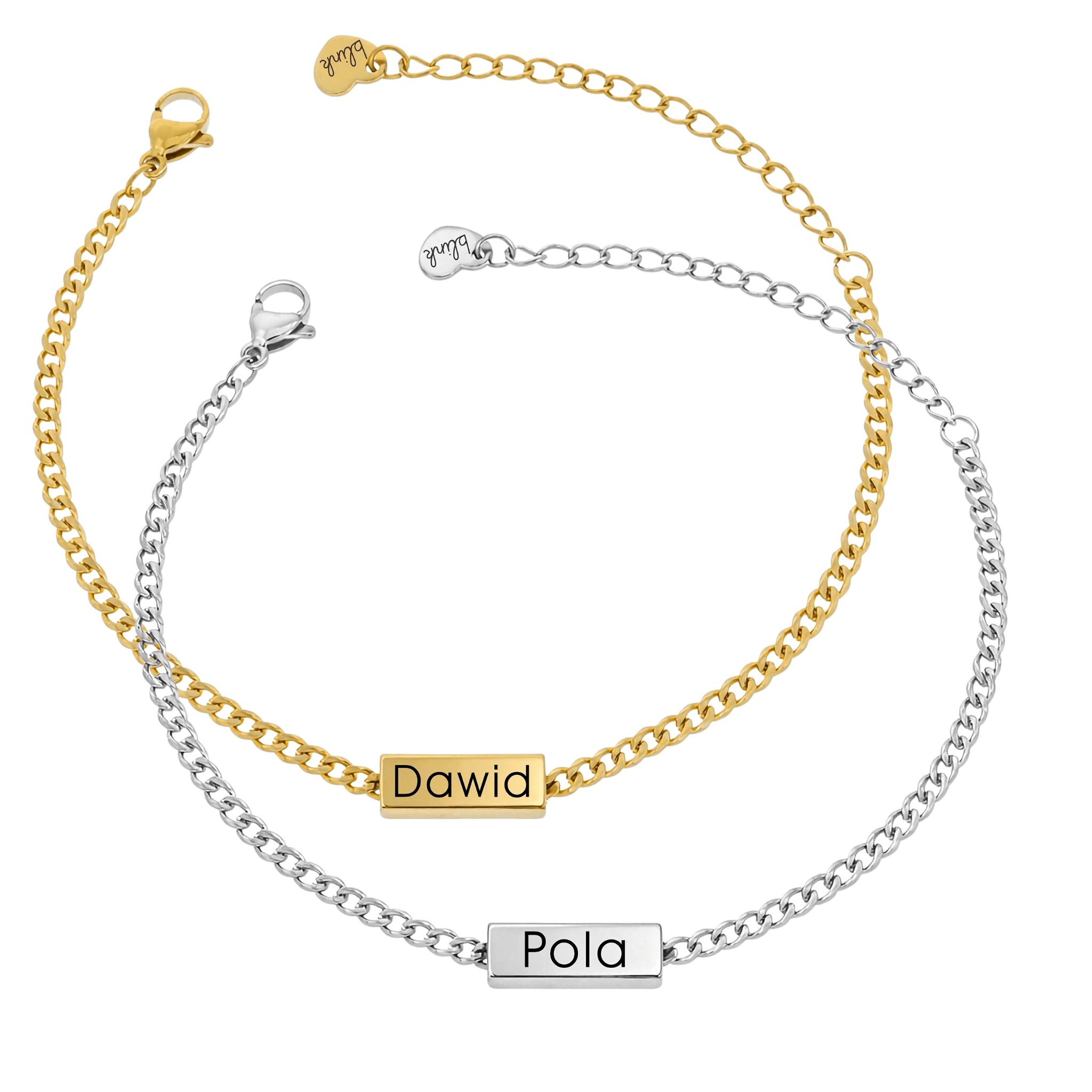 Każda z nich posiada indywidualny grawer imienia lub słowa, dzięki czemu komplet staje się wyjątkowo osobisty. To idealny wybór dla par, które chcą nosić przy sobie subtelny znak relacji. Minimalistyczny design sprawia, że bransoletki pasują zarówno do codziennych stylizacji, jak i eleganckich okazji.
