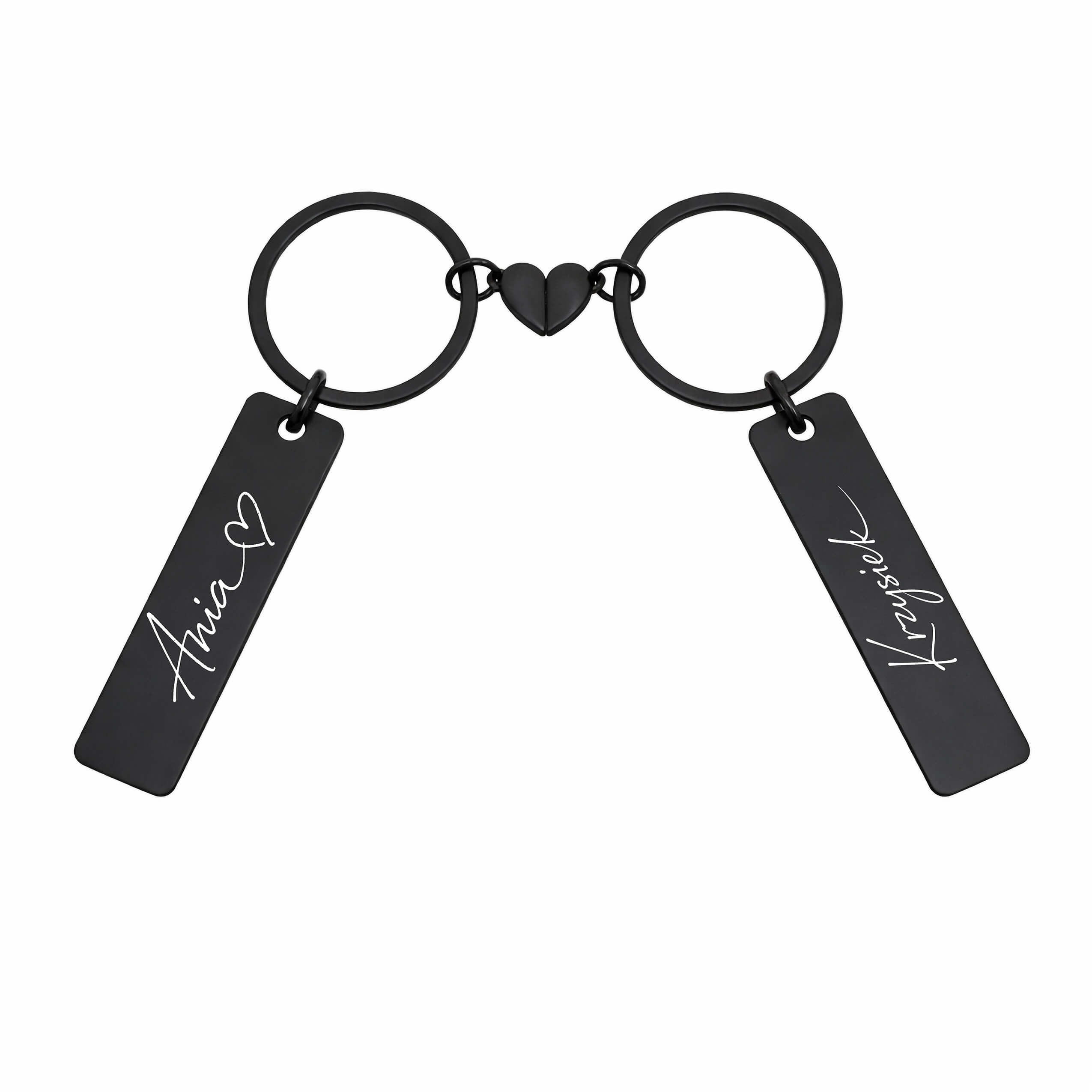 KOMPLET BRELOKÓW DLA PAR KOLOR CZARNY GRAWER - ODRĘCZNIE PISANE IMIONA MAGNETYCZNE SERCE