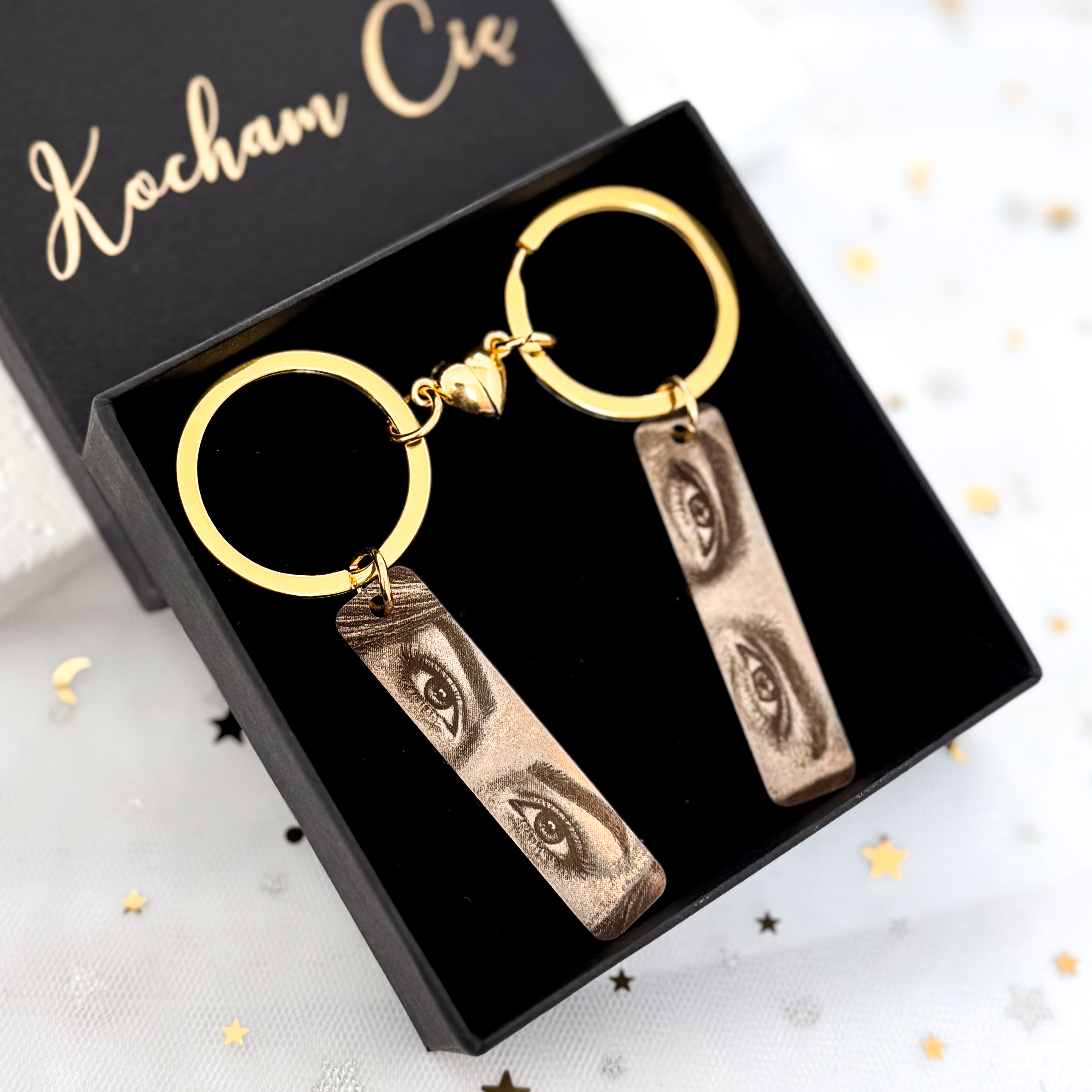 KOMPLET BRELOKÓW DLA PARY KOLOR ZŁOTY GRAWER OCZU W TECHNICE MONEY PRINT + MAGNETYCZNE SERCE