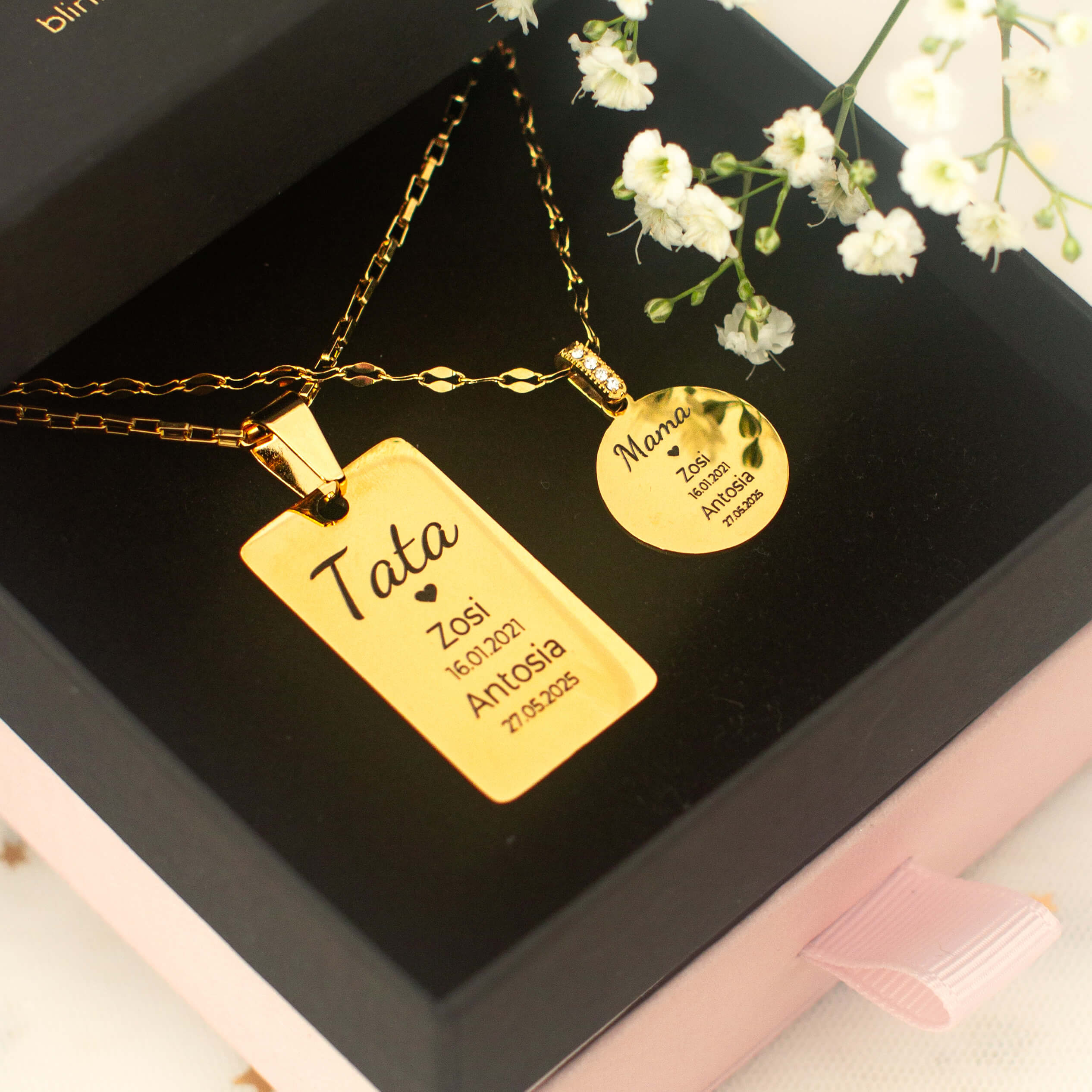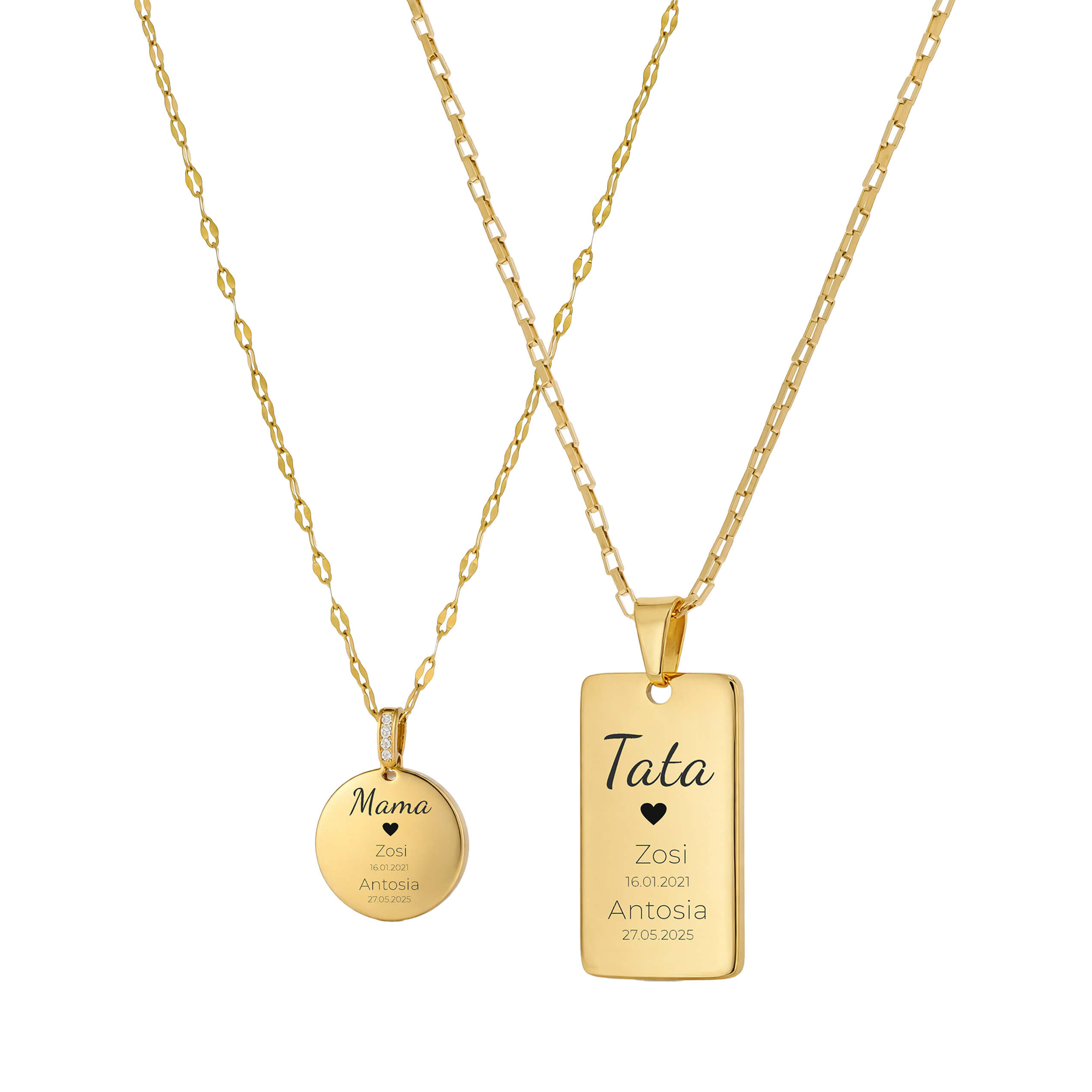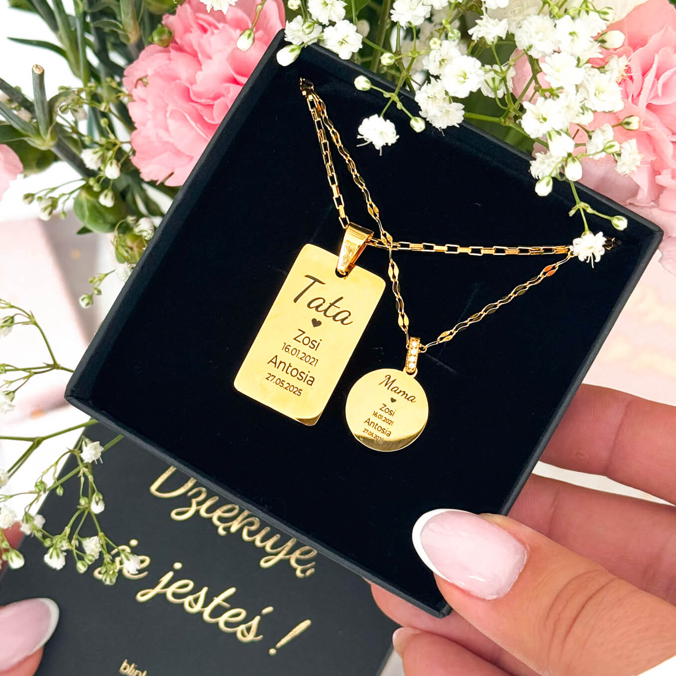 Zestaw składa się z dwóch zawieszek: subtelnej, okrągłej dla mamy oraz klasycznej, prostokątnej dla taty. Każda z nich ozdobiona jest grawerem imion dzieci oraz ważnych dat, tworząc wyjątkową i osobistą pamiątkę na lata.