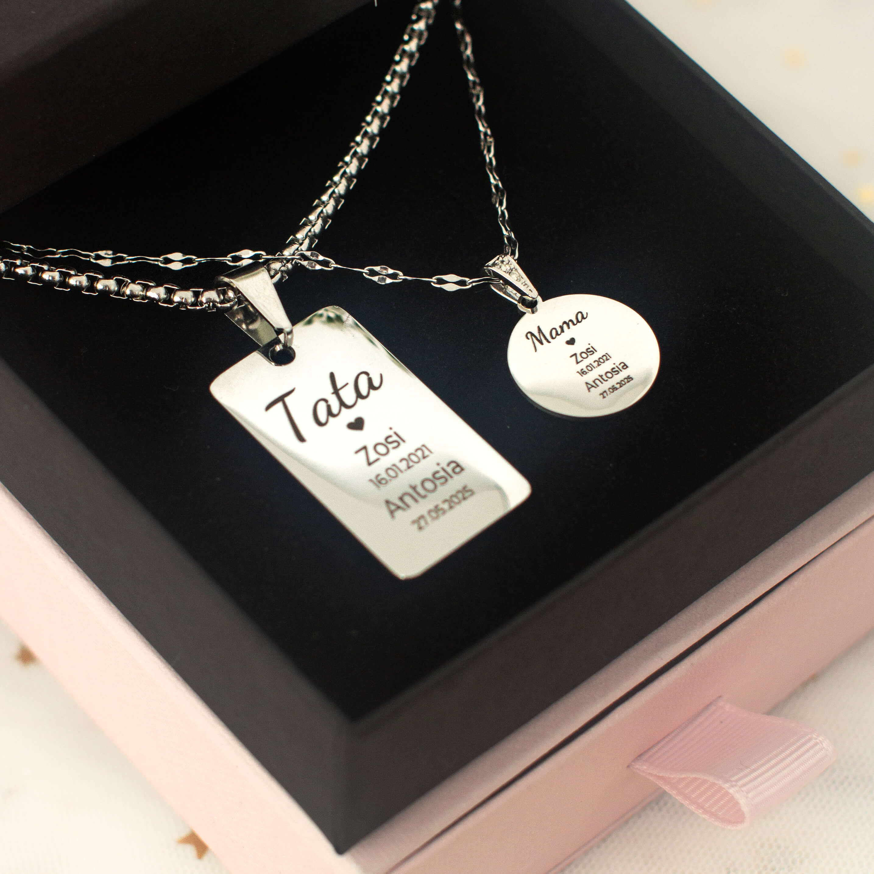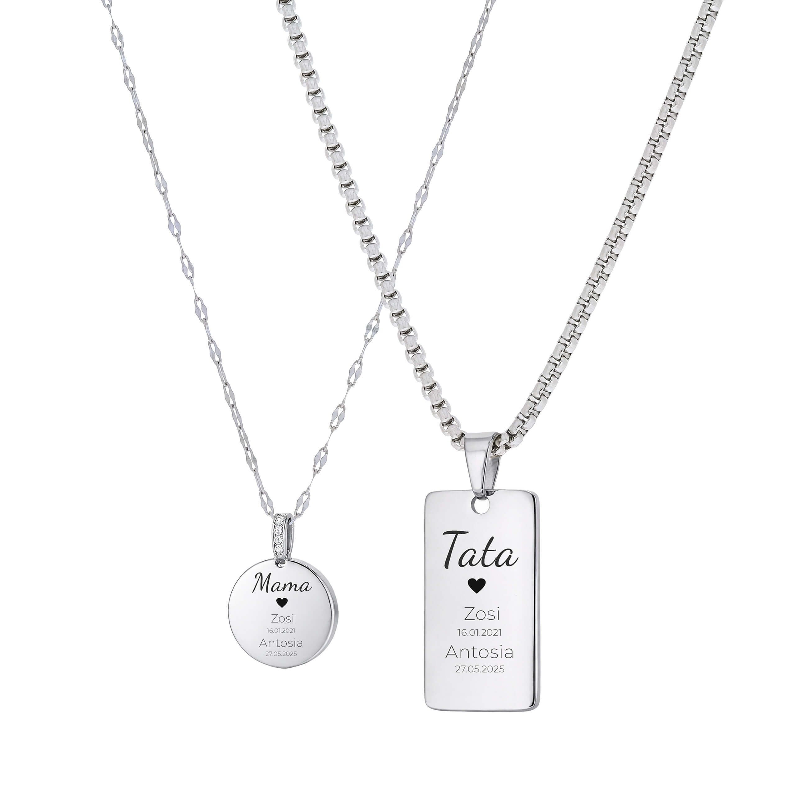 Zestaw składa się z dwóch zawieszek: subtelnej, okrągłej dla mamy oraz klasycznej, prostokątnej dla taty. Każda z nich ozdobiona jest grawerem imion dzieci oraz ważnych dat, tworząc wyjątkową i osobistą pamiątkę na lata.