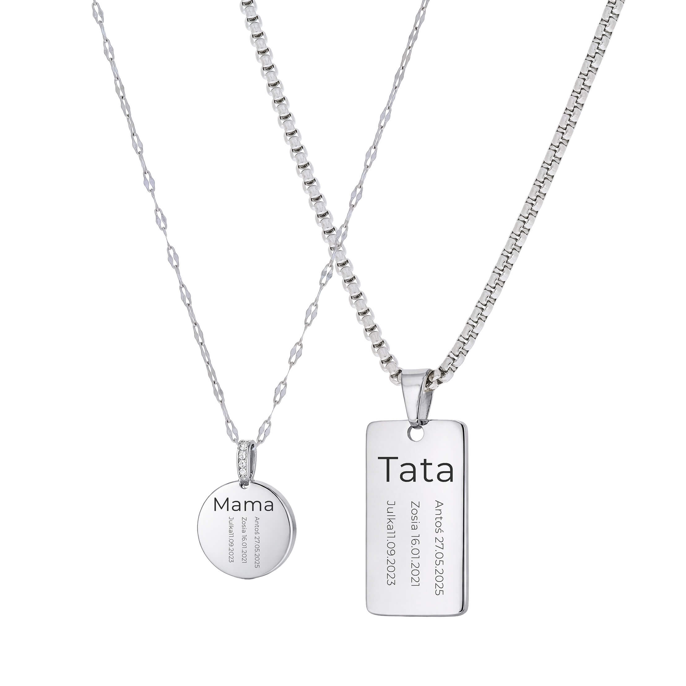 KOMPLET NASZYJNIKÓW DLA MAMY I TATY PERSONALIZOWANY PREZENT Z IMIONAMI DZIECI I DATAMI