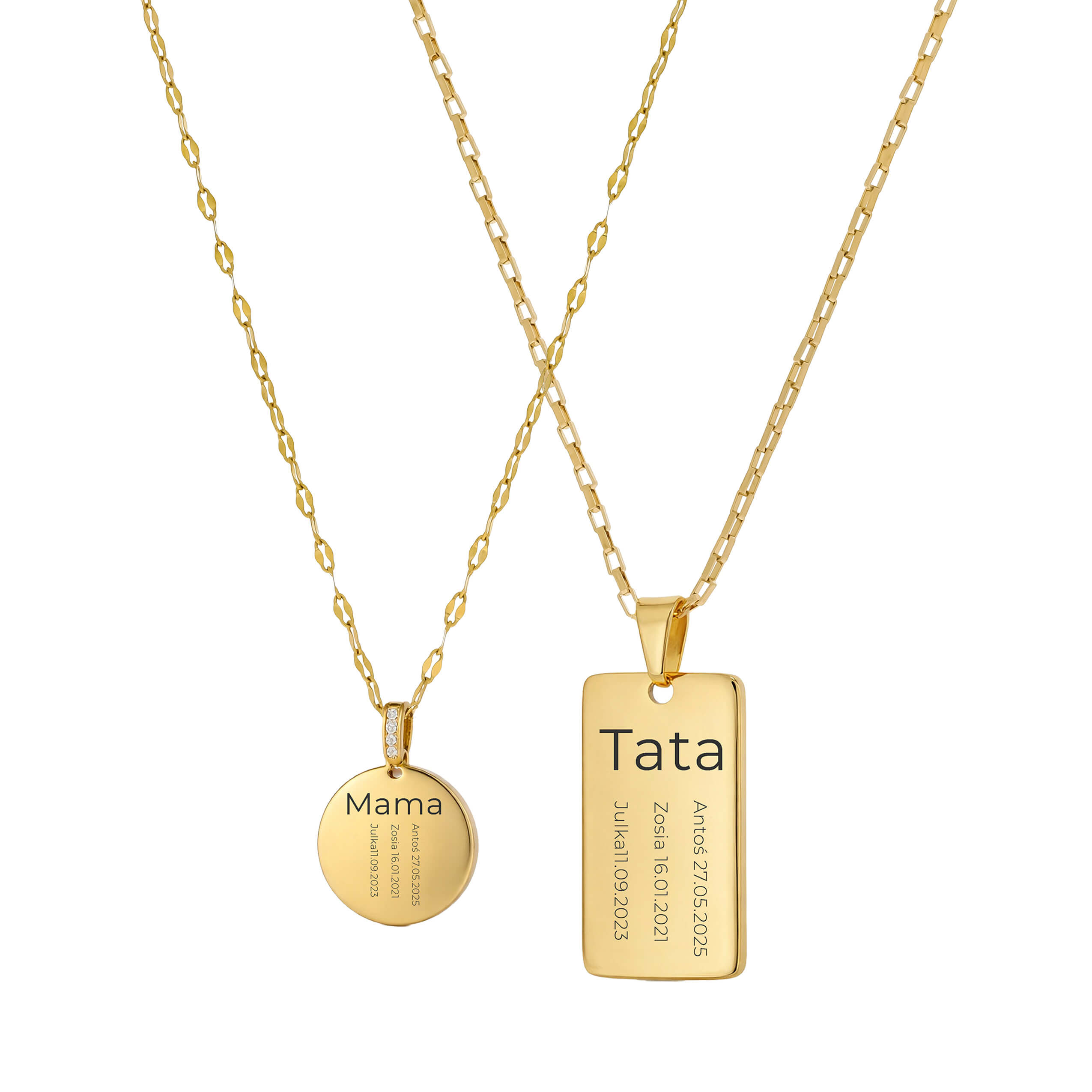 KOMPLET ZŁOTYCH NASZYJNIKÓW DLA MAMY I TATY PERSONALIZOWANY PREZENT Z IMIONAMI DZIECI I DATAMI