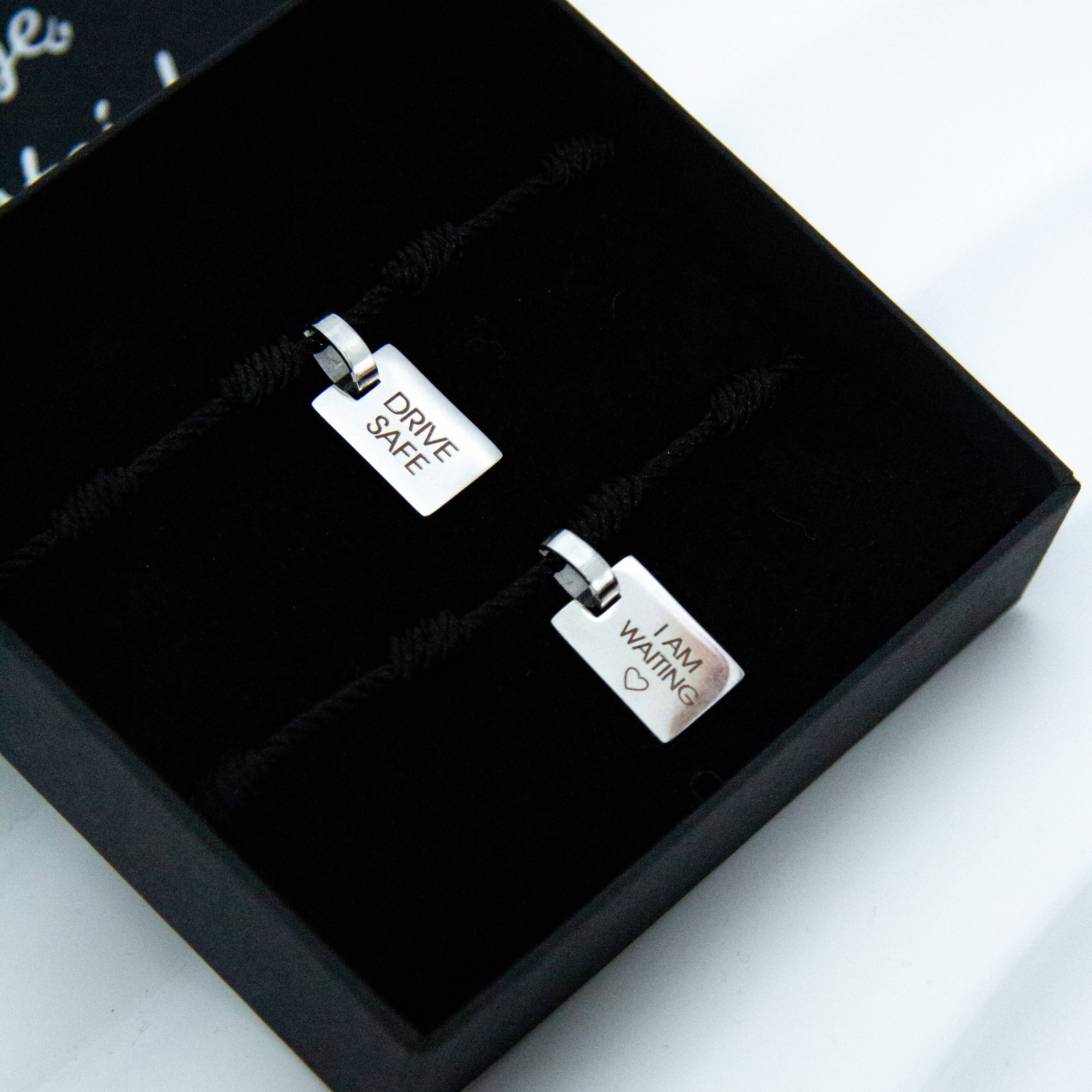 Komplet personalizowanych bransoletek dla pary z grawerem „Drive Safe” oraz „I Am Waiting” to symbol więzi, która trwa nawet wtedy, gdy dzieli Was odległość. Idealny prezent dla zakochanych, par na odległość, małżeństw lub jako wyjątkowy upominek bez okazji.