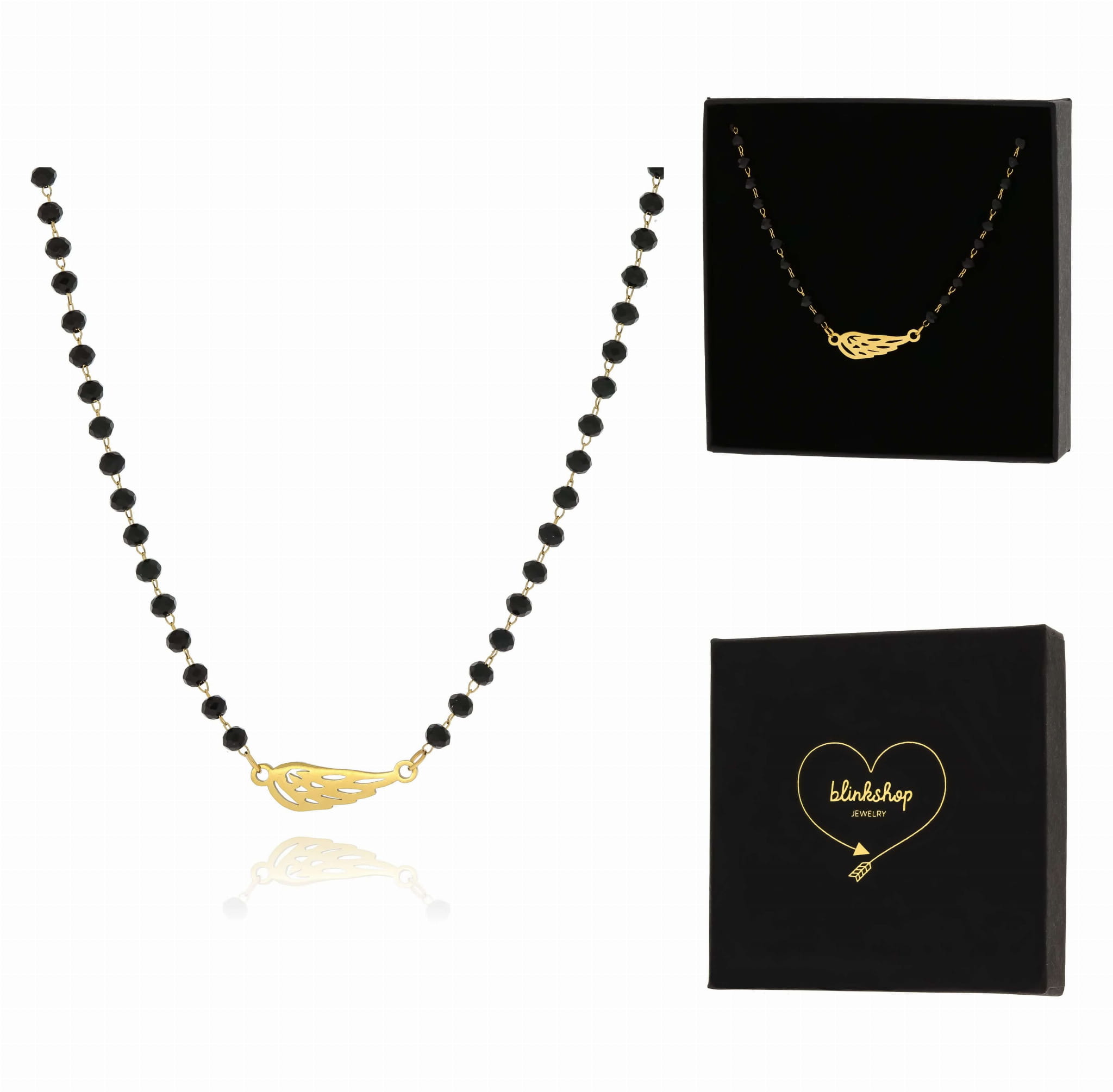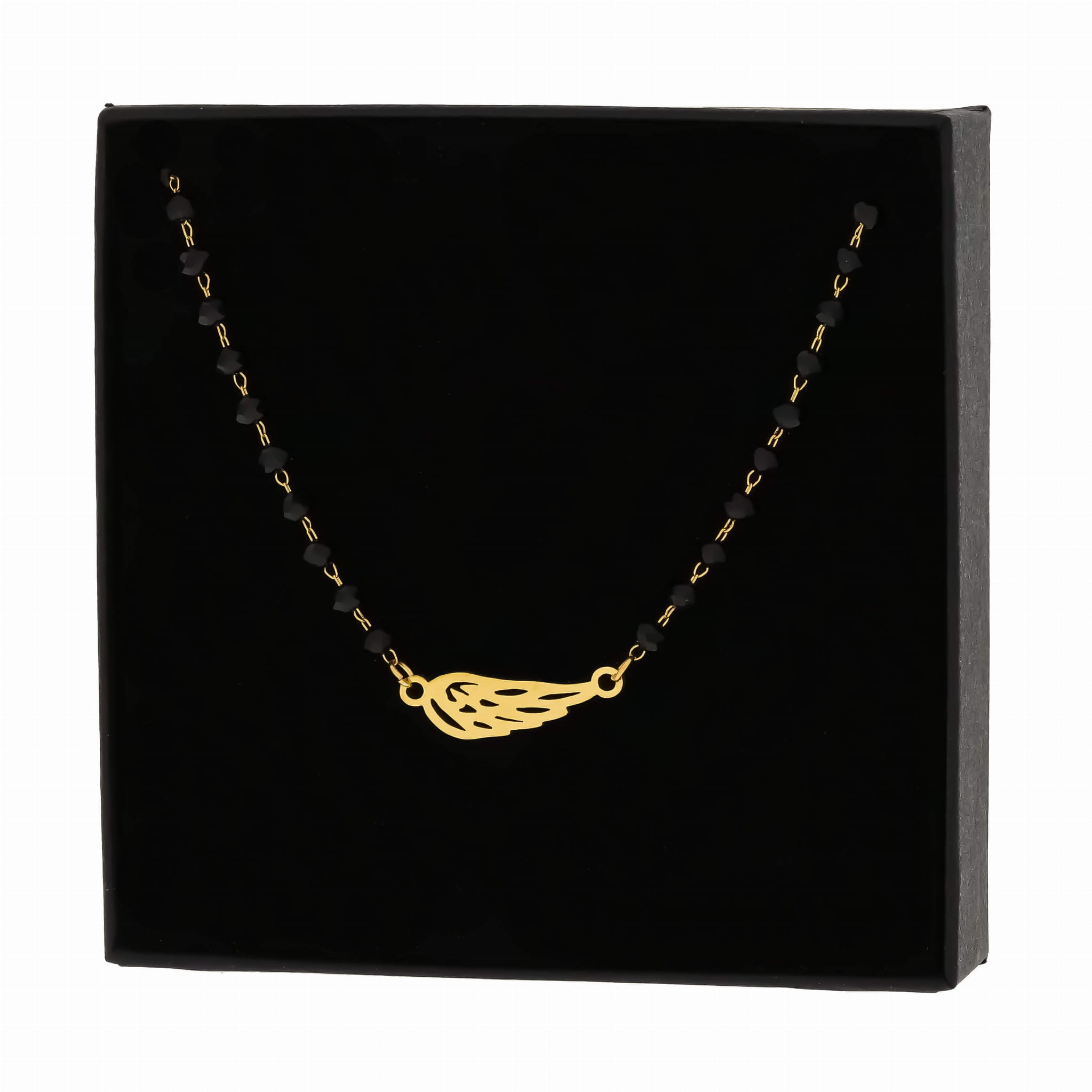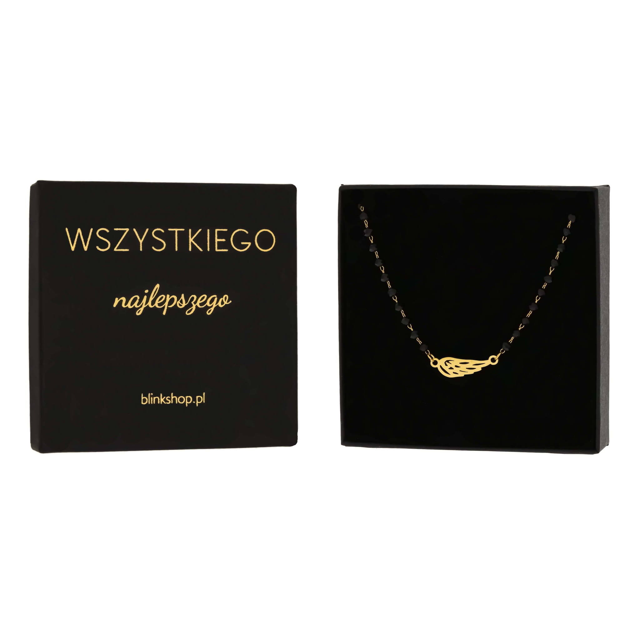 NASZYJNIK CZARNE KORALIKI CELEBRYTKA ZE SKRZYDEŁKIEM STAL CHIRURGICZNA
