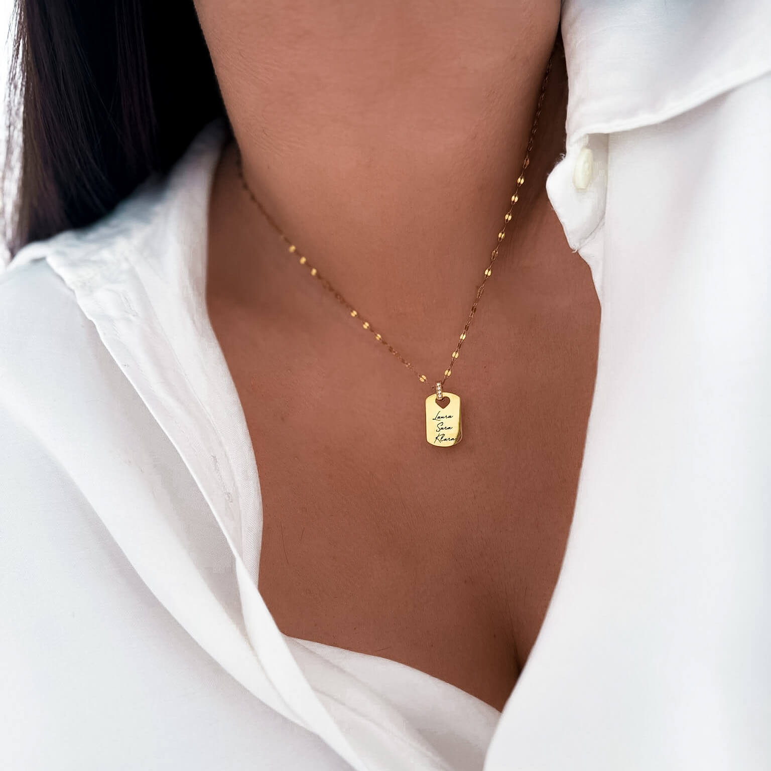 Minimalistyczny, elegancki i pełen znaczenia. Ten naszyjnik łączy w sobie prostotę formy z ogromem emocji. Delikatna blaszka z napisem „Mama” oraz imionami dzieci to subtelny sposób, by mieć swoich najbliższych zawsze przy sobie. Dzięki swojej formie pasuje do wszystkiego – od codziennych stylizacji po wyjątkowe okazje. To biżuteria, która nie krzyczy – ale mówi wszystko.