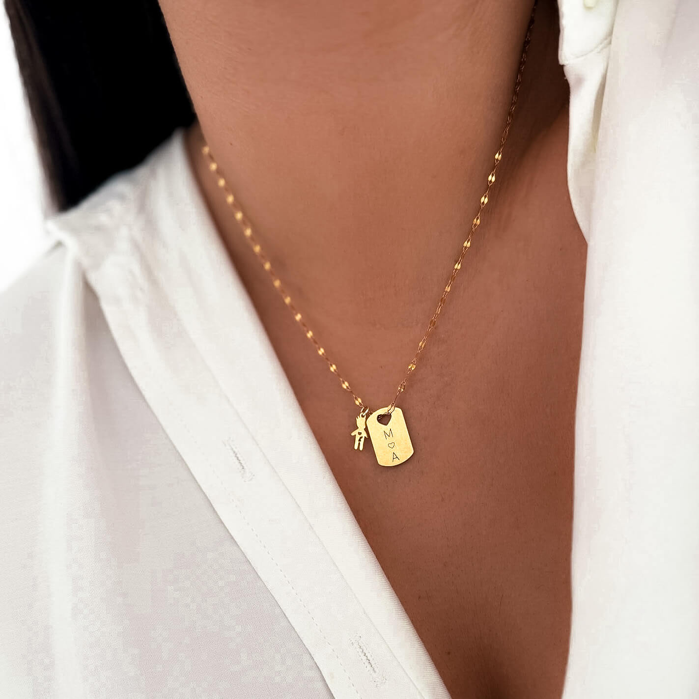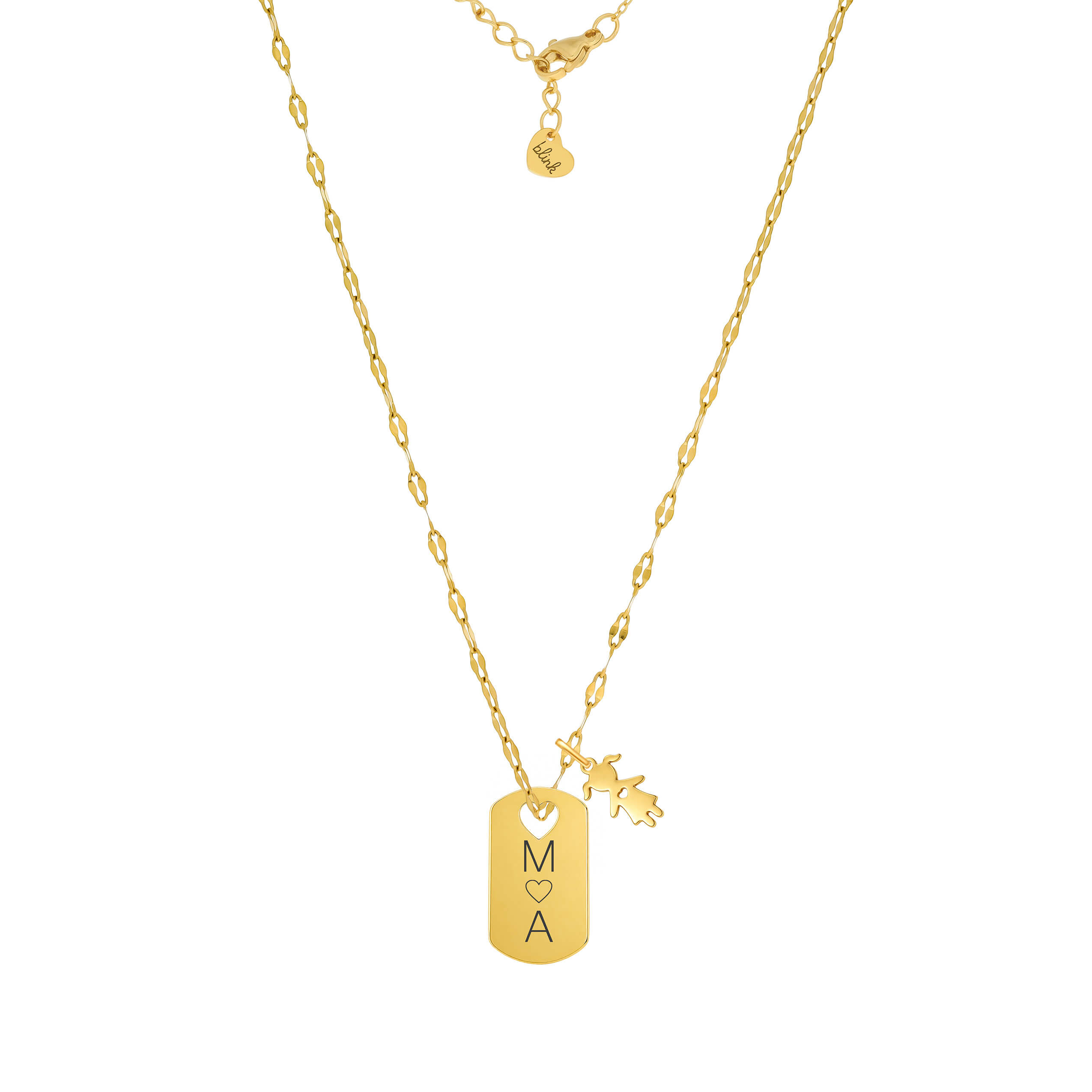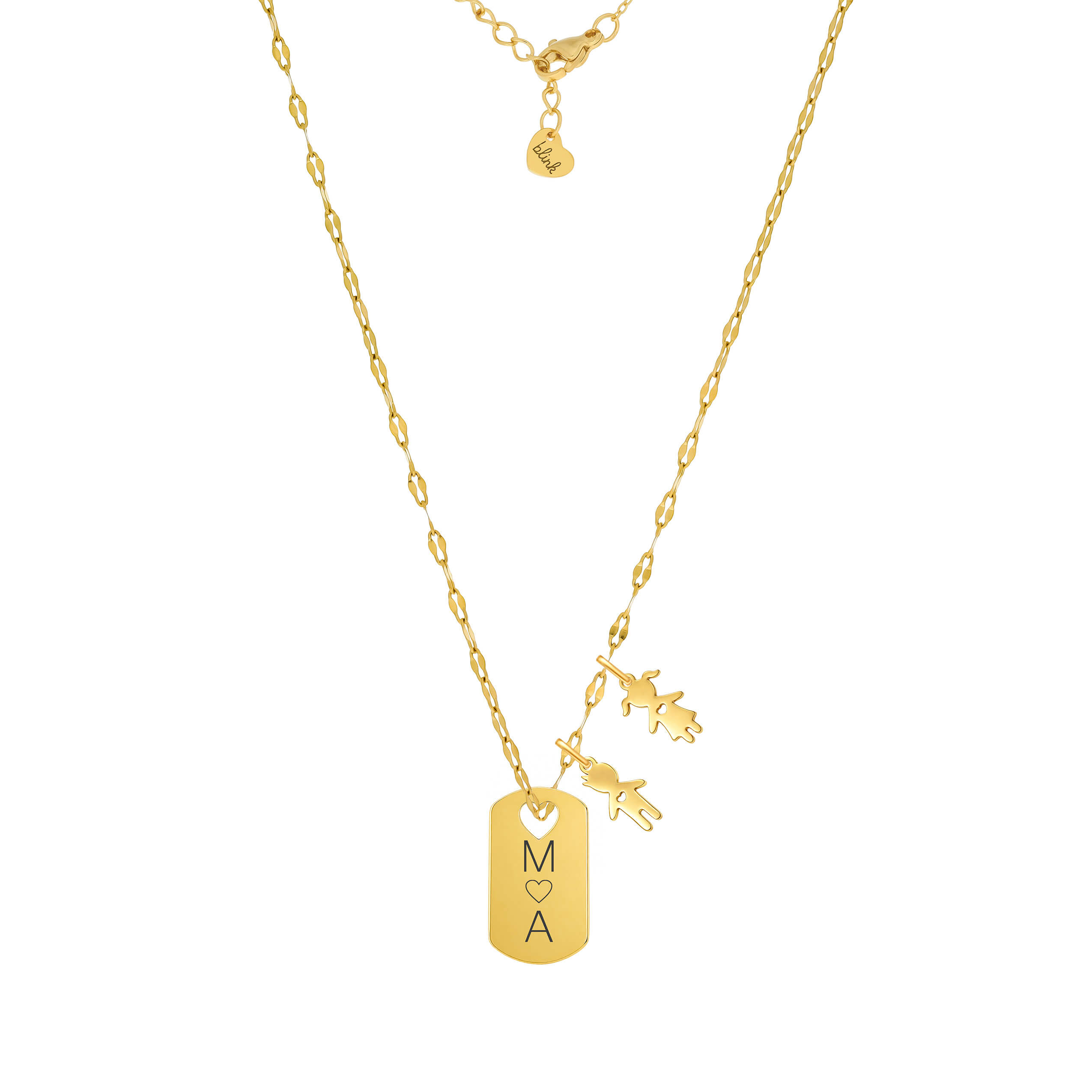 Minimalistyczny nieśmiertelnik z napisem „M ♥ A” symbolizuje najważniejszą rolę – bycie mamą. Dodatkowe zawieszki w kształcie dzieci tworzą piękną, osobistą historię, którą możesz mieć zawsze przy sobie.