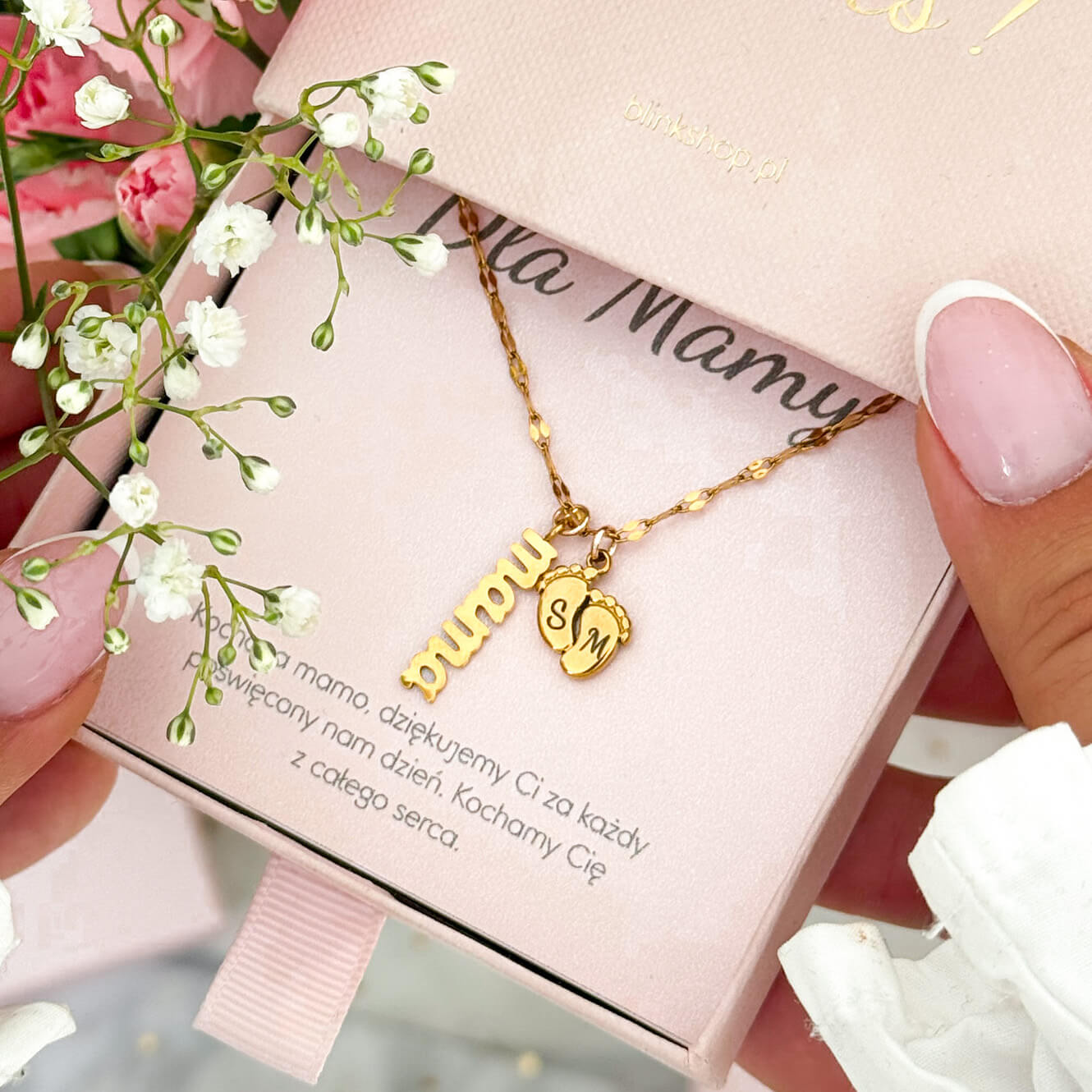 Wyjątkowy naszyjnik dla mamy, który łączy w sobie symbol miłości i najpiękniejszych chwil. Delikatny napis „mama” w połączeniu z zawieszką w kształcie dziecięcych stópek tworzy niezwykle osobistą i wzruszającą kompozycję. Na stópkach można wykonać grawer inicjałów dziecka lub dzieci, dzięki czemu biżuteria staje się niepowtarzalną pamiątką na całe życie.