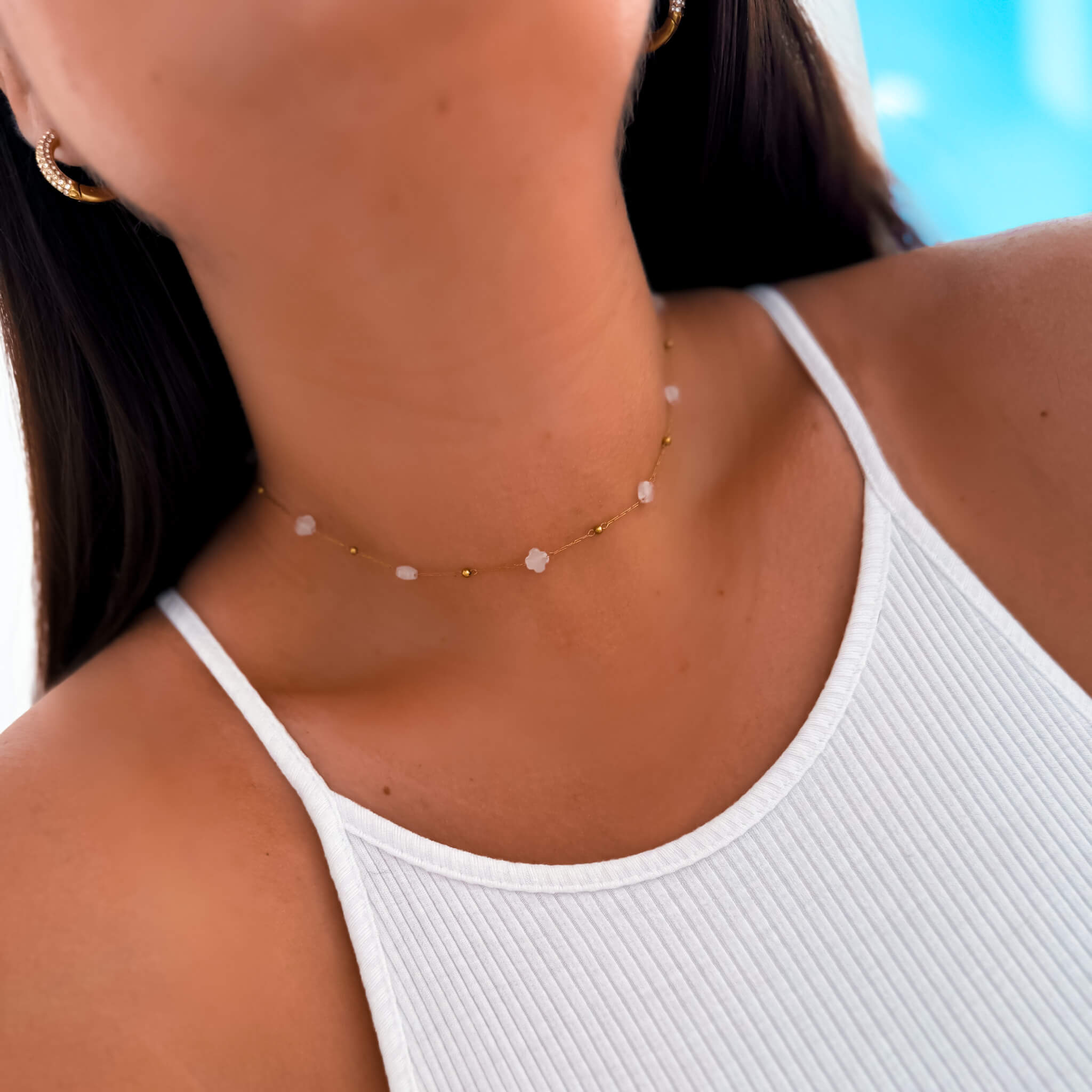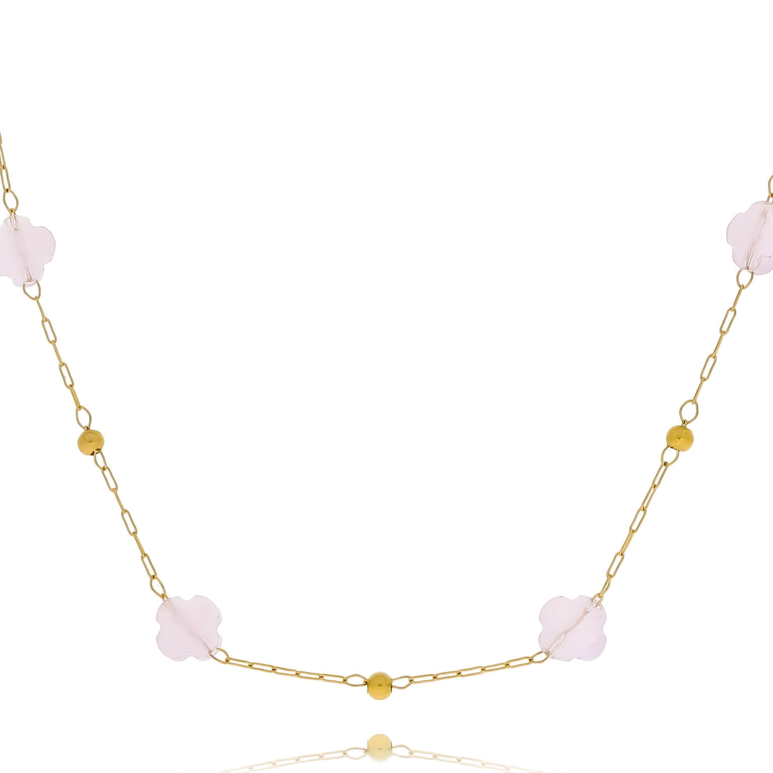 Wykonany z wysokogatunkowej stali chirurgicznej 316L, naszyjnik jest odporny na zarysowania, nie ciemnieje i nie uczula, dzięki czemu możesz cieszyć się jego pięknem przez długi czas. Pozłacane wykończenie dodaje mu elegancji i sprawia, że prezentuje się luksusowo, a różowe kryształki w kształcie kwiatuszków subtelnie odbijają światło, nadając lekkości i kobiecego uroku każdej stylizacji. Drobne złote koraliki umieszczone między kryształkami podkreślają delikatny charakter biżuterii i sprawiają, że naszyjnik wygląda niezwykle harmonijnie.