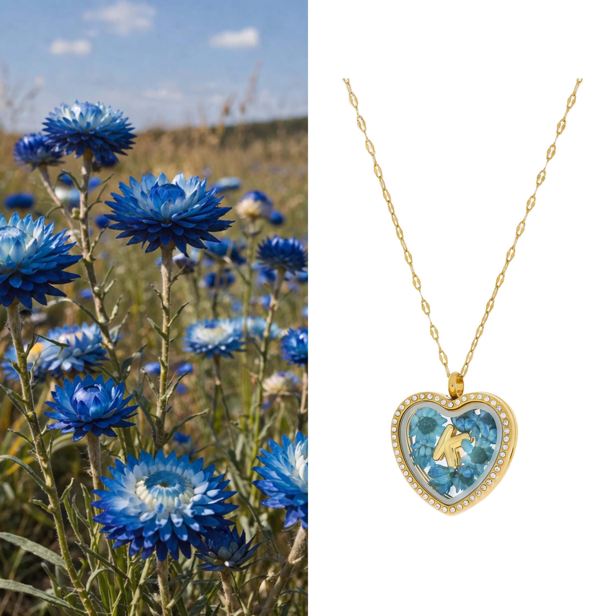 Wnętrze sekretnika wypełniają naturalne, suszone kwiaty gliksji w odcieniu niebieskim, inspirowane ich naturalnym wyglądem. Kompozycja przywodzi na myśl letnią łąkę i nadaje całości świeżości oraz lekkości. Dodatkowo obrzeże medalionu zdobią drobne kryształki, które pięknie odbijają światło i nadają biżuterii eleganckiego charakteru.