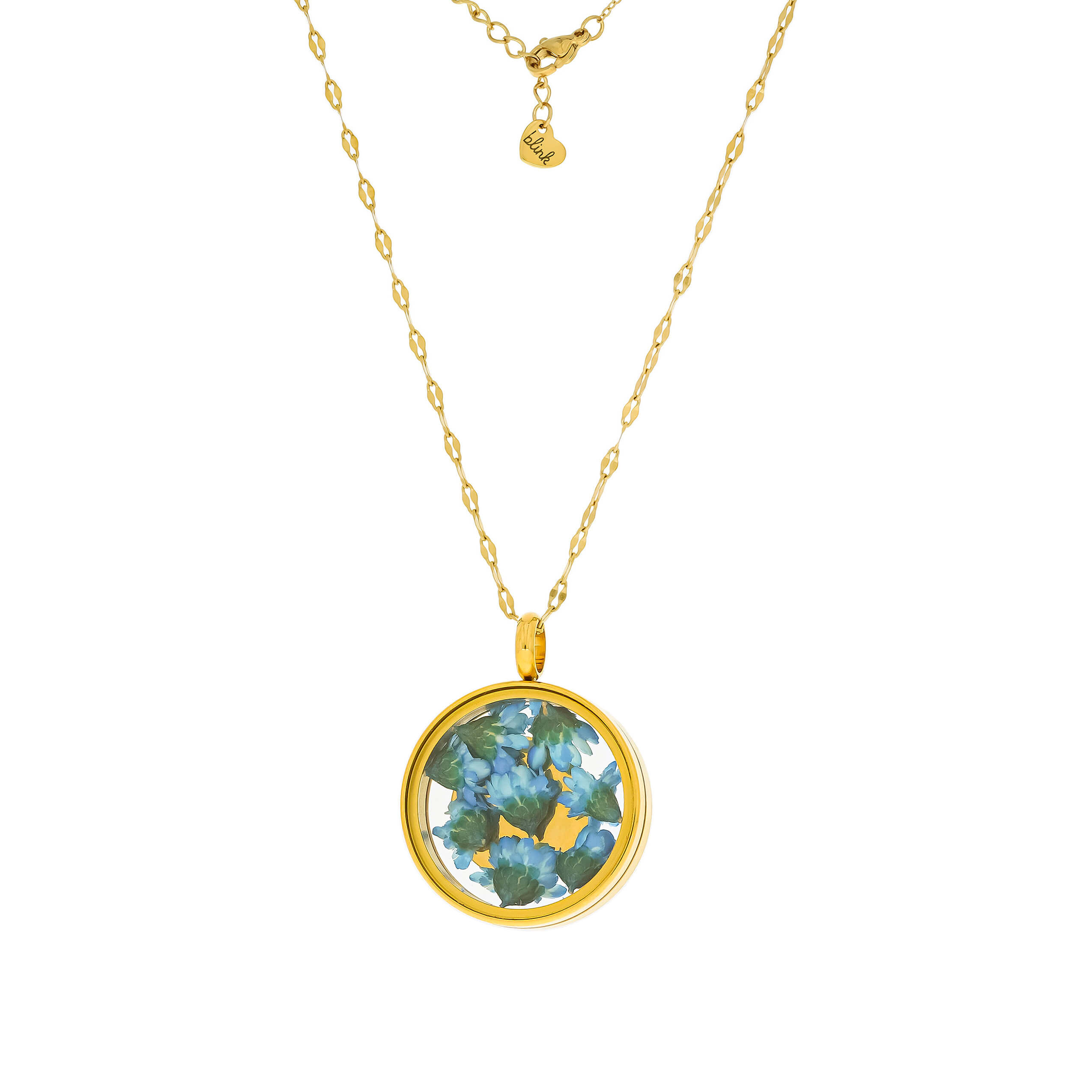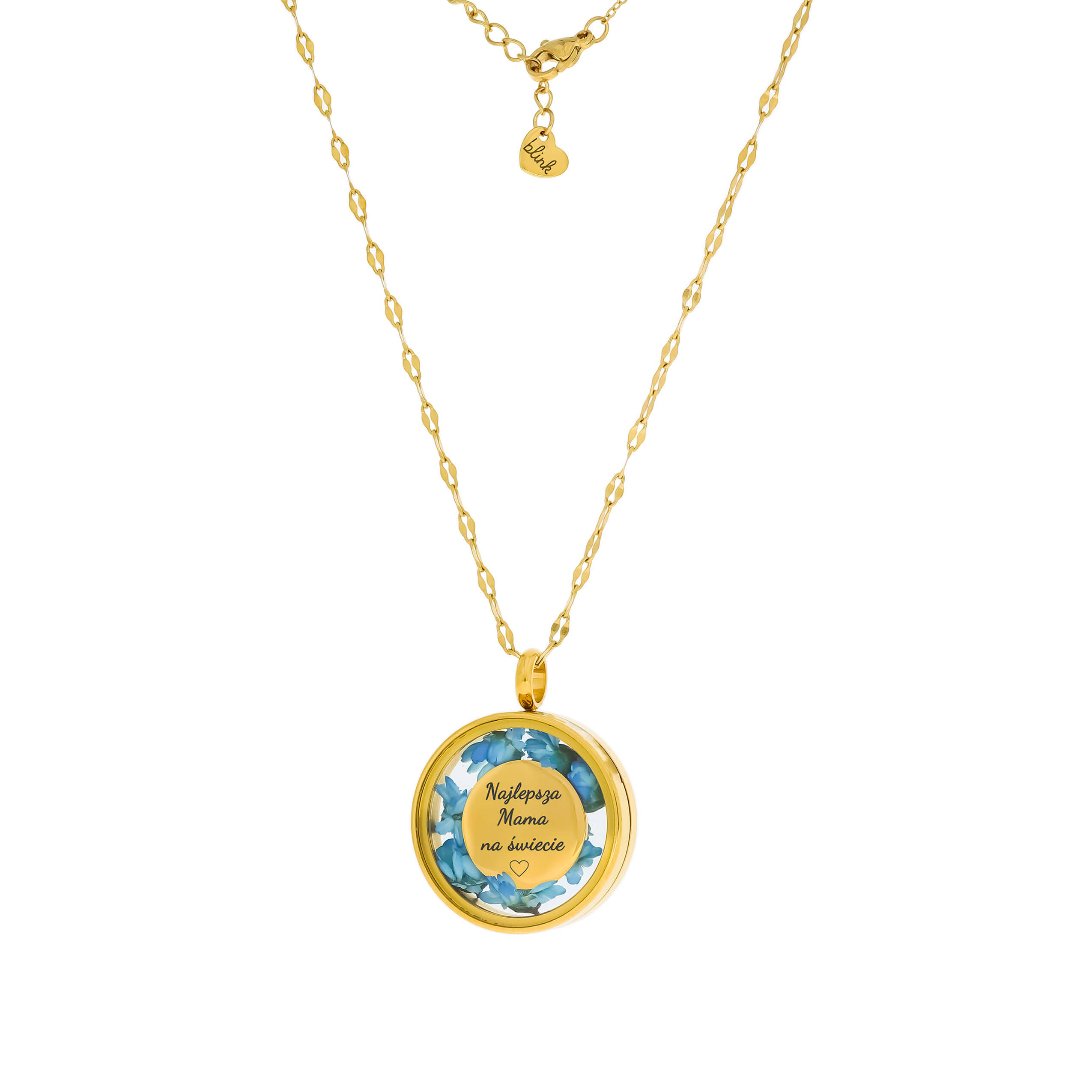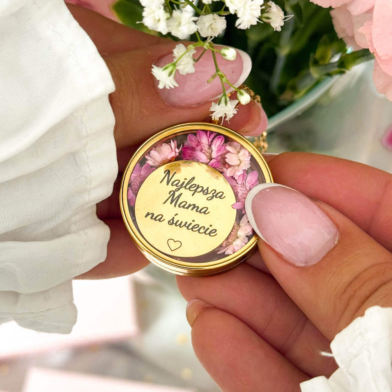 NASZYJNIK SEKRETNIK ZŁOTY Z SUSZONYMI KWIATAMI PREZENT DLA MAMY Z GRAWEREM IMION DZIECI