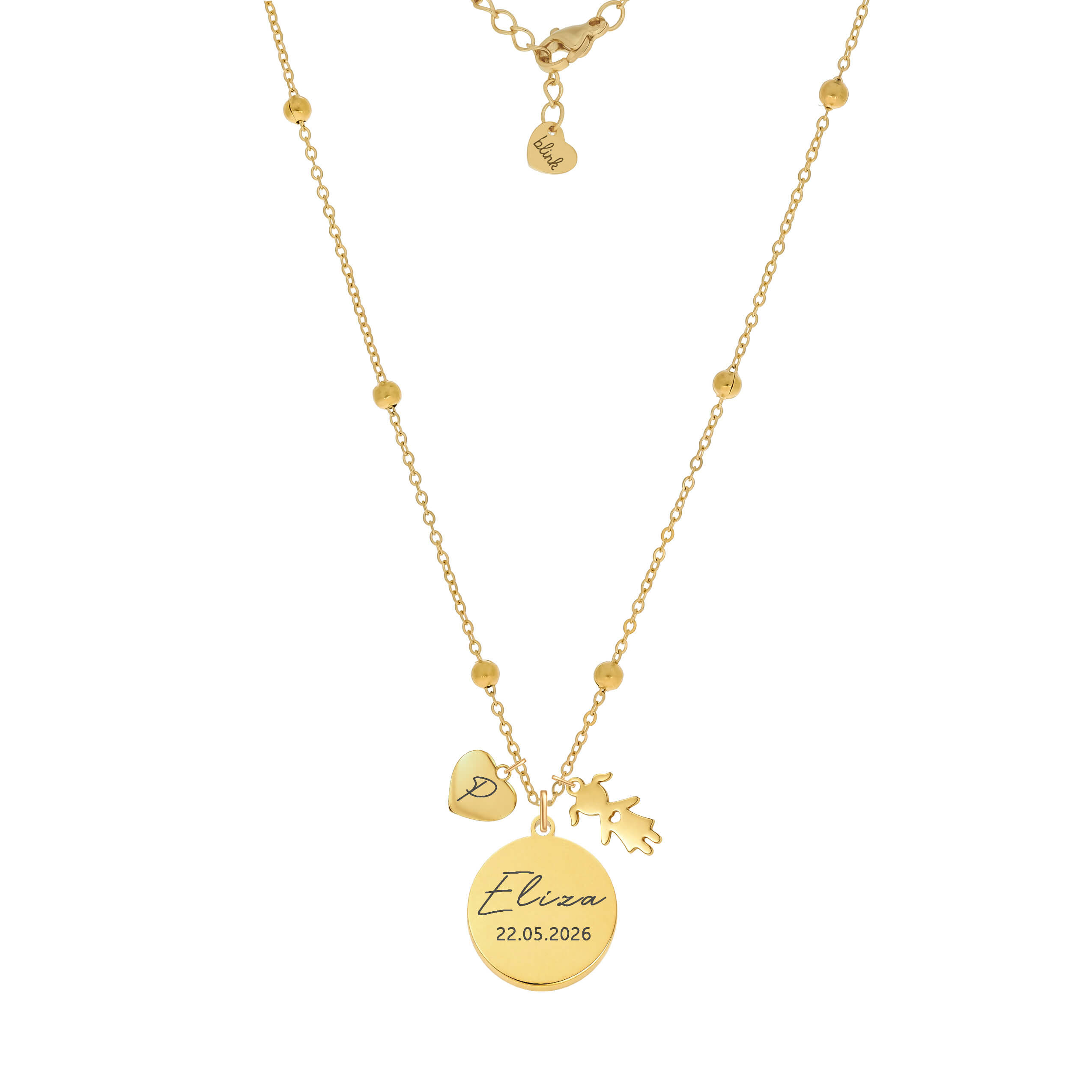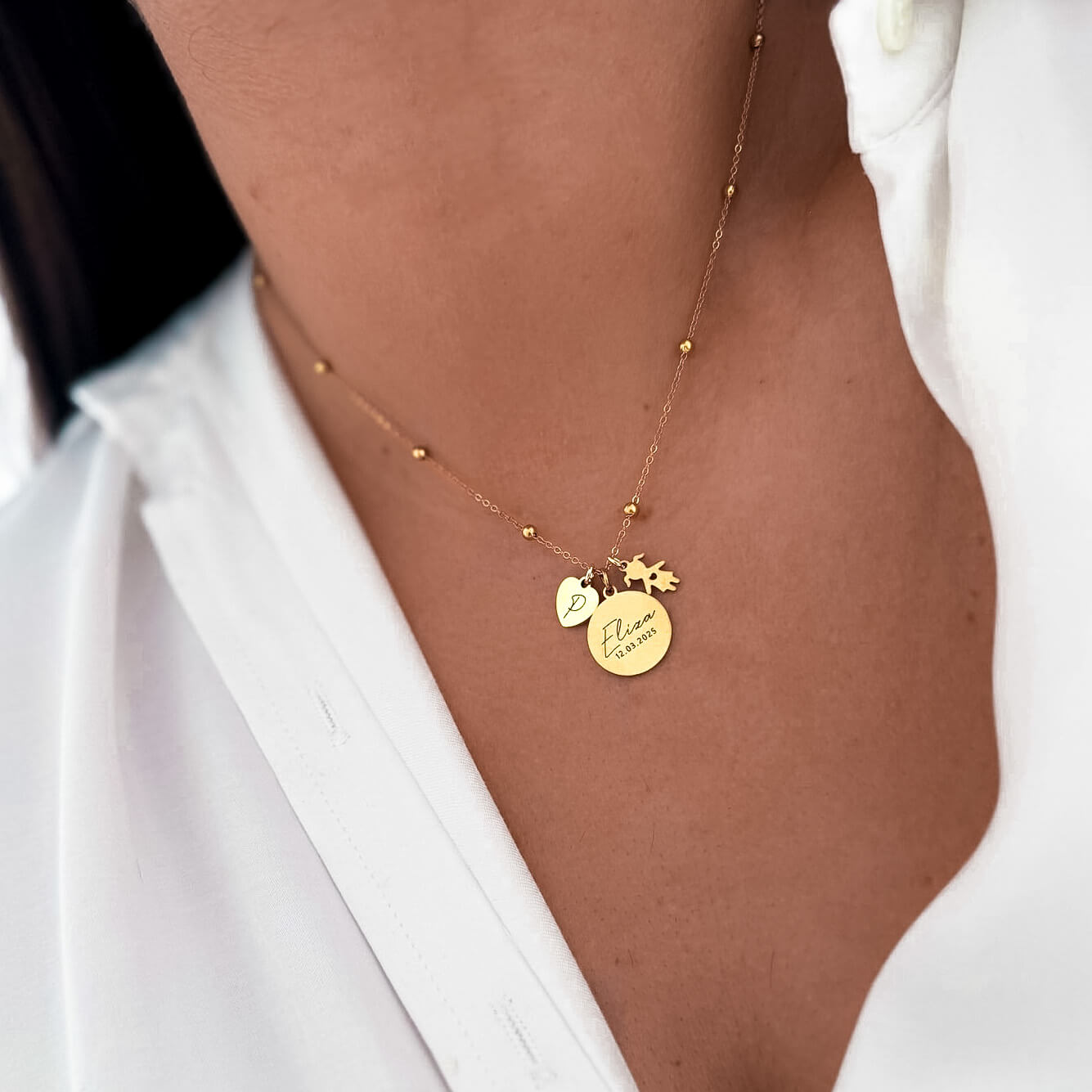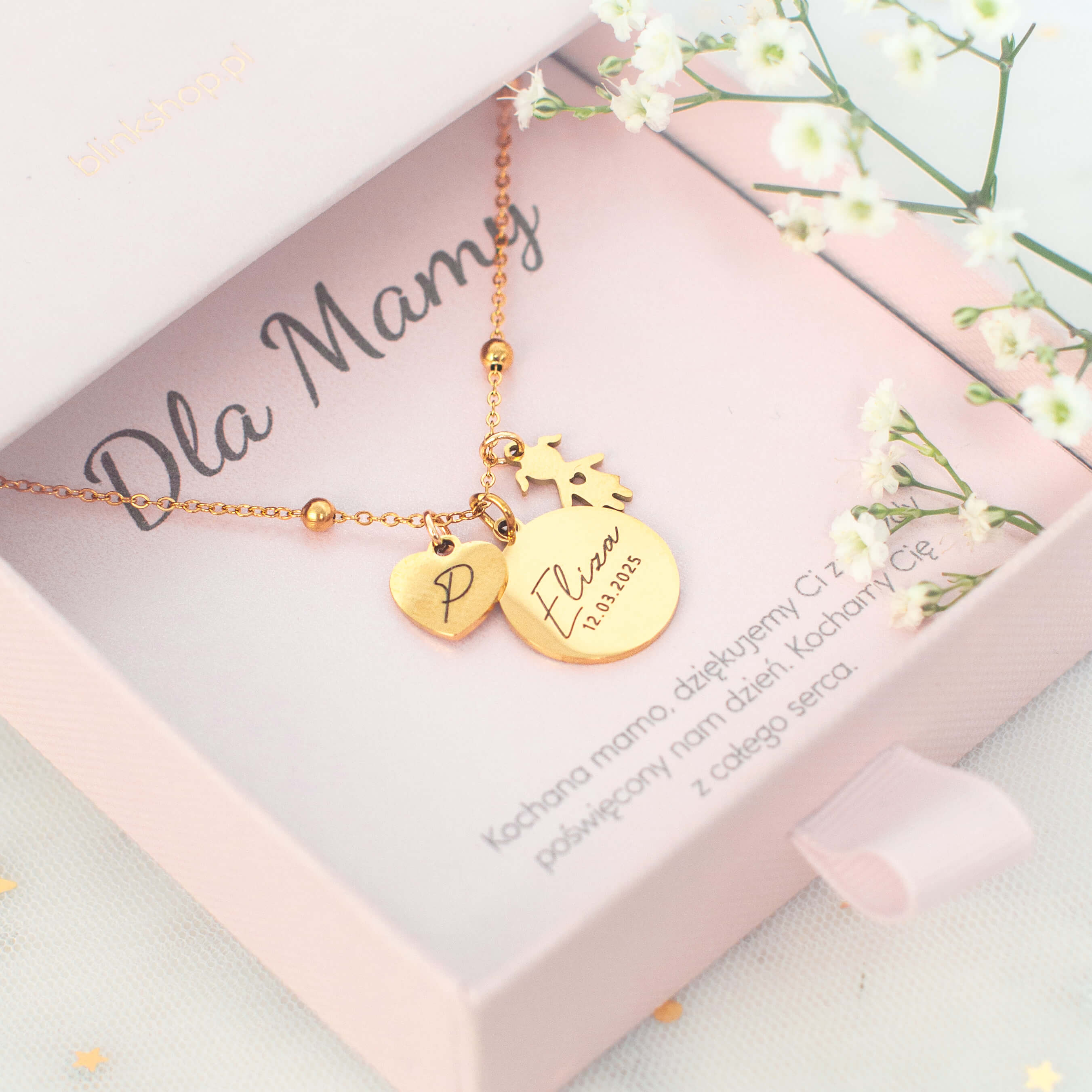 Wyjątkowa pamiątka najpiękniejszego dnia. Ten naszyjnik to sposób, by zatrzymać na zawsze moment narodzin dziecka. Imię i data urodzenia wygrawerowane na zawieszce tworzą osobistą historię, którą możesz nosić blisko serca każdego dnia. Dodatkowe zawieszki – serduszko z inicjałem oraz figurka dziecka – nadają całości wyjątkowego, symbolicznego charakteru. To idealny prezent dla świeżo upieczonej mamy.