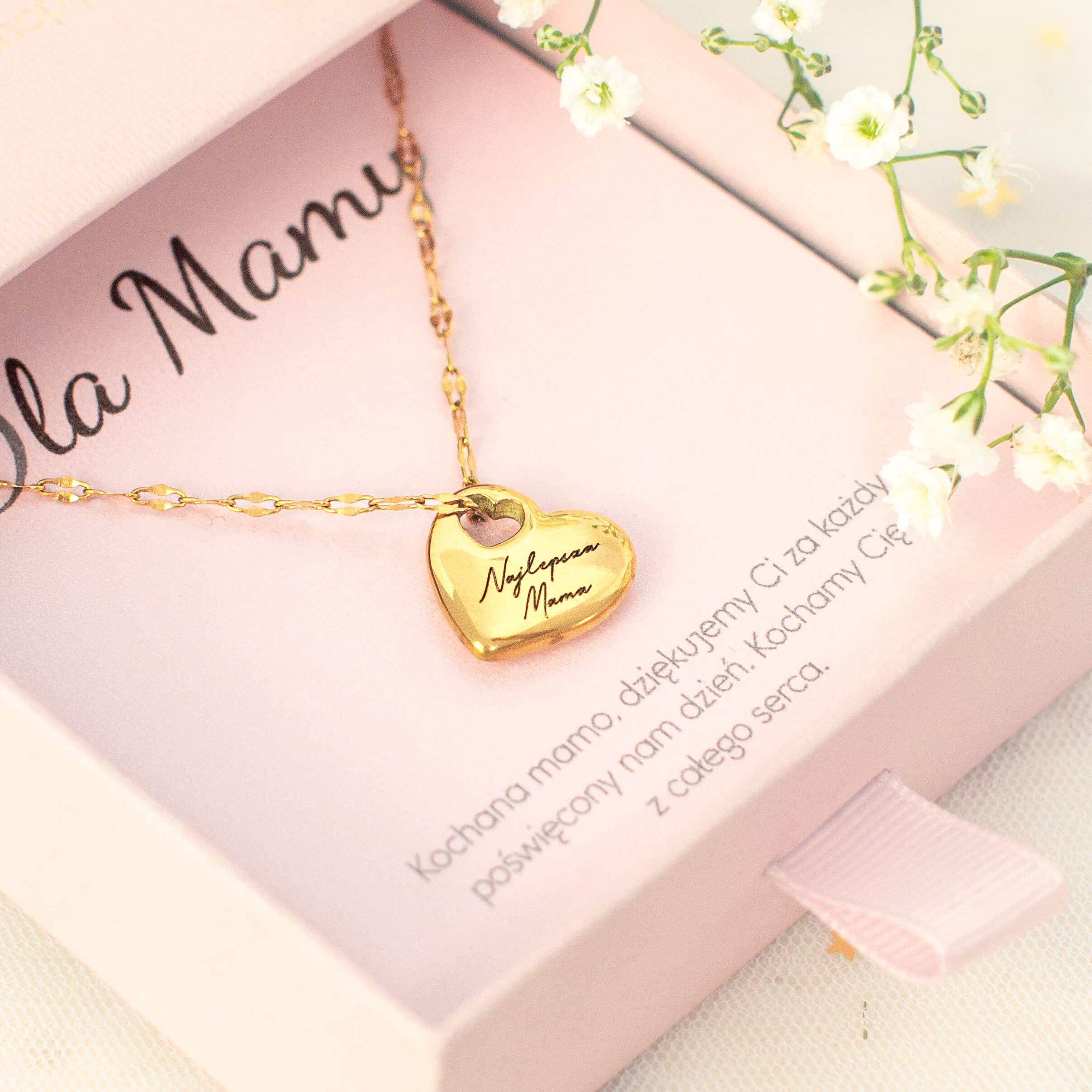 Na zawieszce możesz umieścić dowolny napis – imię, ważne słowo lub dedykację, taką jak „Najlepsza Mama” czy „Dziękuję”. Dzięki temu biżuteria staje się niepowtarzalną pamiątką pełną emocji.